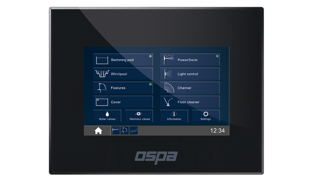 Unmatched efficiency: the intelligent Ospa-BlueControl® system controls and monitors all pool functions, including water quality monitoring and attractions. For optimal networking of all energy consumers, Ospa-BlueControl® can also be integrated with all common bus systems in residential buildings.