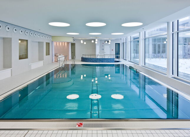 Healing waters and thermal waters have long been important healing tools for treating many ailments and complaints. Underwater massages, medicinal baths and all manner of exercises and applications in exercise pools are indispensable therapies. It's no wonder that the use of water in the healthcare field is subject to the highest possible demands for quality. That's why it goes without saying that Ospa regularly exceeds the requirements for pool water in the healthcare field according to DIN 19643. For this reason, many hospitals and sanatoriums rely on top-level technology from Ospa. Products such as swimming pool and whirlpool filters, heaters, measurement and control technology are perfectly coordinated with each other, thereby creating the optimal prerequisites for hospital and spa pools.