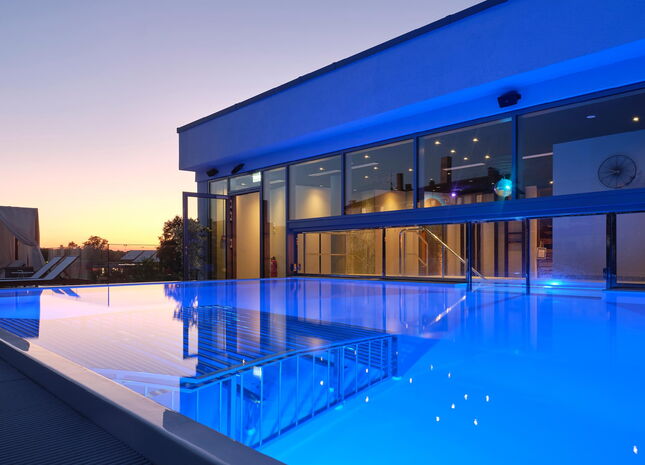 Because energy costs play an important role in a pool, the use of renewable energy and the employment of energy-efficient systems with intelligent control are particularly important. Ospa BlueControl is a control system that allows for numerous energy-saving functions to be controlled, such as roll-top covers, water level lowering and speed-controlled pump operation.