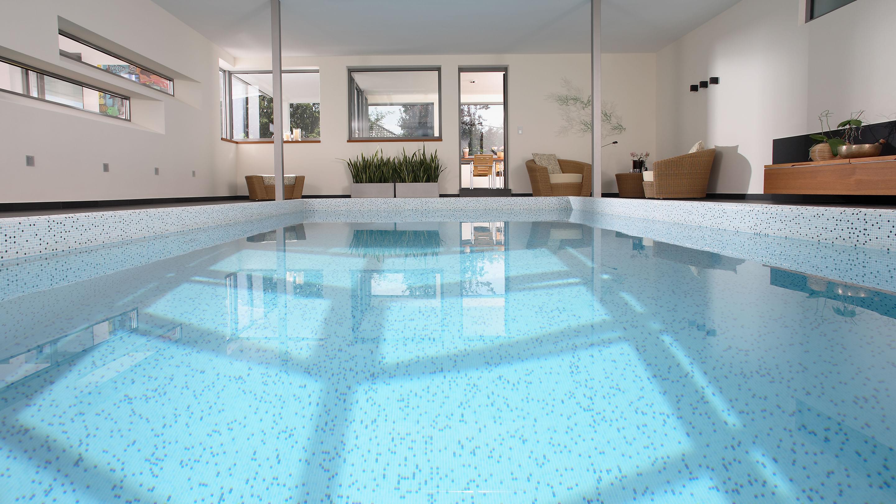 In the evening hours, the room, designed with clear lines, is illuminated by a refined interplay of hall and living room lighting, underwater spotlights and indirect lighting, conjuring moving reflections on the water surface. During the day, the lighting mood moves with the sun, which illuminates the room through the glass-encased roof. Surface such as black stone, marble brush-on plaster and South African slate in the room, as well as the glass mosaic in the pool provide for simple elegance.
