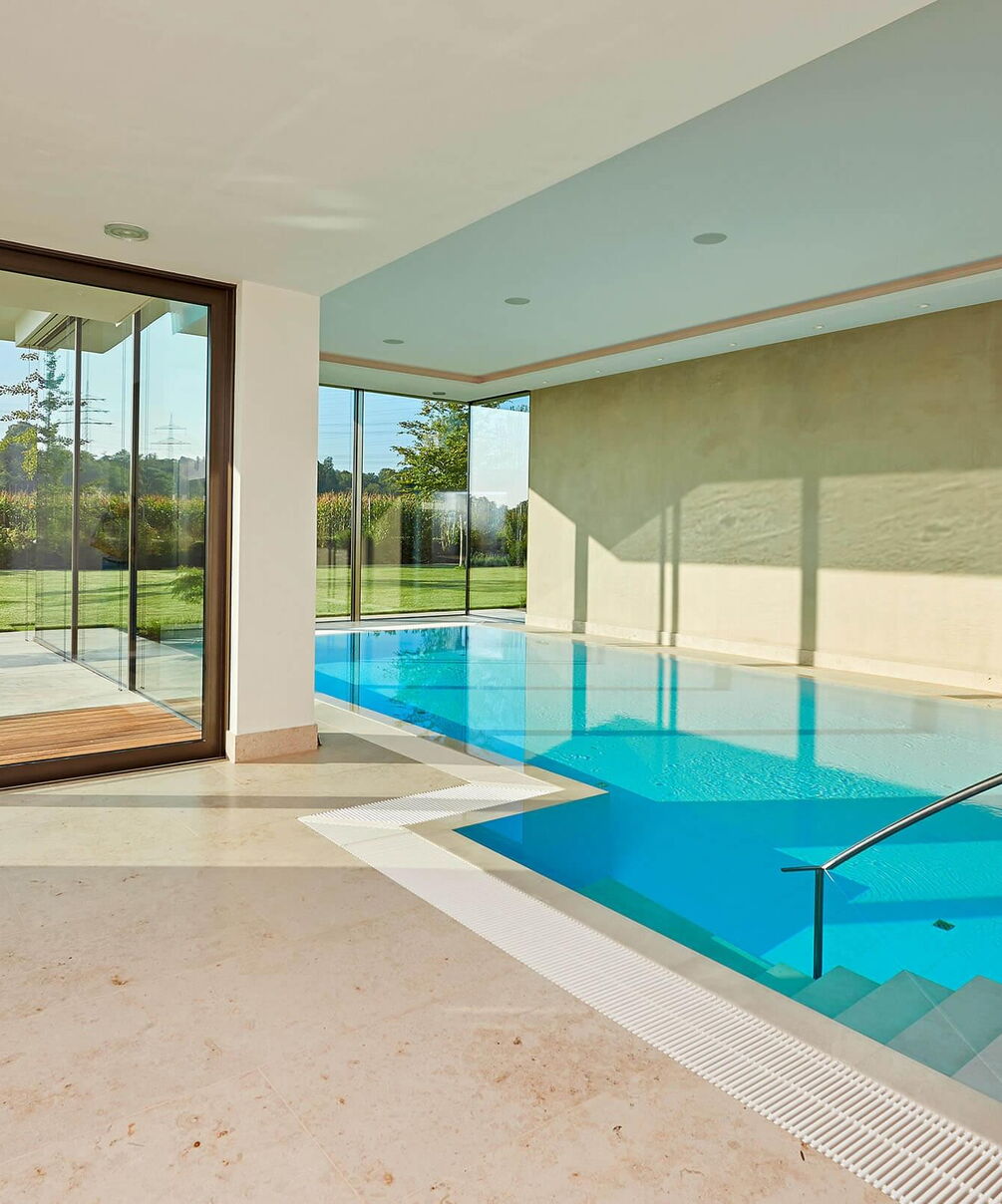 A fully automatic water treatment system from Ospa is employed so that the water quality is always right in the 9 x 4 x 1.5 m concrete pool. Monitoring of the water quality and functions is implemented with the Ospa BlueControl® control. The parameters can be controlled by touch screen and easily corrected as required. Through the use of the highly efficient Ospa EcoClean Filter, the Ospa BlueClear® disinfection uses very few chemicals. As a result, users always find the healthy water they are looking for in the pool.