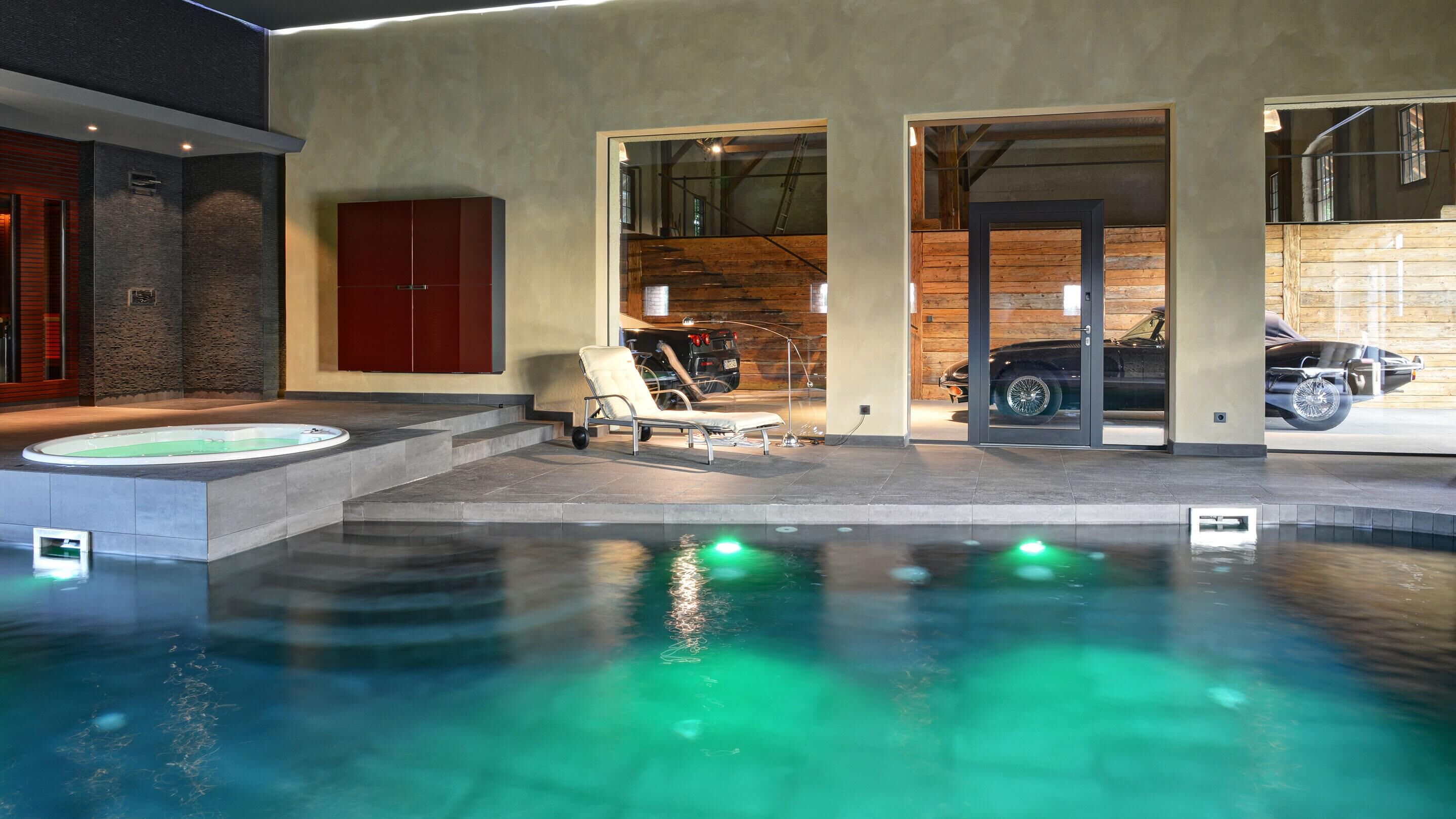 For the builder, this wellness oasis is promoted as a favourite spot. Everything that gives him joy can be found here: the 6 x 9 m tiled pool provides an athletic balance to the workday. A sauna and steam bath bring the circulation into order, and the whirlpool provides relaxation. A large glass façade provides a good view of rare collector's objects: sports cars. It's enough to make you daydream while swimming.