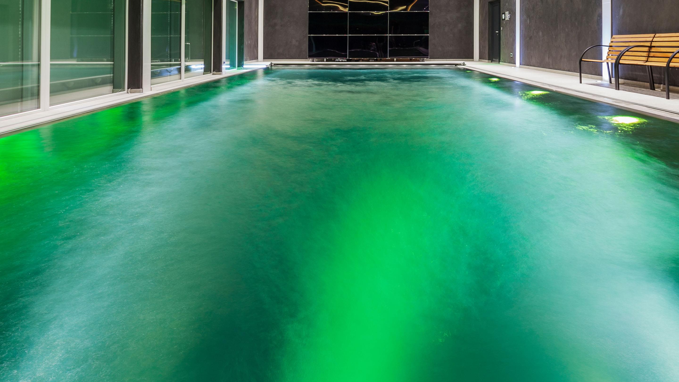 With a counter-current system and hydromassage, the pool is just as suitable for swim training as it is for relaxation. The builders chose Ospa water treatment so that the water quality is always correct. The combination of Ospa sandfilter, BlueClear® water disinfection and BlueControl® control fully automatically provides healthy water that is guaranteed to be pure, odourless and friendly to skin and eyes. The technology is controlled by a touch screen, which not only regulates all the components of the swimming pool. The entire smart home is integrated into the control system via the KNX bus system.