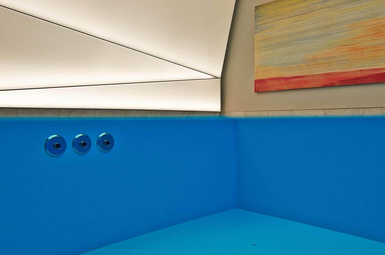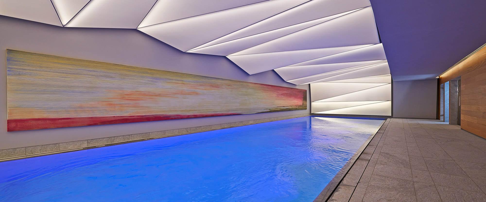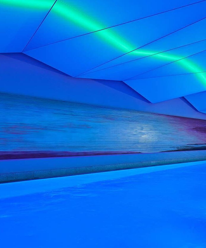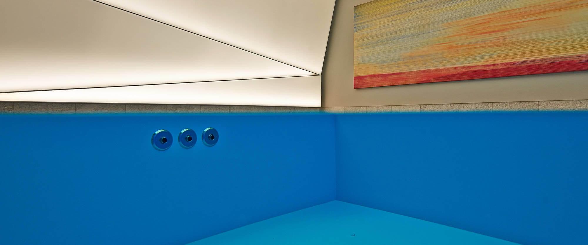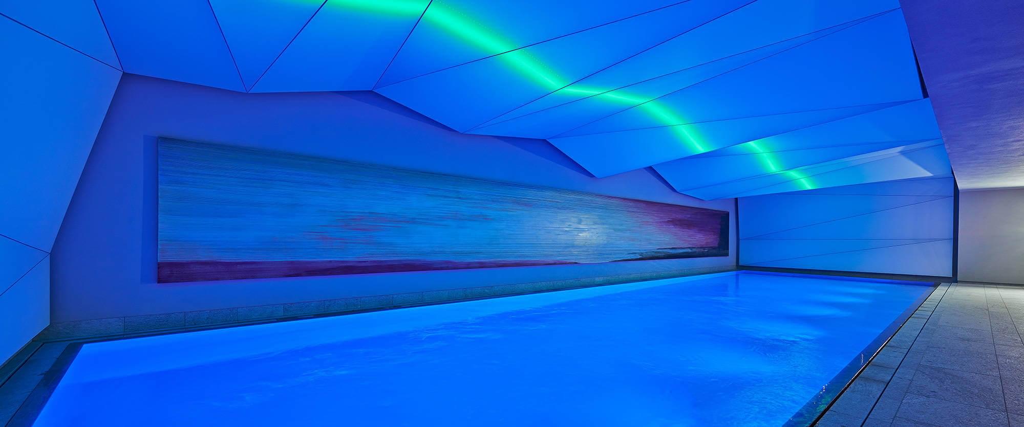 The unqualified star of this extensively renovated swimming pool area is the futuristic-folded ceiling design. It spans the pool like a helix and is reflected in the 17-metre pool to great effect.