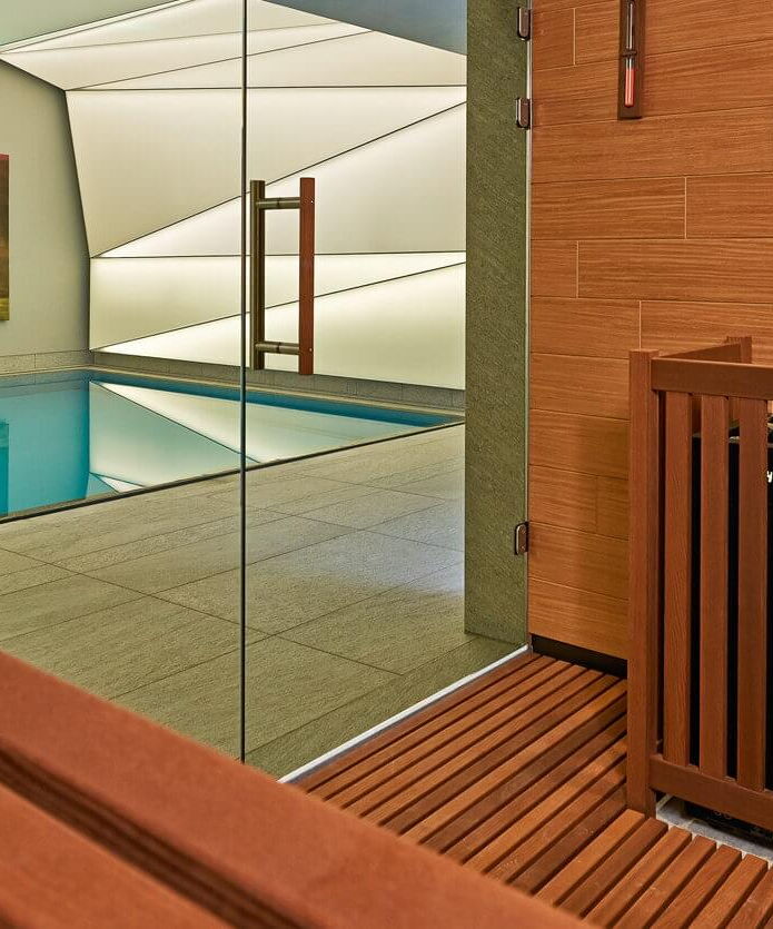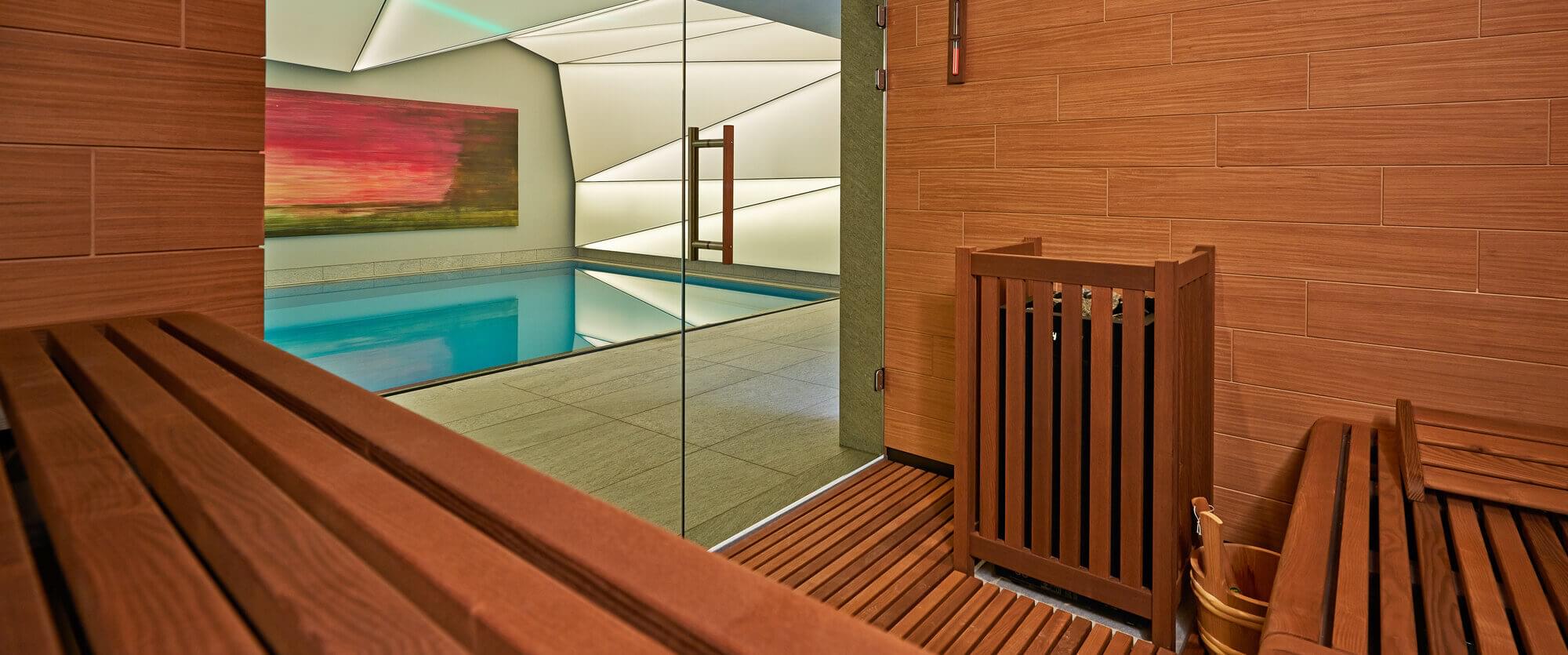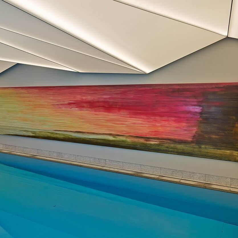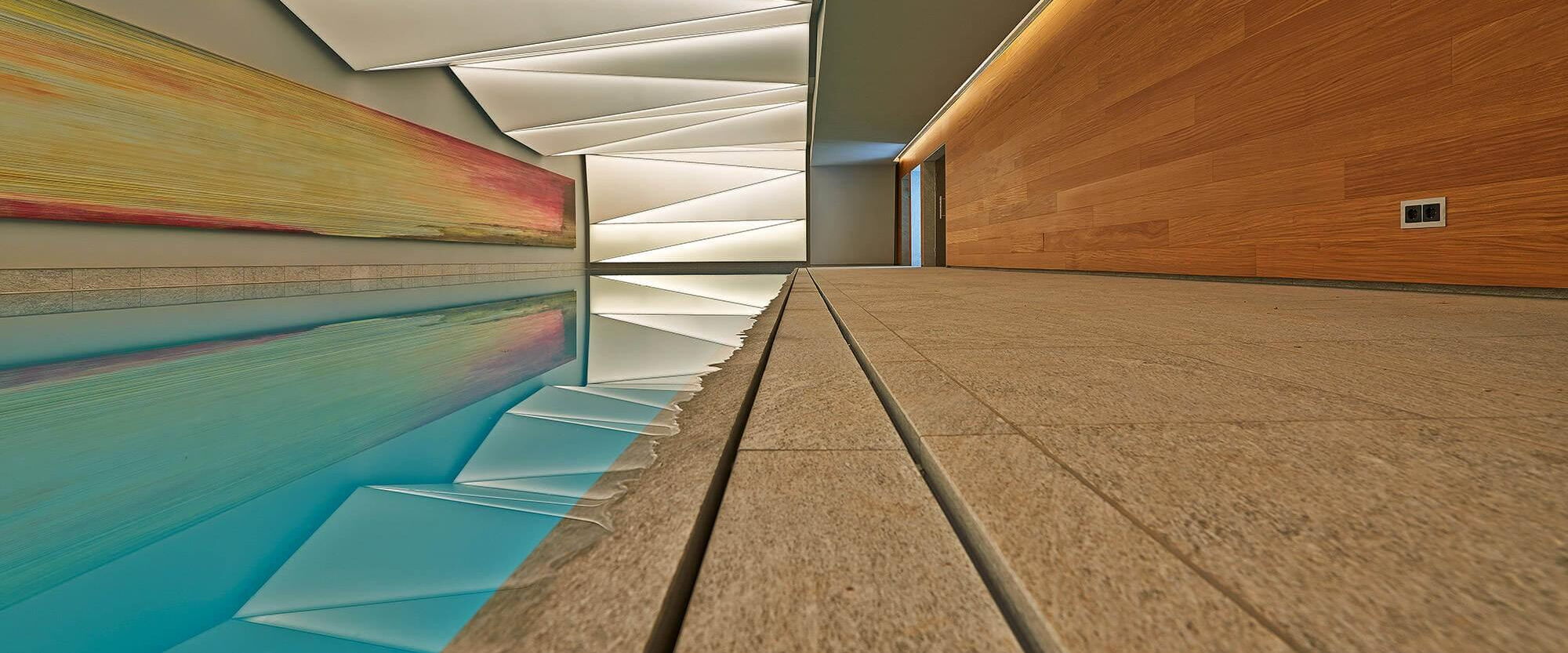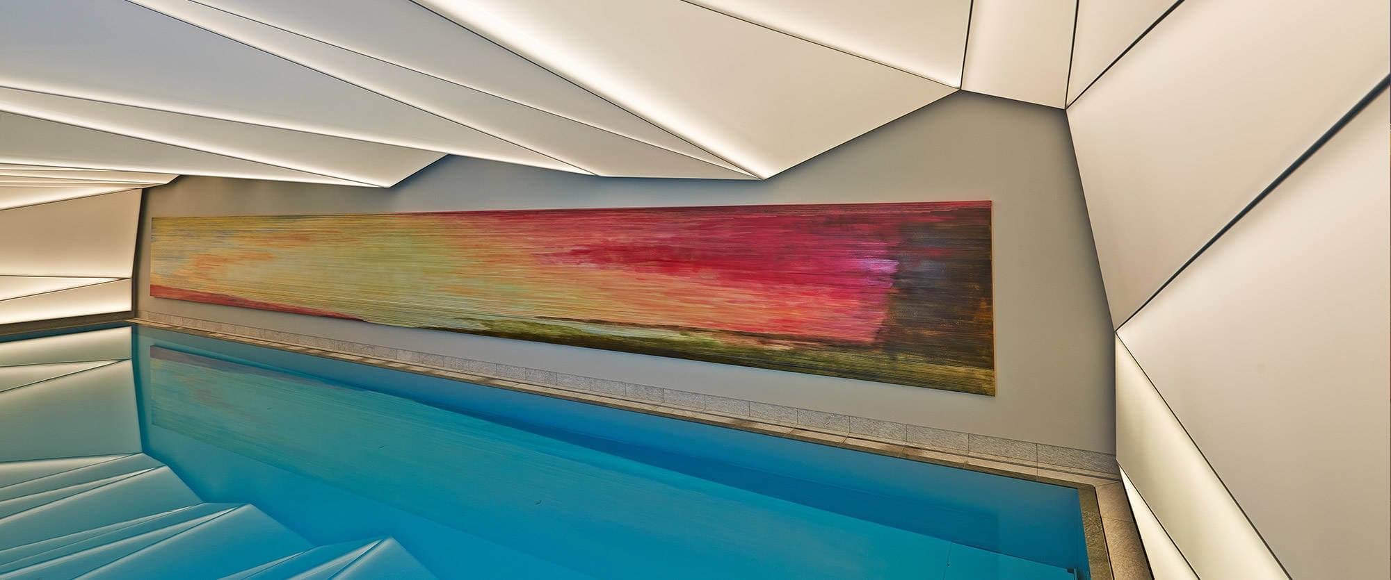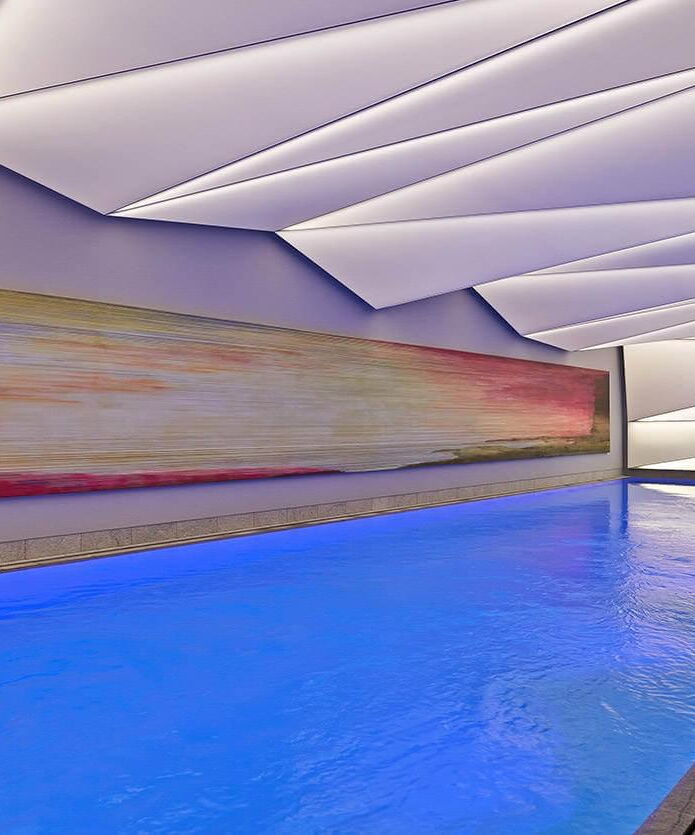 The unqualified star of this extensively renovated swimming pool area is the futuristic-folded ceiling design. It spans the pool like a helix and is reflected in the 17-metre pool to great effect.