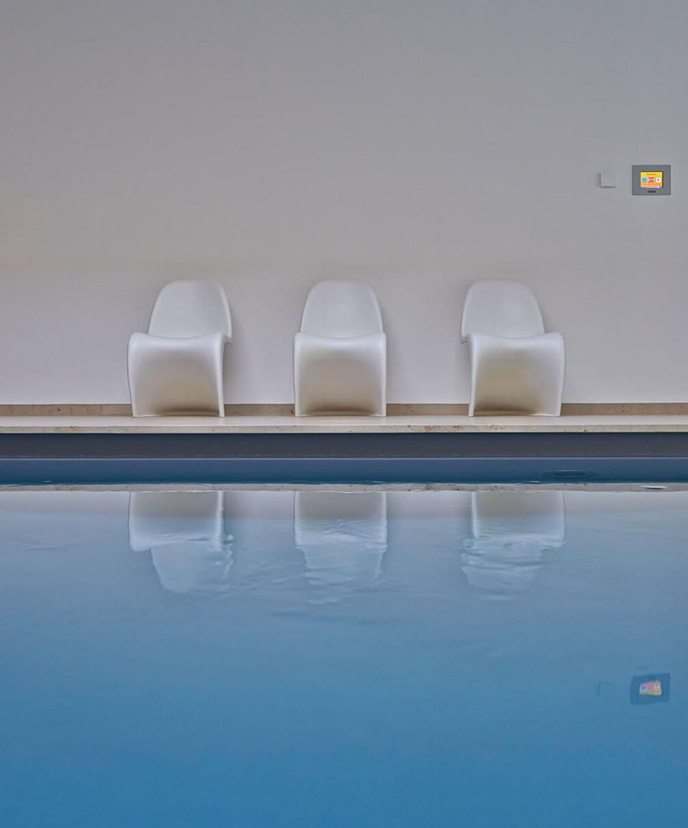 The large indoor pool was designed as the central component of the L-shaped building and is directly adjacent to the living room area. A large glass façade opens the room to the backyard, while bright natural stone sets cosy accents inside. Effectively placed underwater spotlights immerse the pool in cool blue during the day, while warm purple hues dominate at night.