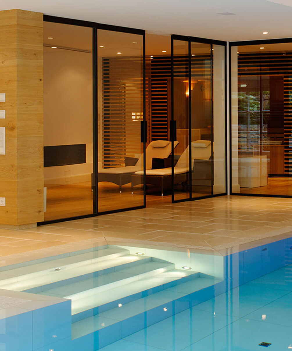 A wellness temple as an overall work of art: like a modern museum building, a light-flooded space spans the nearly square swimming pool, in which the water sparkles turquoise-blue..