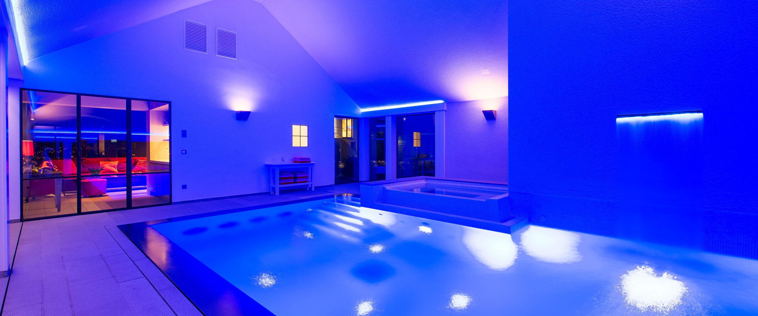 Dive into fantastic and wonderfully coloured swimming pool water and experience moments of very special atmosphere while you glide through the premium pool water in your perfect swimming pool. In the darkness and twilight, it's "Lights off, spotlight on."