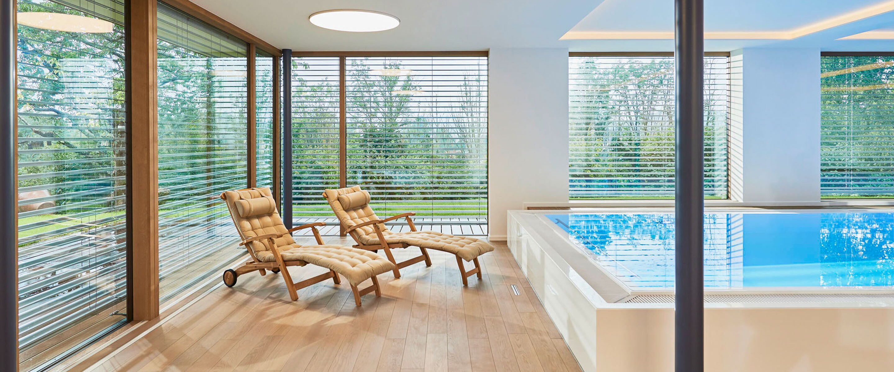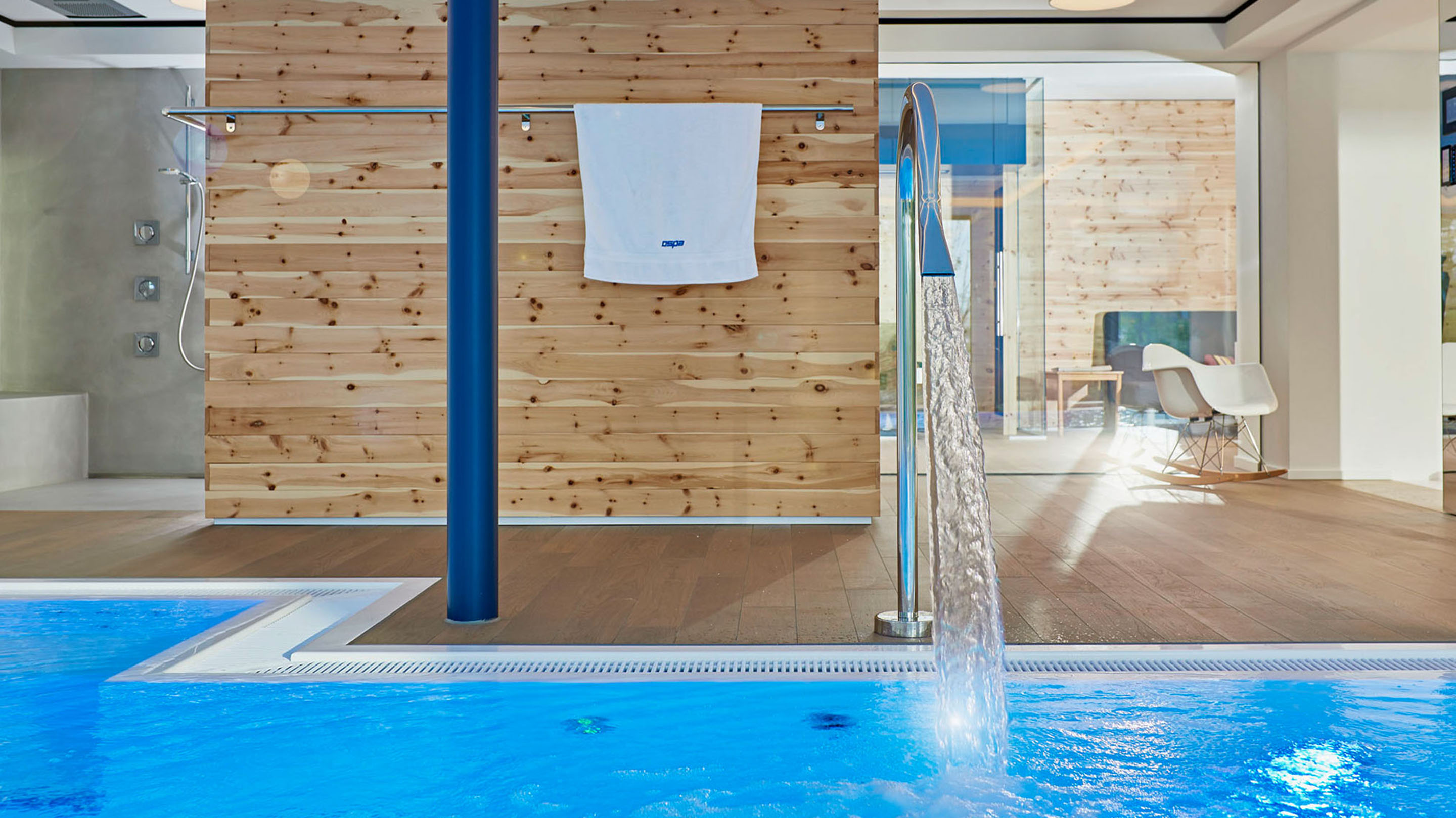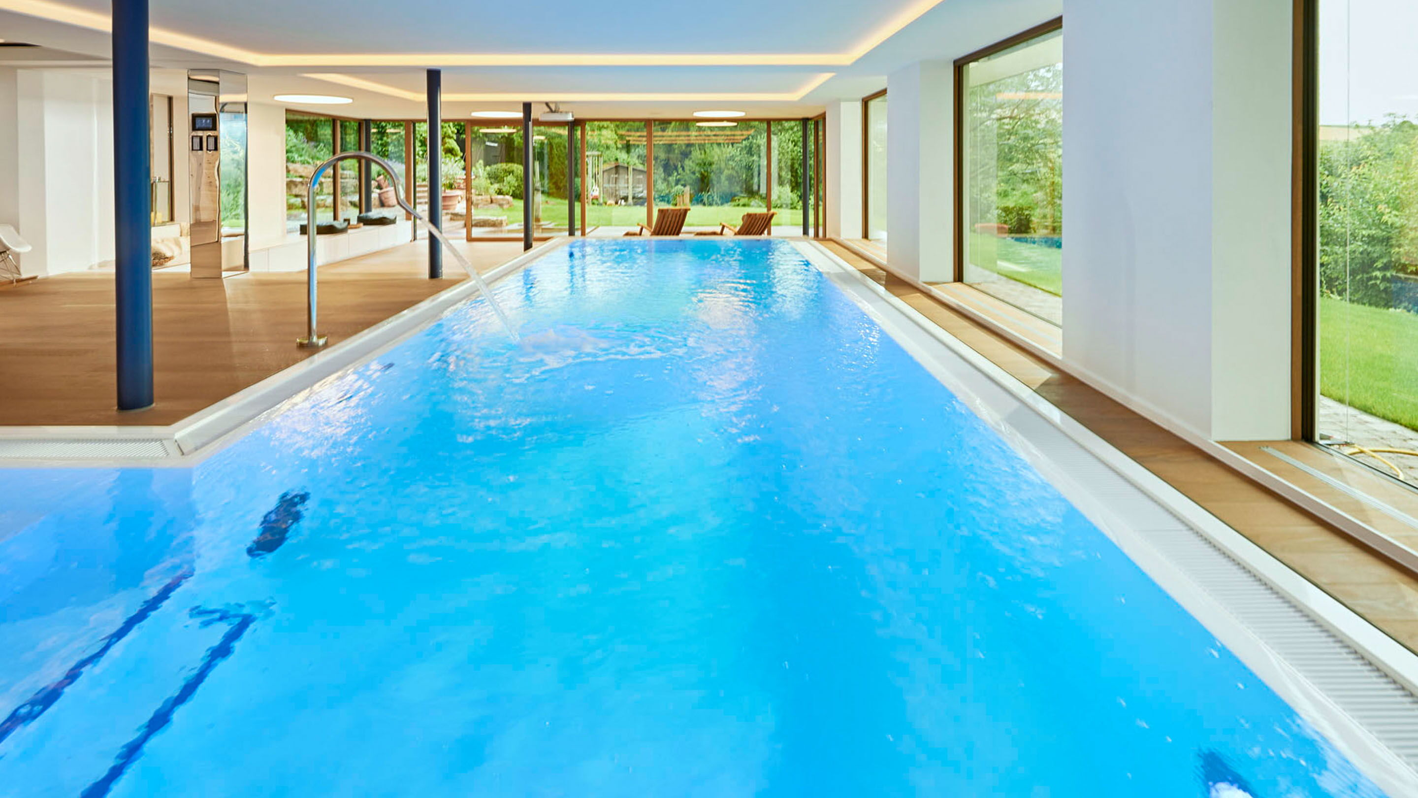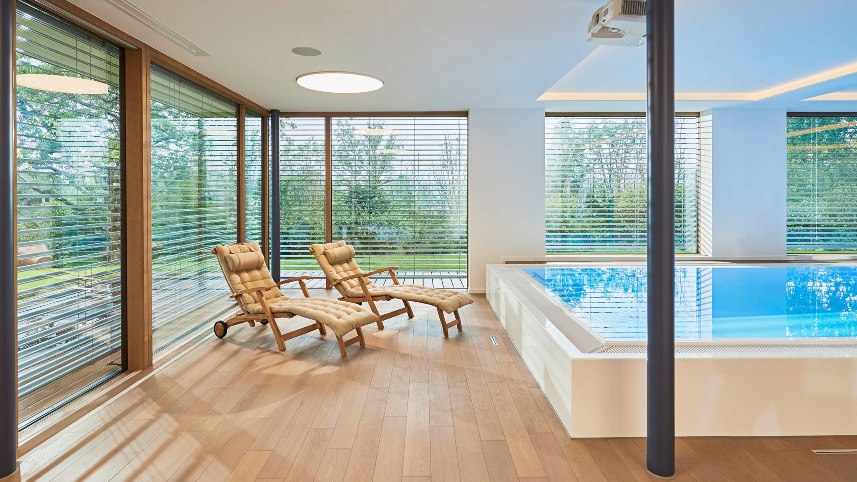 This wellness oasis for body and spirit not only serves for relaxation; the elongated pool is also inviting for athletic swimming.