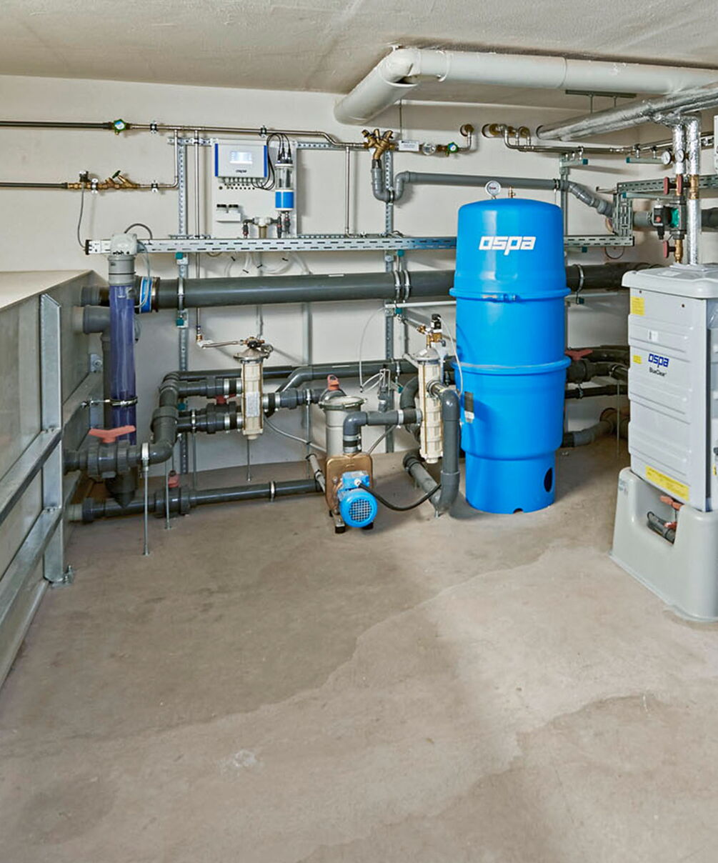 One leads to the other here: large reflex zones, reclining to relax and a superior pool which connects athleticism and relaxation. And while the stress of the day dissolves under the beneficial massage of the neck cascade, your gaze slides out across the large backyard. And once you're recharged with energy, the athletic challenge of the counter-current system is waiting. Meanwhile, the crystal-clear, skin and eye-friendly swimming pool water is provided by the reliable Ospa swimming pool technology with filtration, treatment and the intelligent Ospa BlueControl® IV Web control.