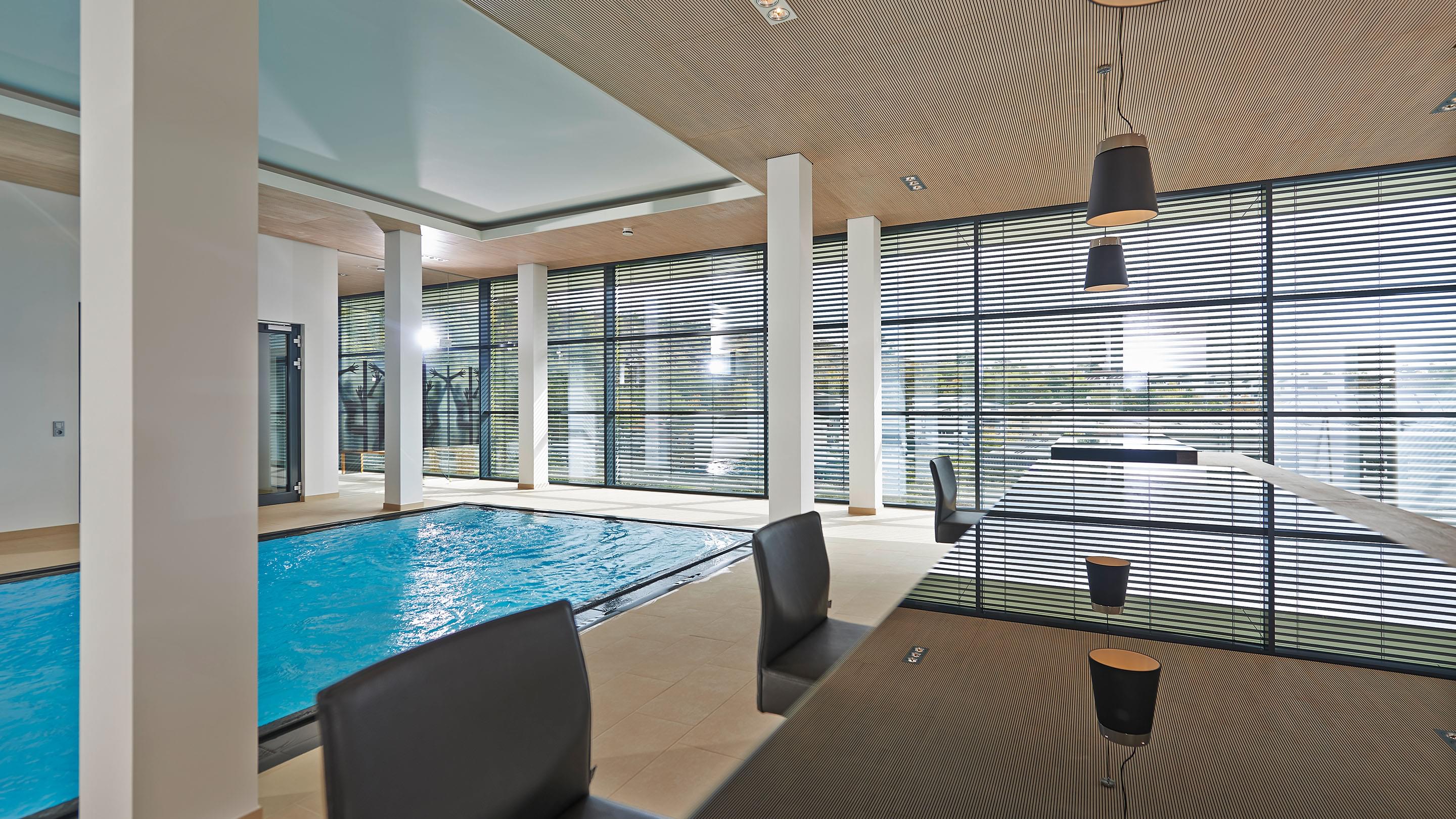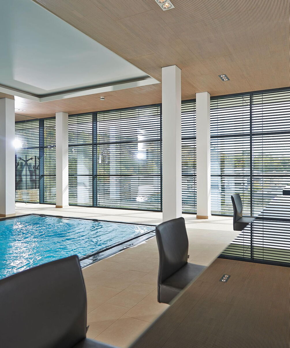 Because the swimming pool is used as a wellness and living room, comfortable room air without chlorine odour is essential. The solution: Ospa Superfilter technology. A large active carbon filter layer retains not only filterable but also dissolved organic contaminants, such as odour and taste particles, through adsorption. A fully automatic Ospa BlueClear® disinfection system is responsible for disinfection of the swimming water. The result: oxygen-rich and hygienic swimming water.