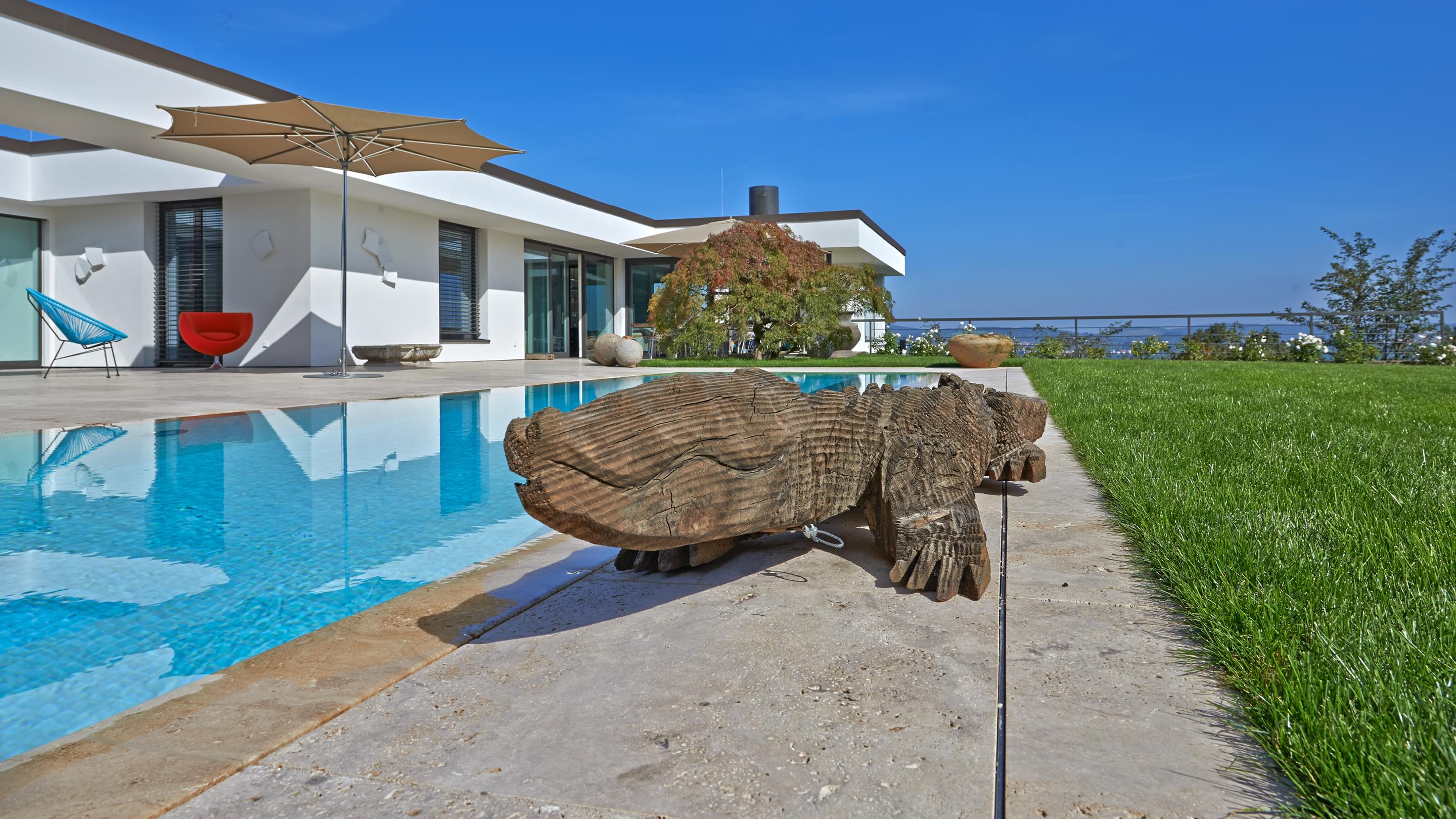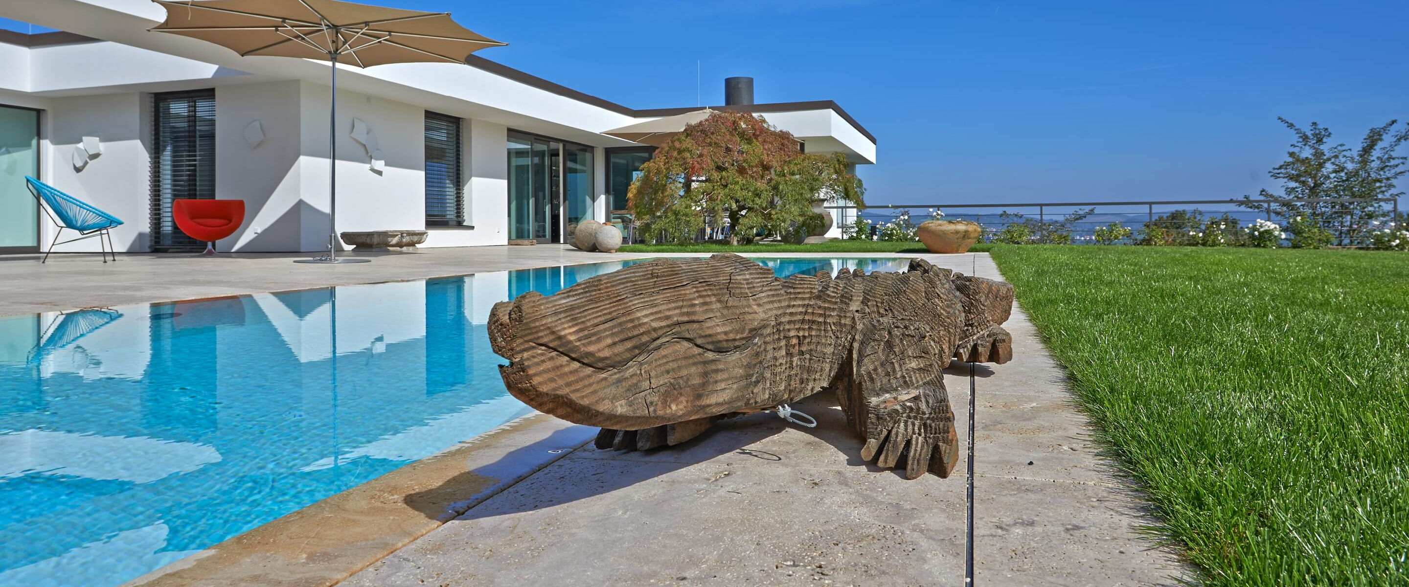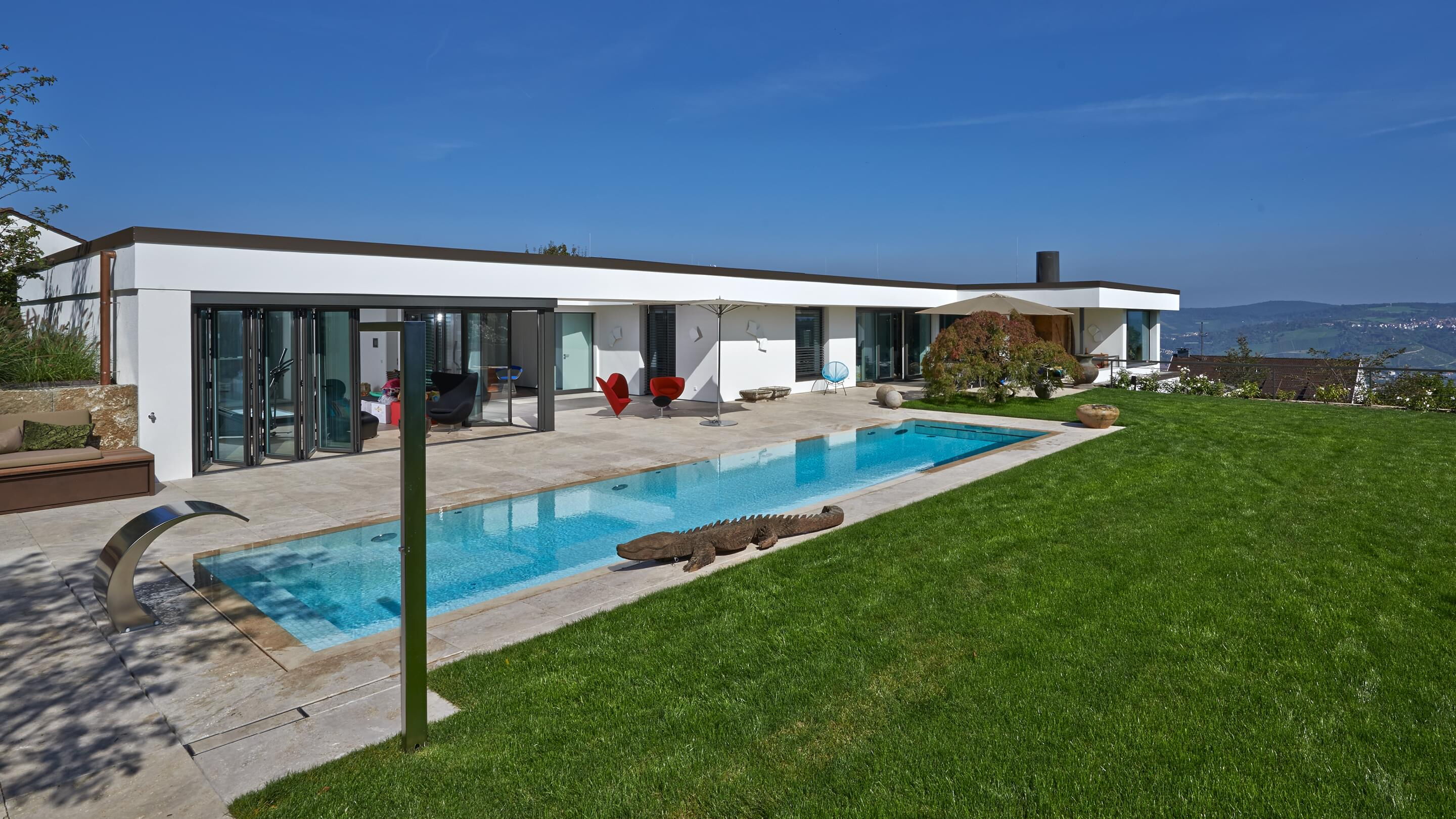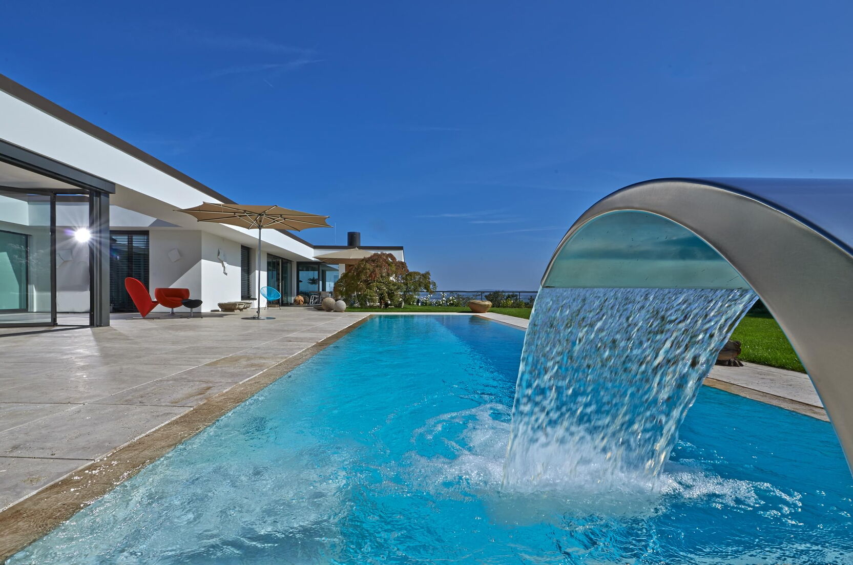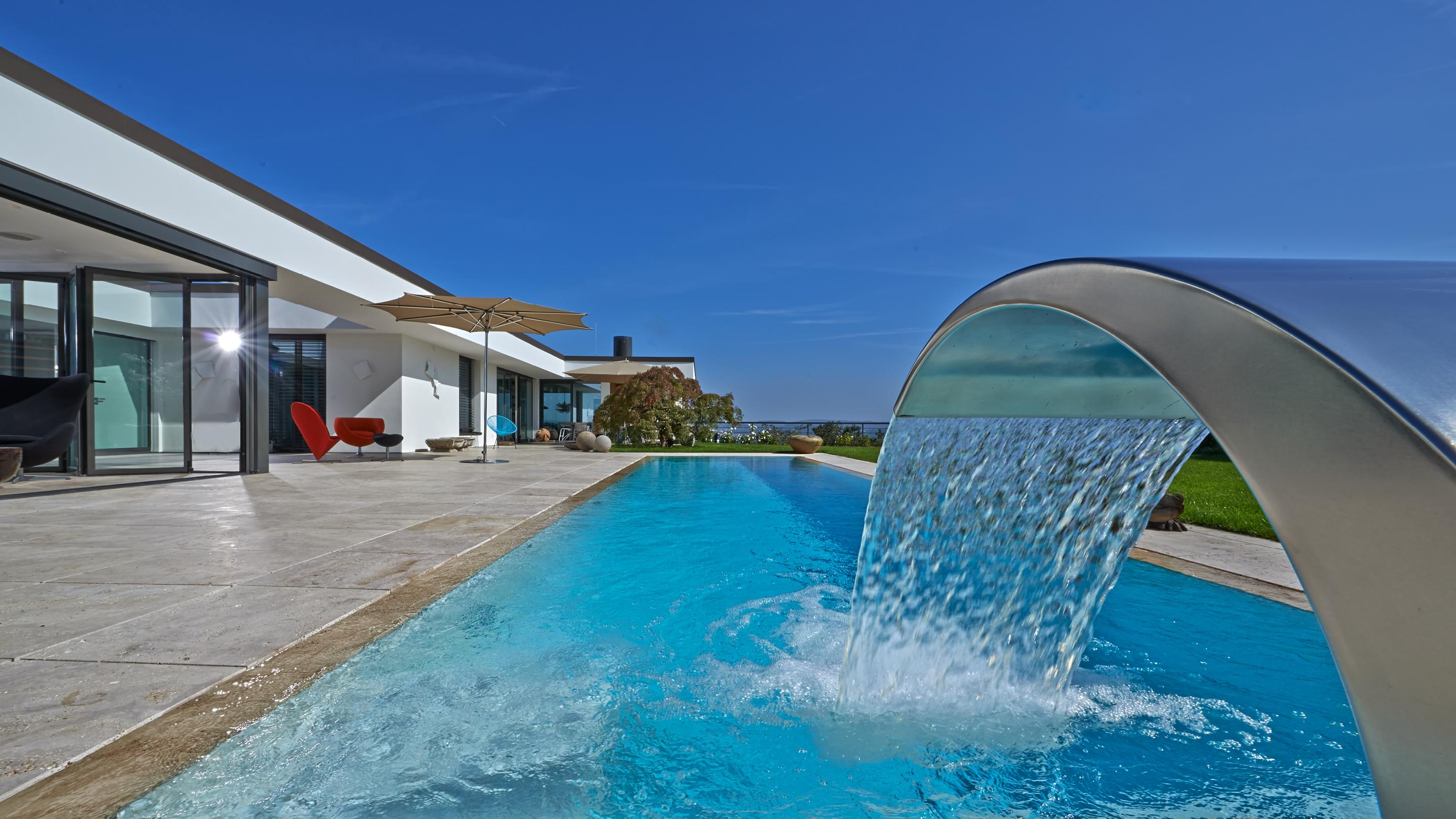 The energy efficiency of the system was particularly important to the builder, and is a true highlight due to a heat exchanger and the solar collectors. This is also true for the control system: using the cutting-edge Ospa BlueControl® III Web, the owner can comfortably control the pool technology from a tablet or smartphone and can check the water parameters from anywhere in the world. In addition, Ospa Filter EcoClean and Ospa BlueClear® provide for spring-like and eye-friendly water quality.
