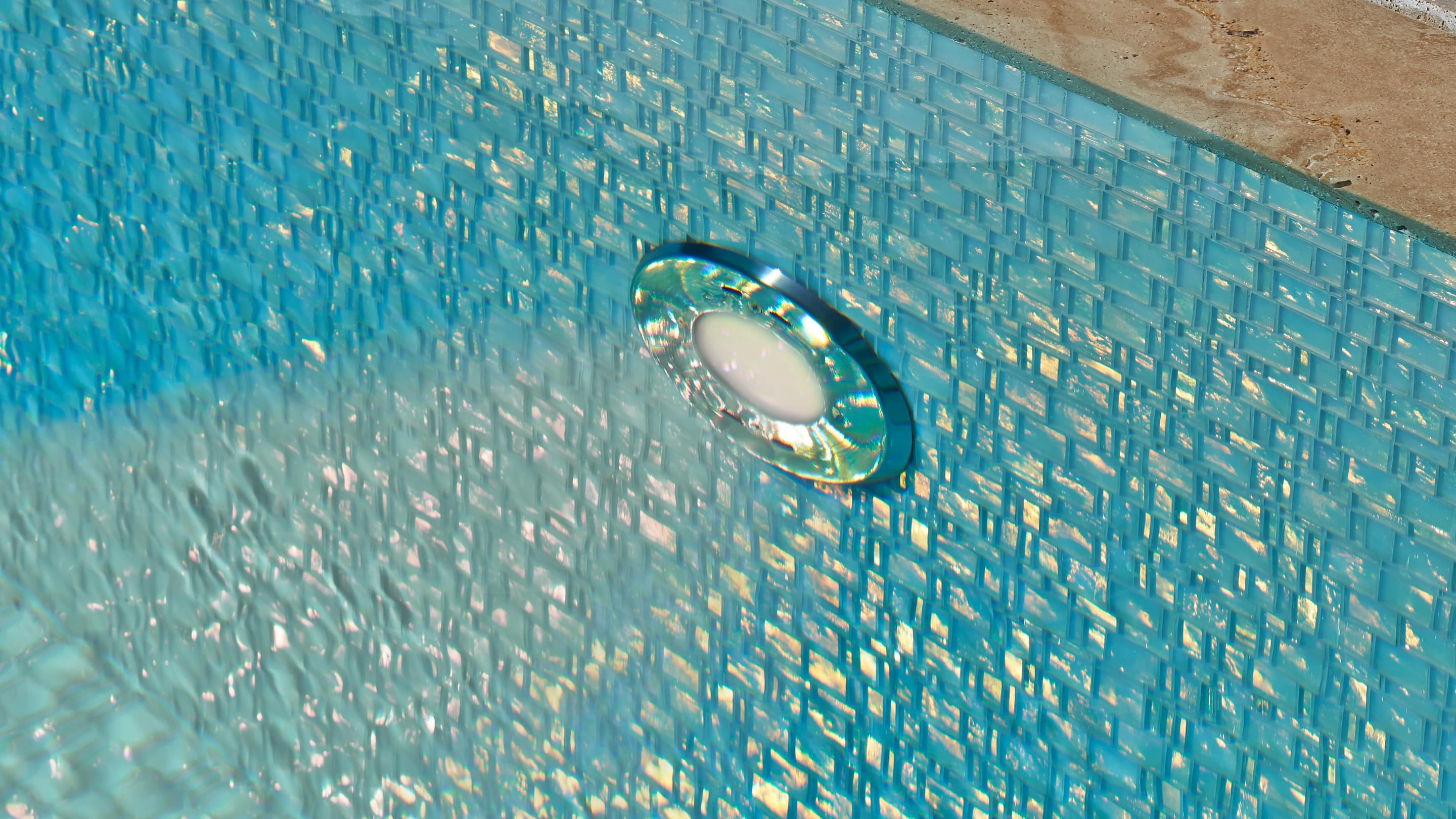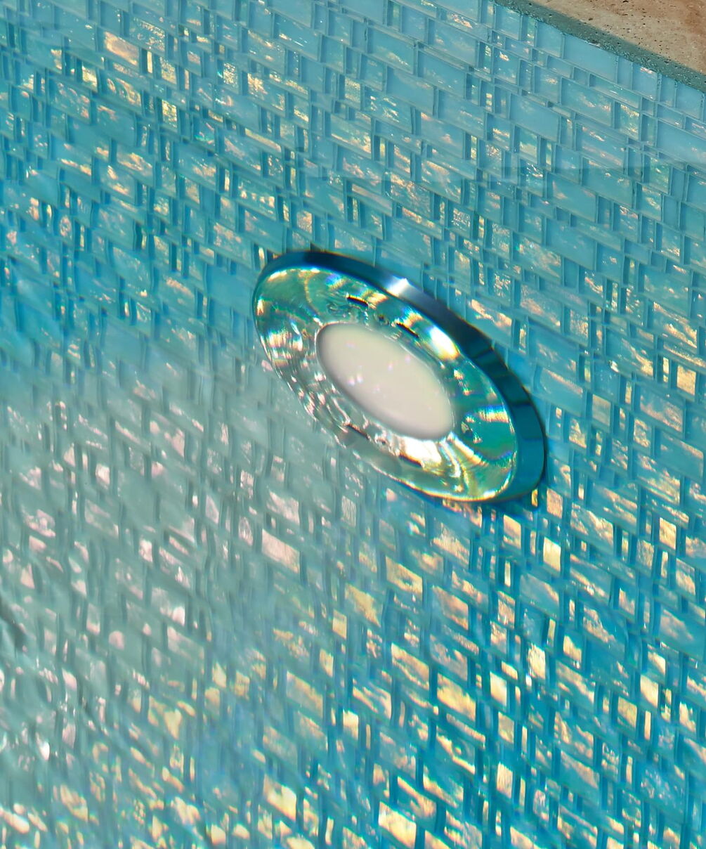 Small glass mosaic tiles made of mother-of-pearl provide for an impressive effect in this 12 x 3 pool.