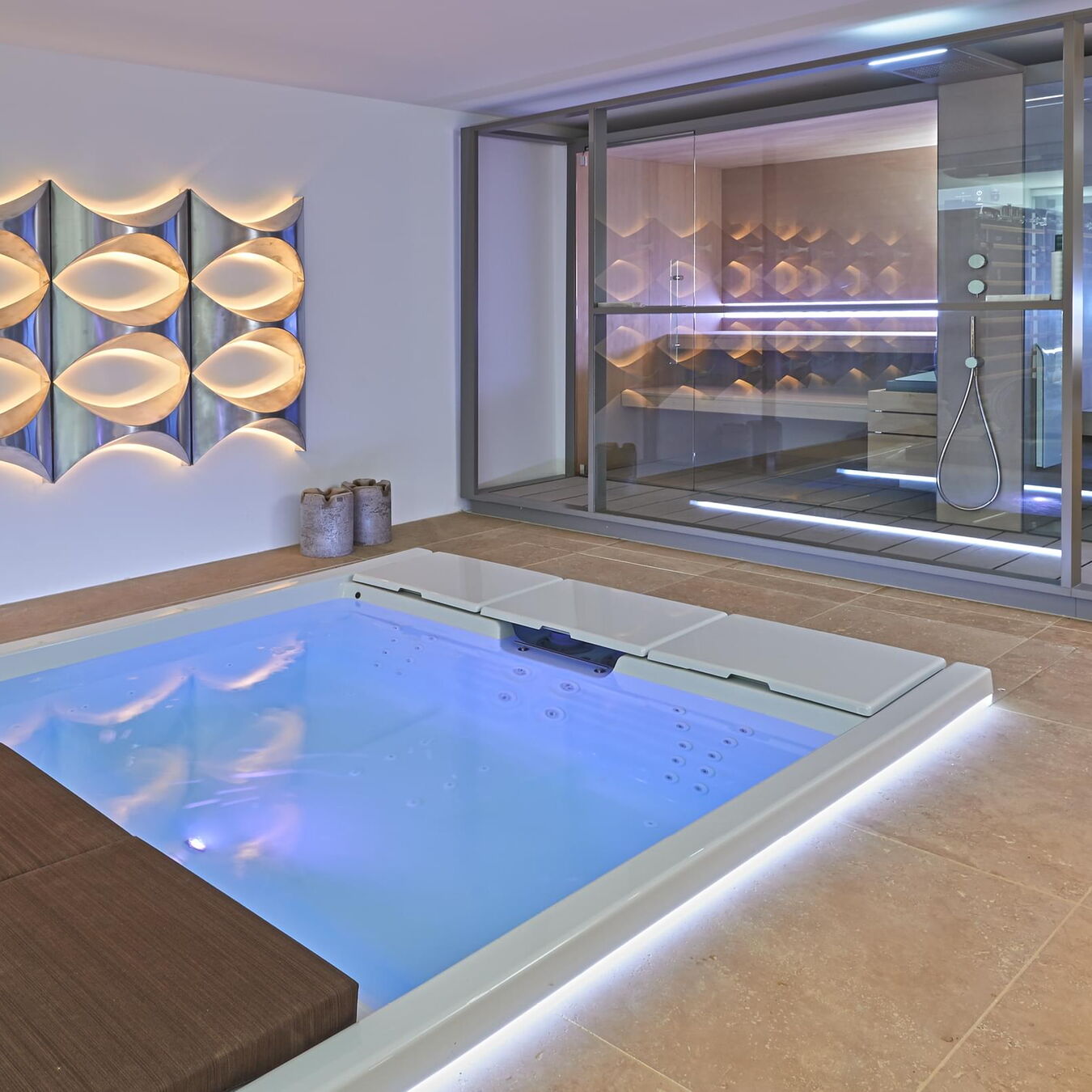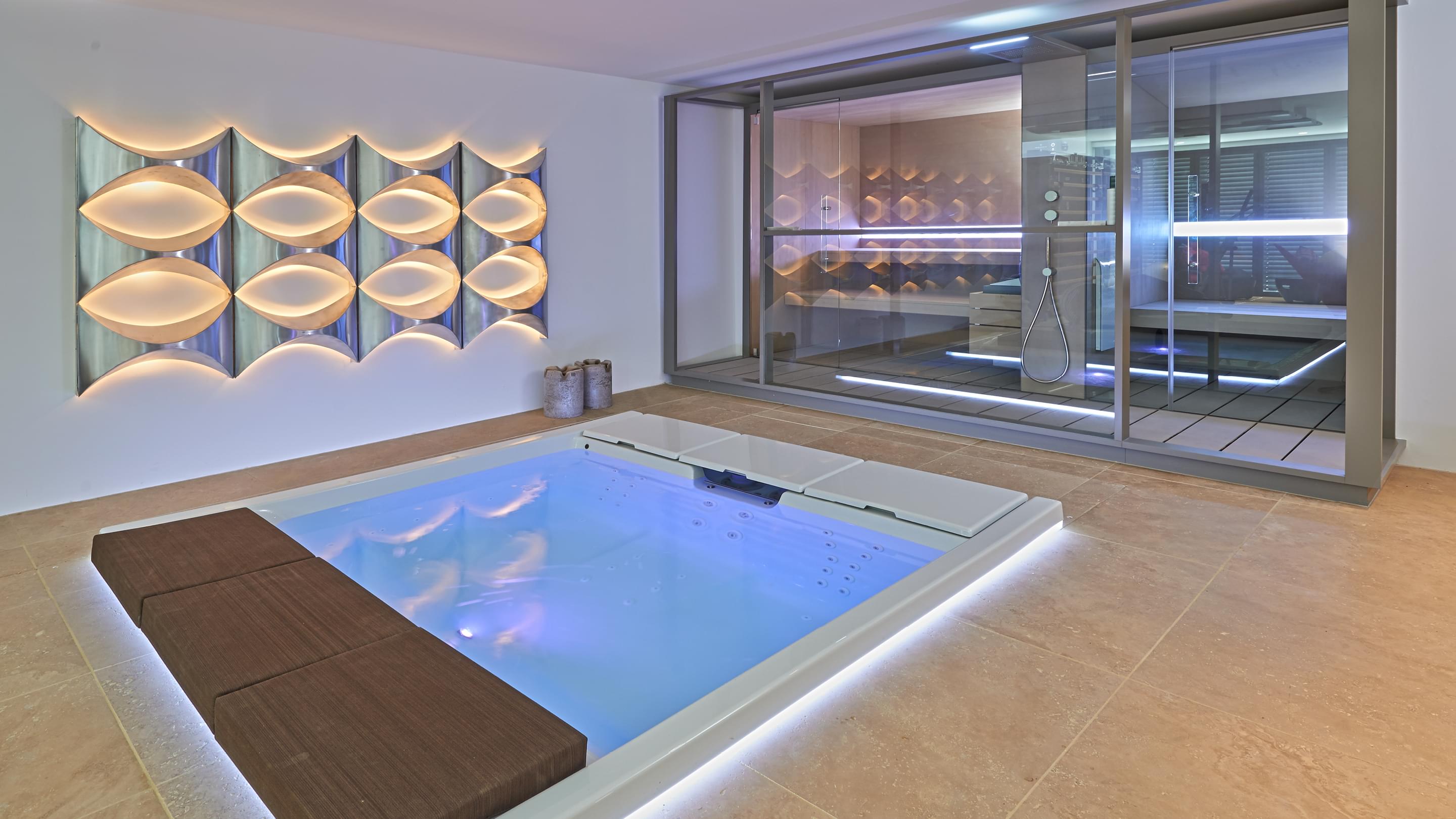 A counter-current system was installed for the required action and fitness, while a neck cascade and a quadruple strength hydromassage is available for subsequent relaxation. A whirlpool is available in the interior of the renovated luxury bungalow for an optimal wellness experience, even on cold days.