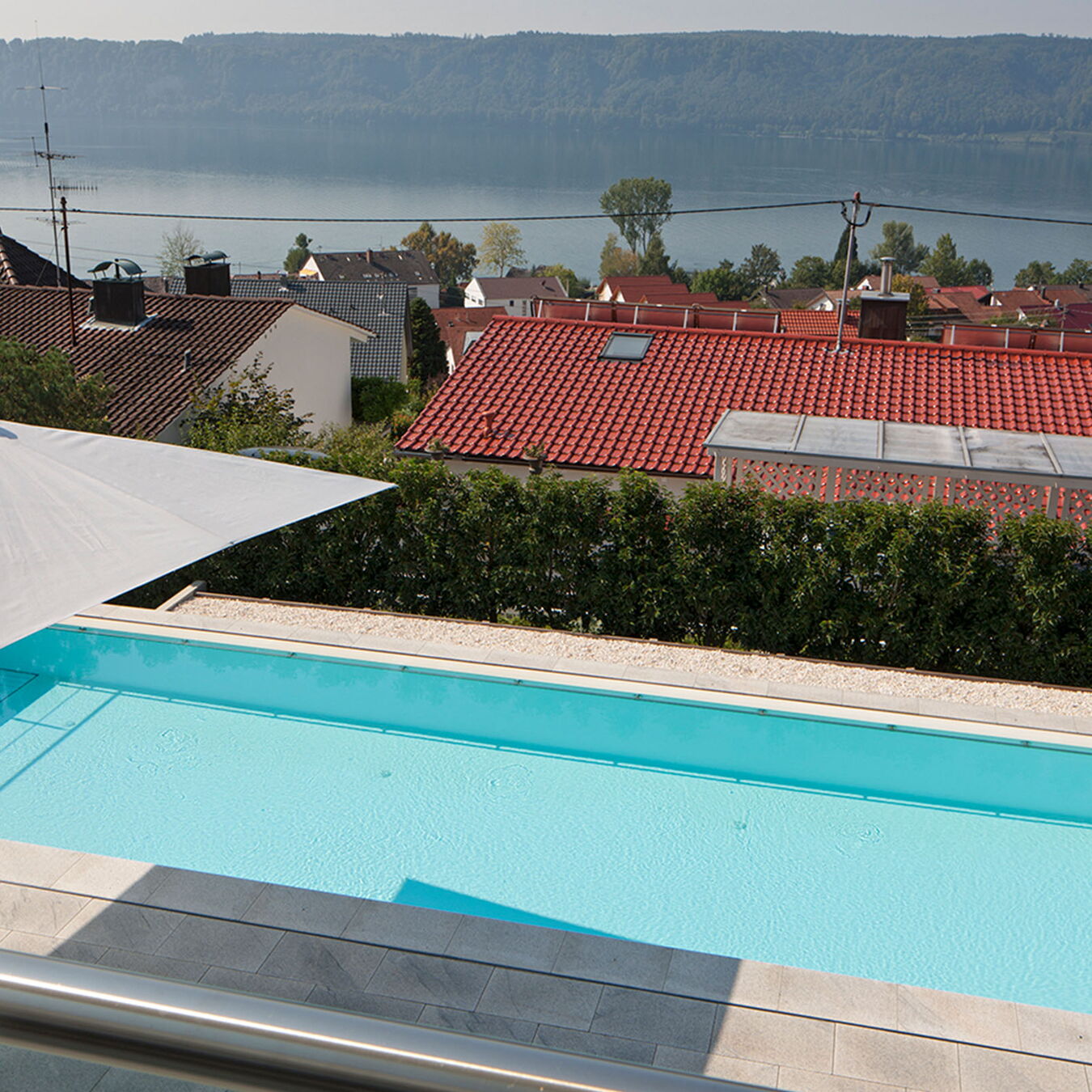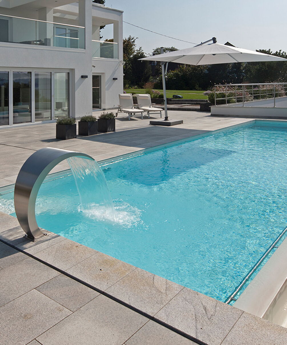 When designing their new house, the builders decided to make their dream a reality: in order to be able to swim comfortably and carefree the entire year round, they built both an outdoor and an indoor pool. The indoor pool, with overflow technology, is located in the basement level of the house. The film-lined pool measures 4 x 8 m and is equipped with the same features as the outdoor pool. The Ospa PowerSwim® counter-current system can be individually programmed and can be coordinated with a personalised training plan. Optimal relaxation after working out is provided by the Ospa hydromassage. In addition, there are underwater spotlights from Ospa in both pools, along with invigorating waterfalls. The indoor pool is easily controlled by Ospa BlueControl®.
