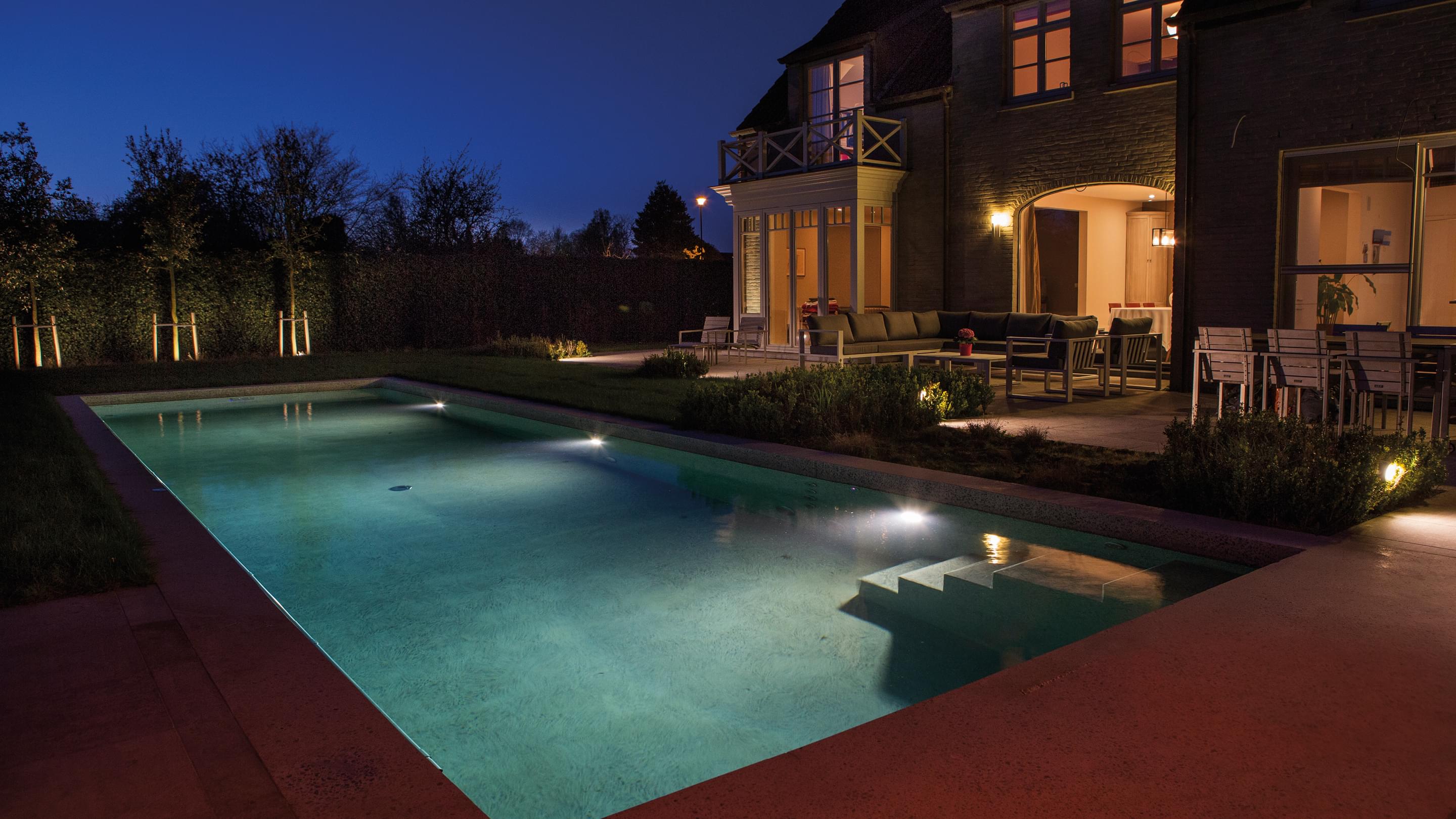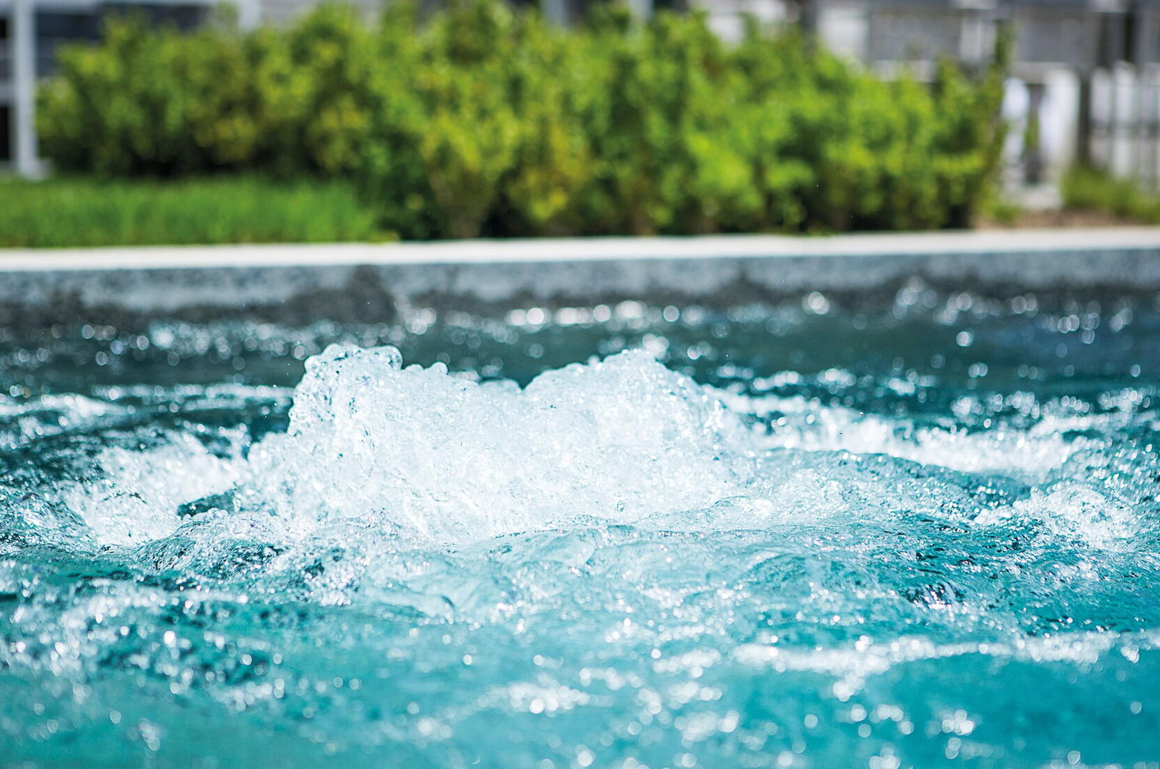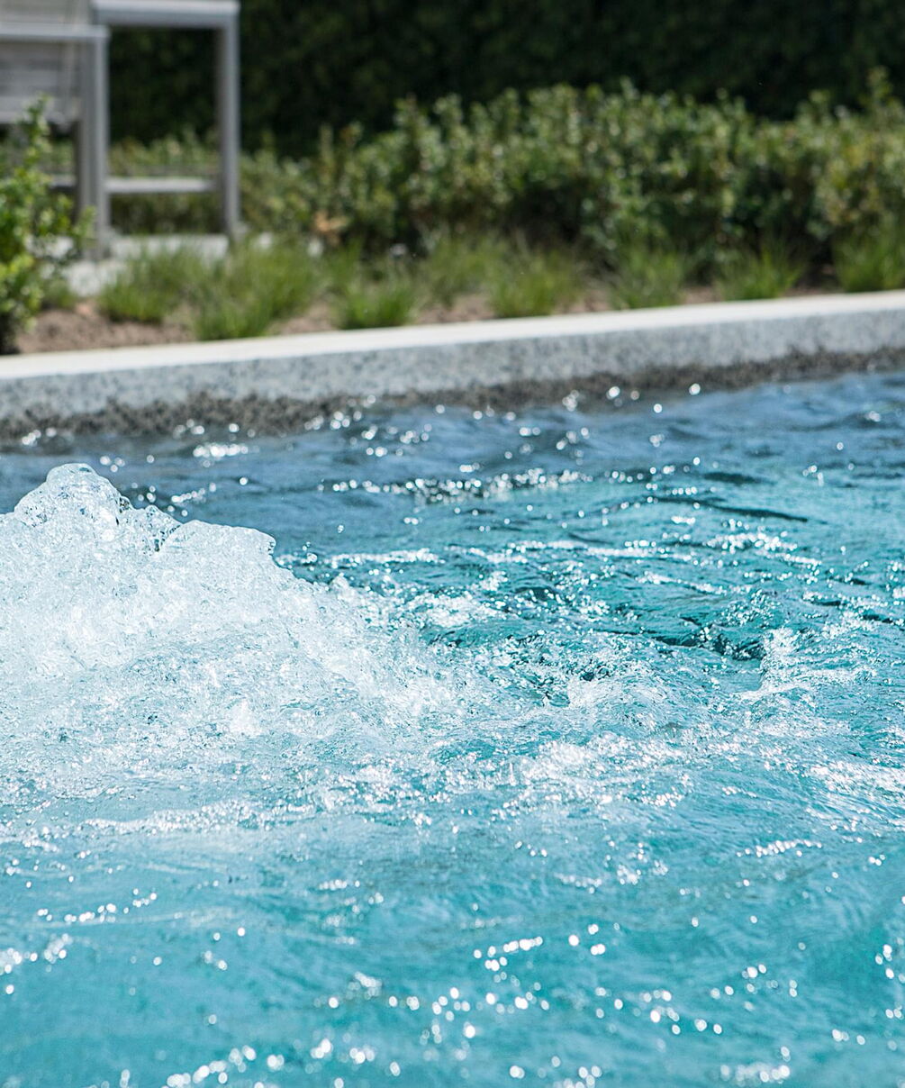 In the centre of the pool, an Ospa Wild Spring recessed in the floor beckons. The pool edges, simulating granular terrazzo, are also full of the latest technology: a counter-current system challenges athletic swimmers at the end. Four vertically arranged jets of an Ospa hydromassage 4 provide pleasant back sensations. And, at night, three Ospa LED RGB+white underwater spotlights provide atmospheric colour effects.