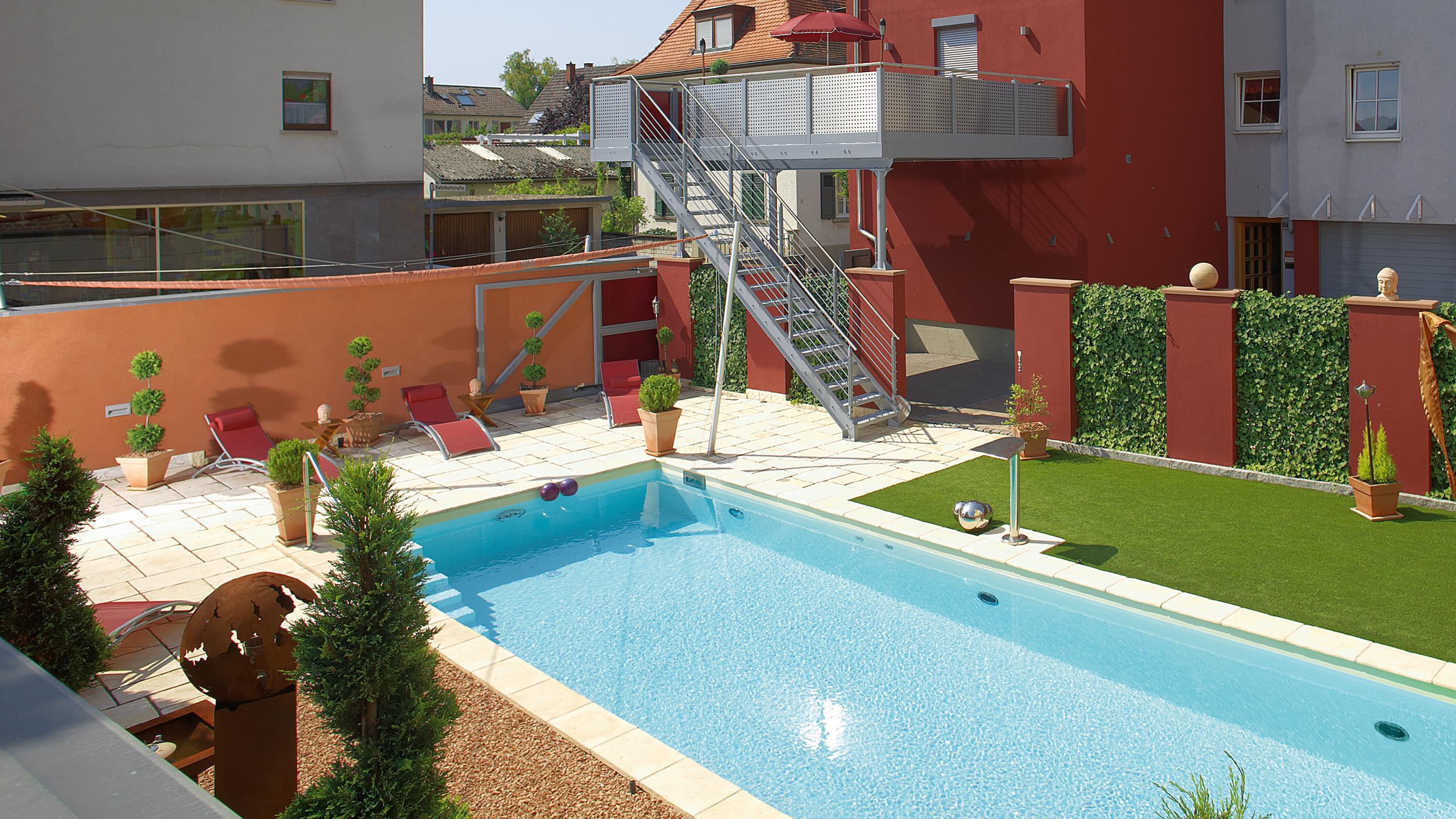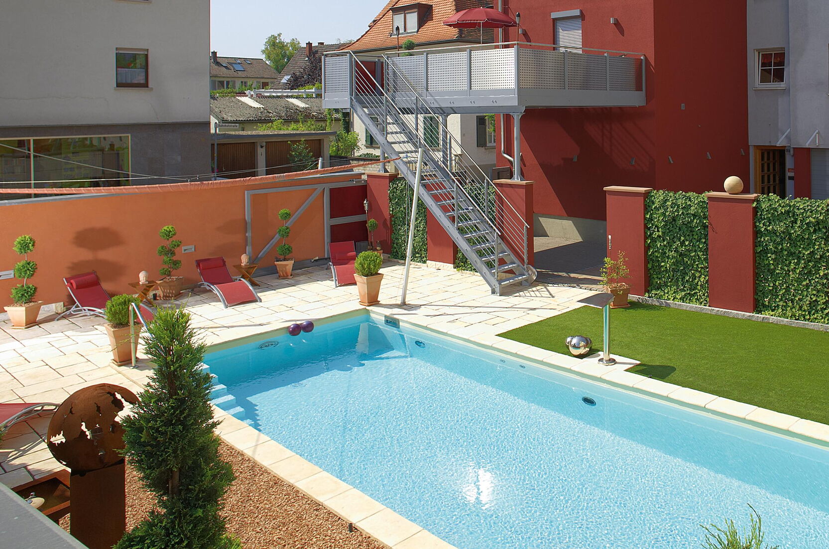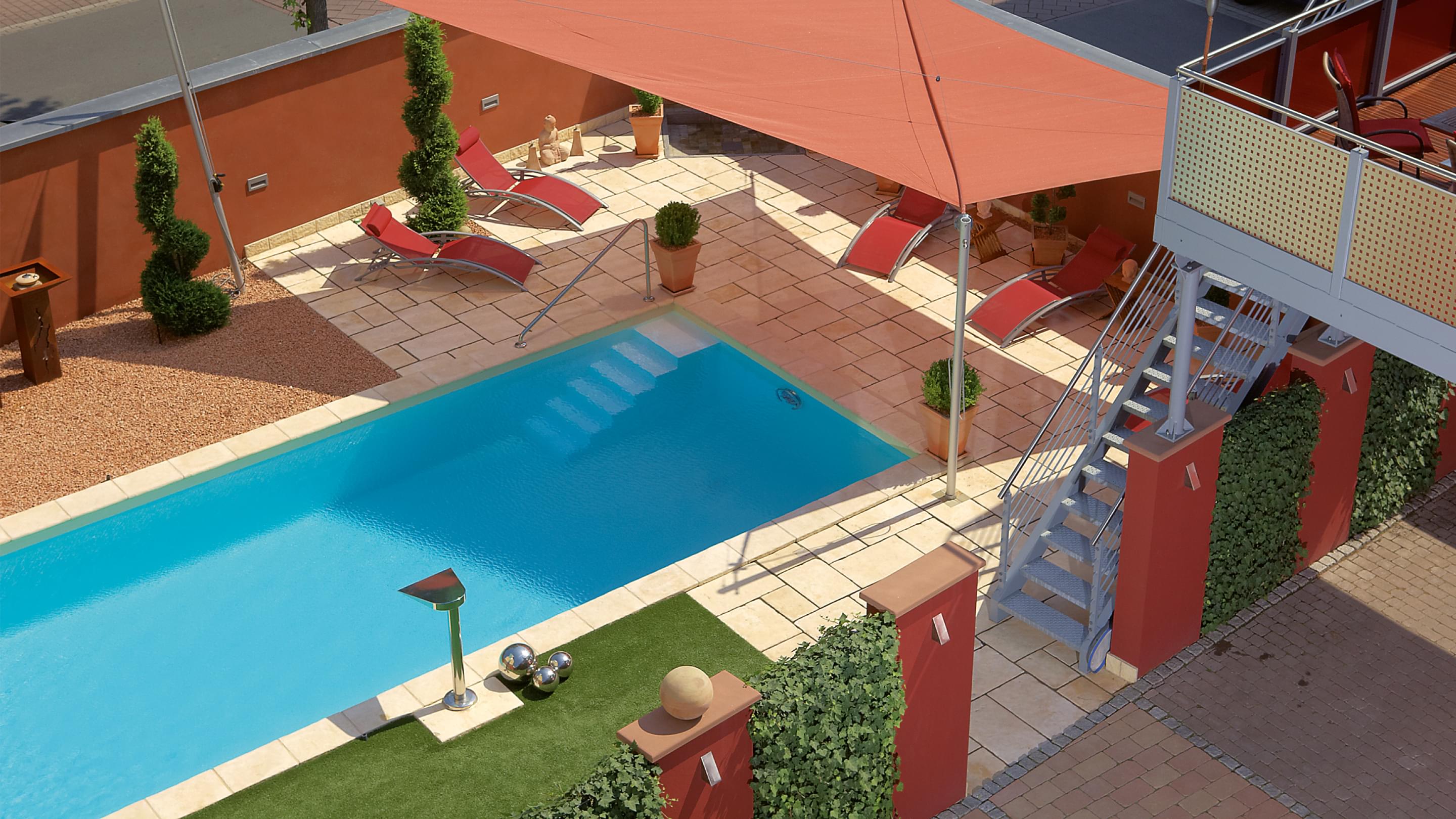 An old building was torn down for the outdoor pool with shower, its sandstone being reused for the new design of the swimming landscape. This is presented in a sophisticated colour concept with a Far Eastern touch, thanks go gongs, Buddha sculptures and geometric frugality. The pool structure, made of concrete blocks and film, is framed by sand coloured borders, which communicate with the terra-cotta coloured, plastered wall surfaces.