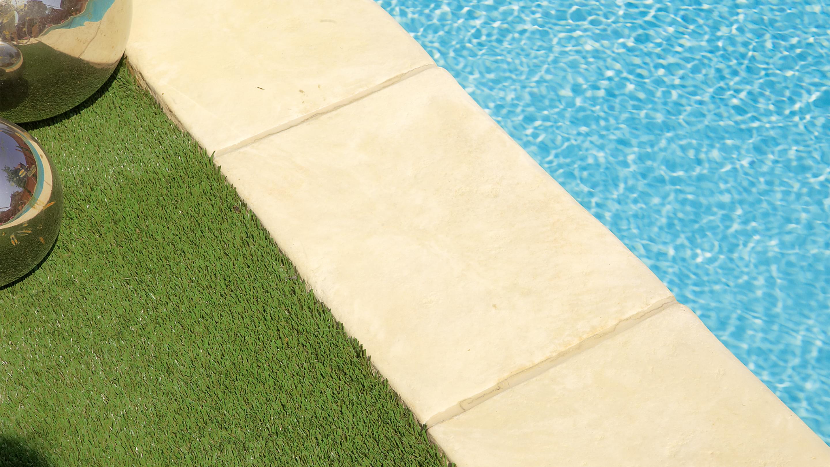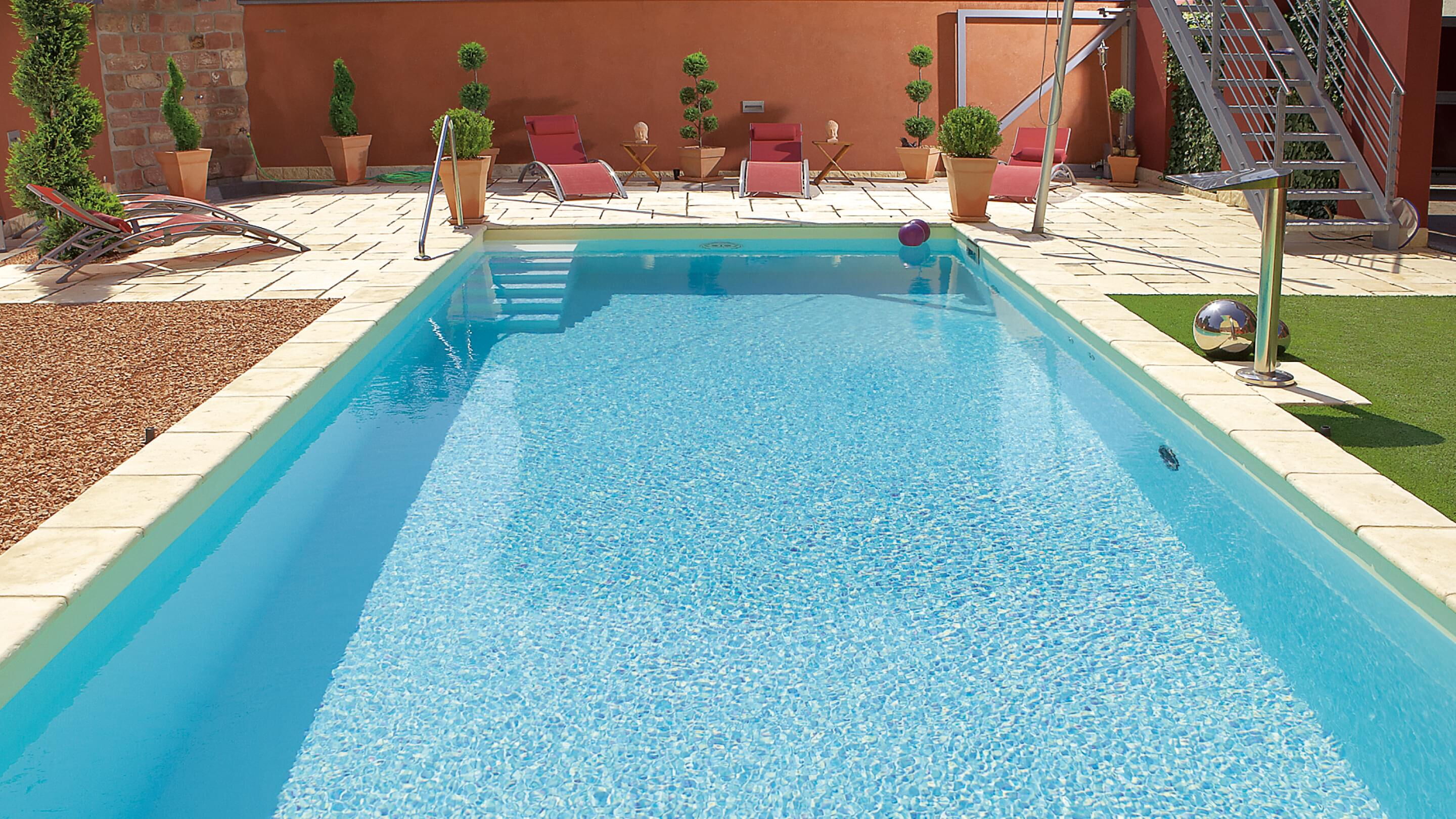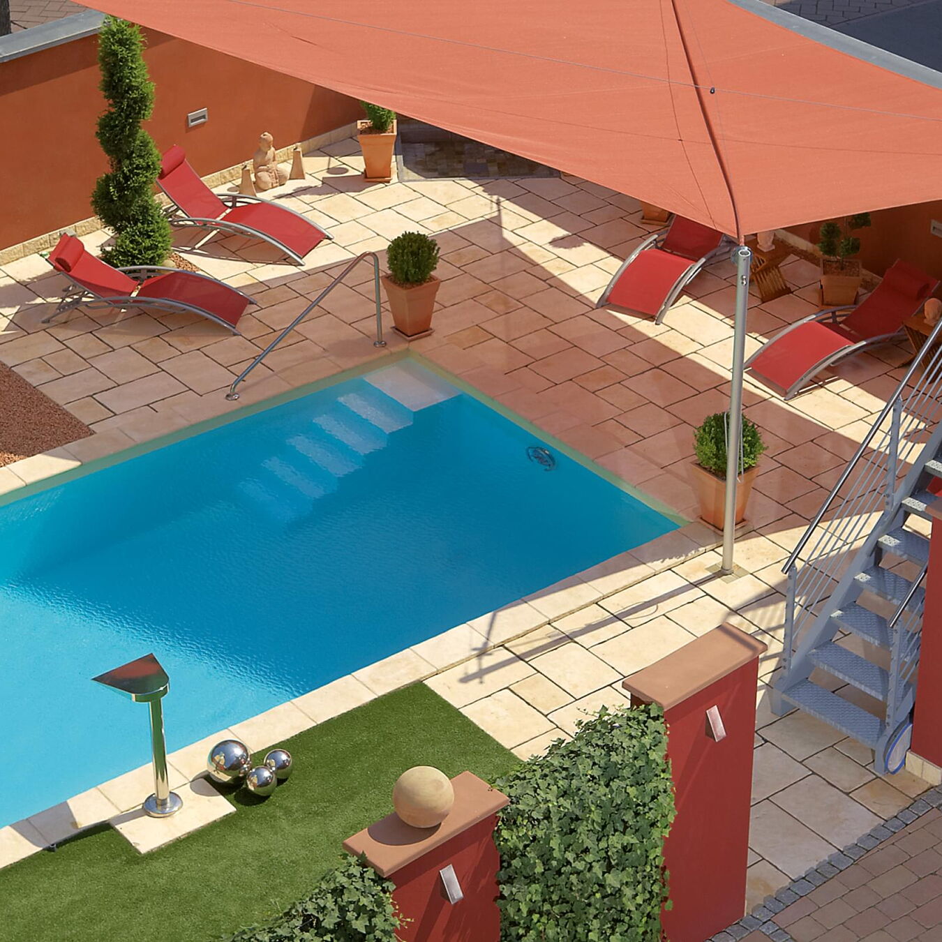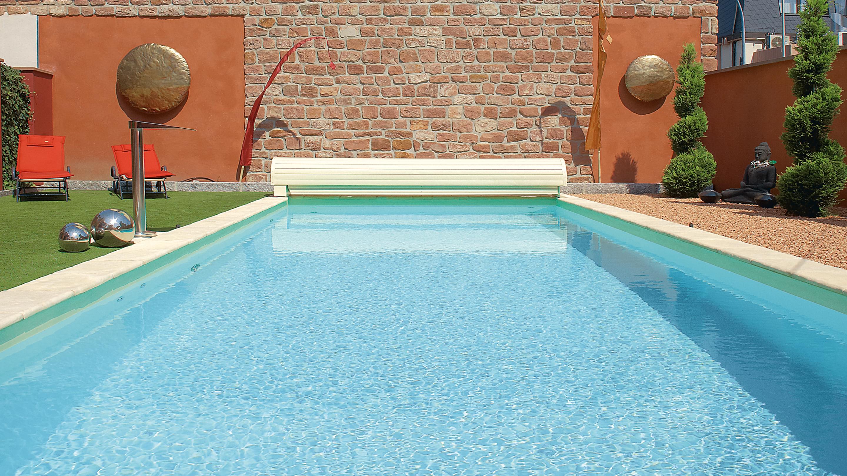 An old building was torn down for the outdoor pool with shower, its sandstone being reused for the new design of the swimming landscape. This is presented in a sophisticated colour concept with a Far Eastern touch, thanks go gongs, Buddha sculptures and geometric frugality. The pool structure, made of concrete blocks and film, is framed by sand coloured borders, which communicate with the terra-cotta coloured, plastered wall surfaces.