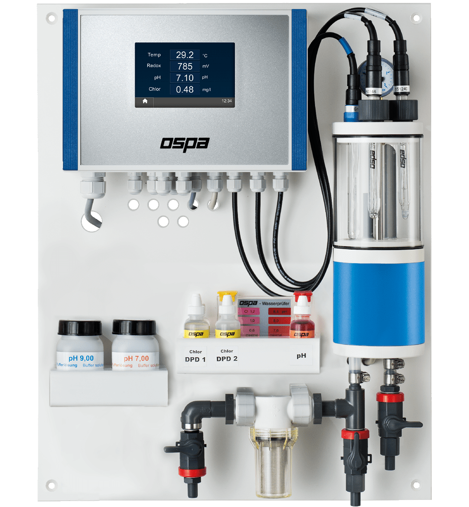 The Ospa CompactControl measurement station precisely measures free chlorine, pH levels, redox, and water temperature, automatically regulating water quality. Current water values, warnings, and reserve notifications are displayed on the touchscreen or sent via Ospa BlueCheck to a smartphone and service technician.