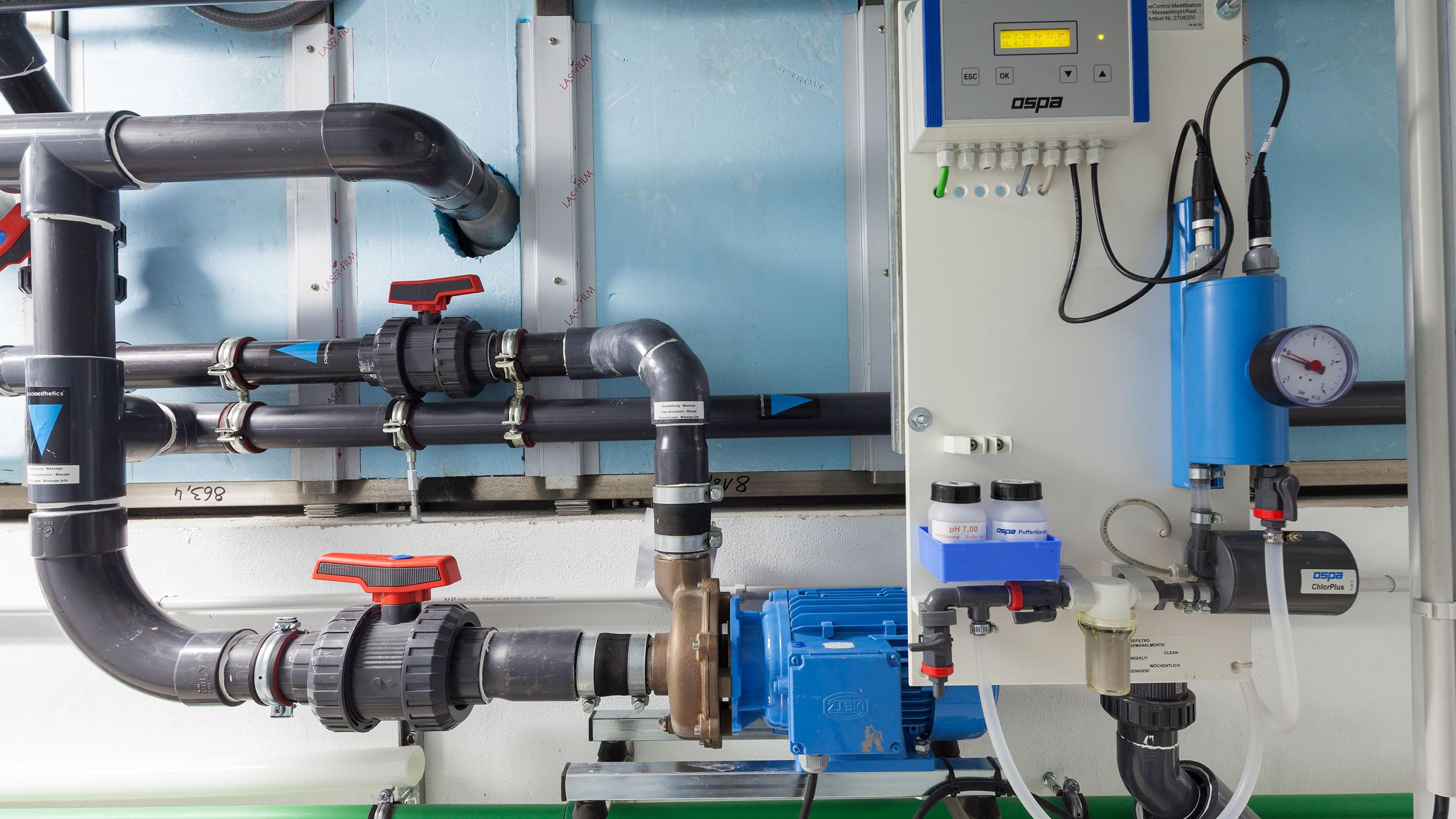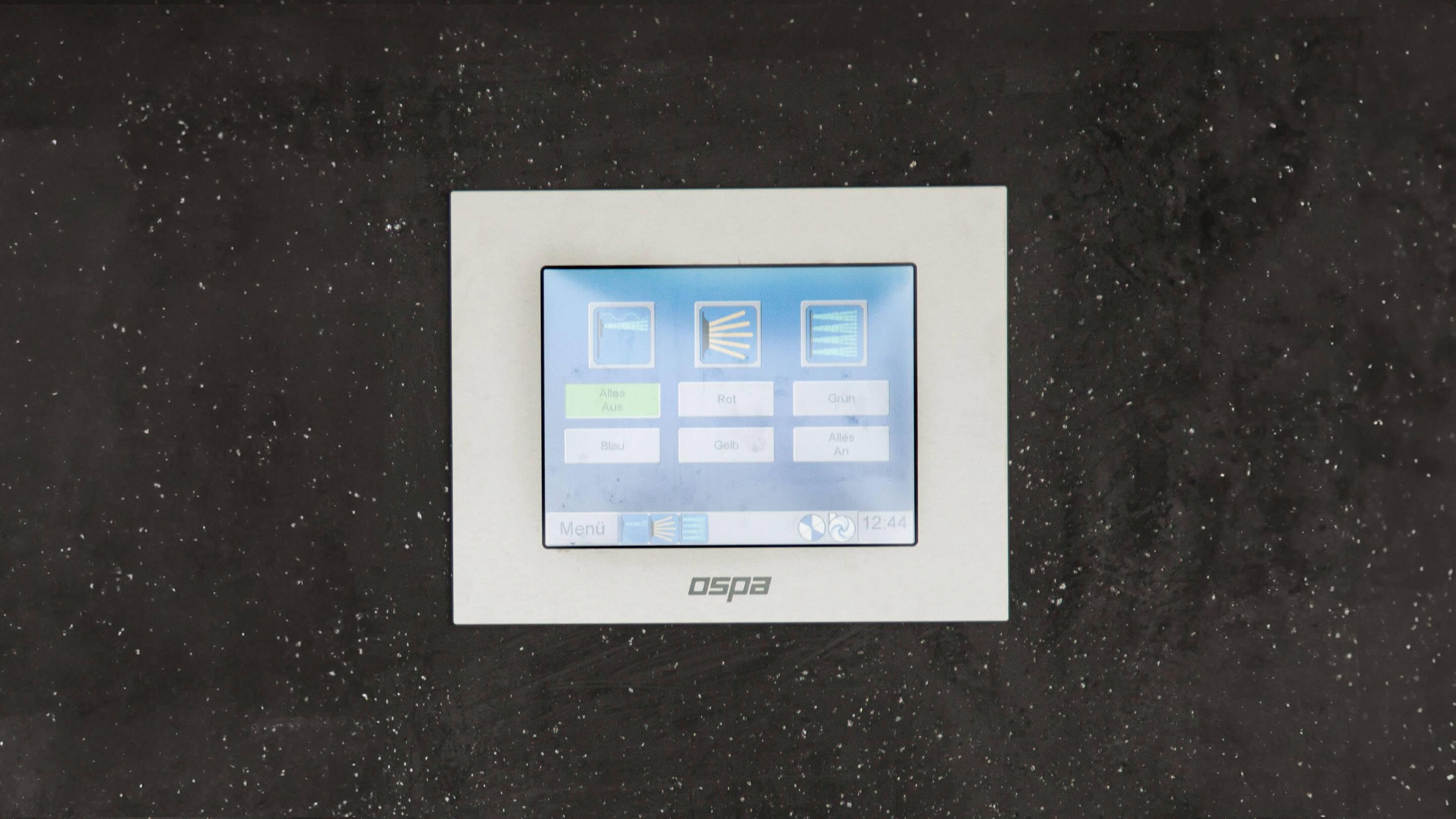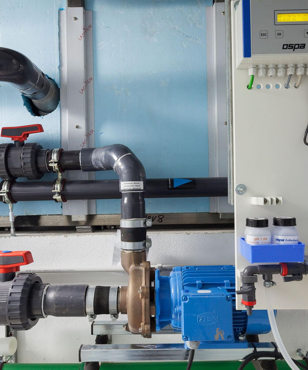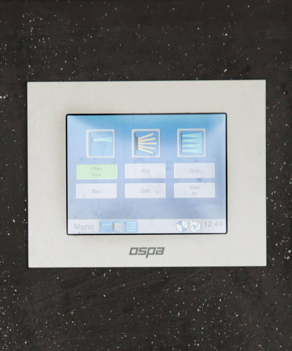 Dankzij het tegenstroomsysteem en het massagesysteem is het zwembad zowel geschikt voor zwemtraining als om te ontspannen. Om ervoor te zorgen dat de waterkwaliteit altijd in orde is, hebben de bouwers gekozen voor Ospa-waterbehandeling. De combinatie van Ospa-zandfilter, BlueClear®-waterdesinfectie en BlueControl®-besturing voor gegarandeerd zuiver, geurloos en huid- en oogvriendelijk weldadig water. De techniek wordt bediend via een touchscreen, waarmee niet alleen alle componenten van het zwembad kunnen worden geregeld. Via het KNX-bussysteem is het hele Smart Home in de besturing geïntegreerd.