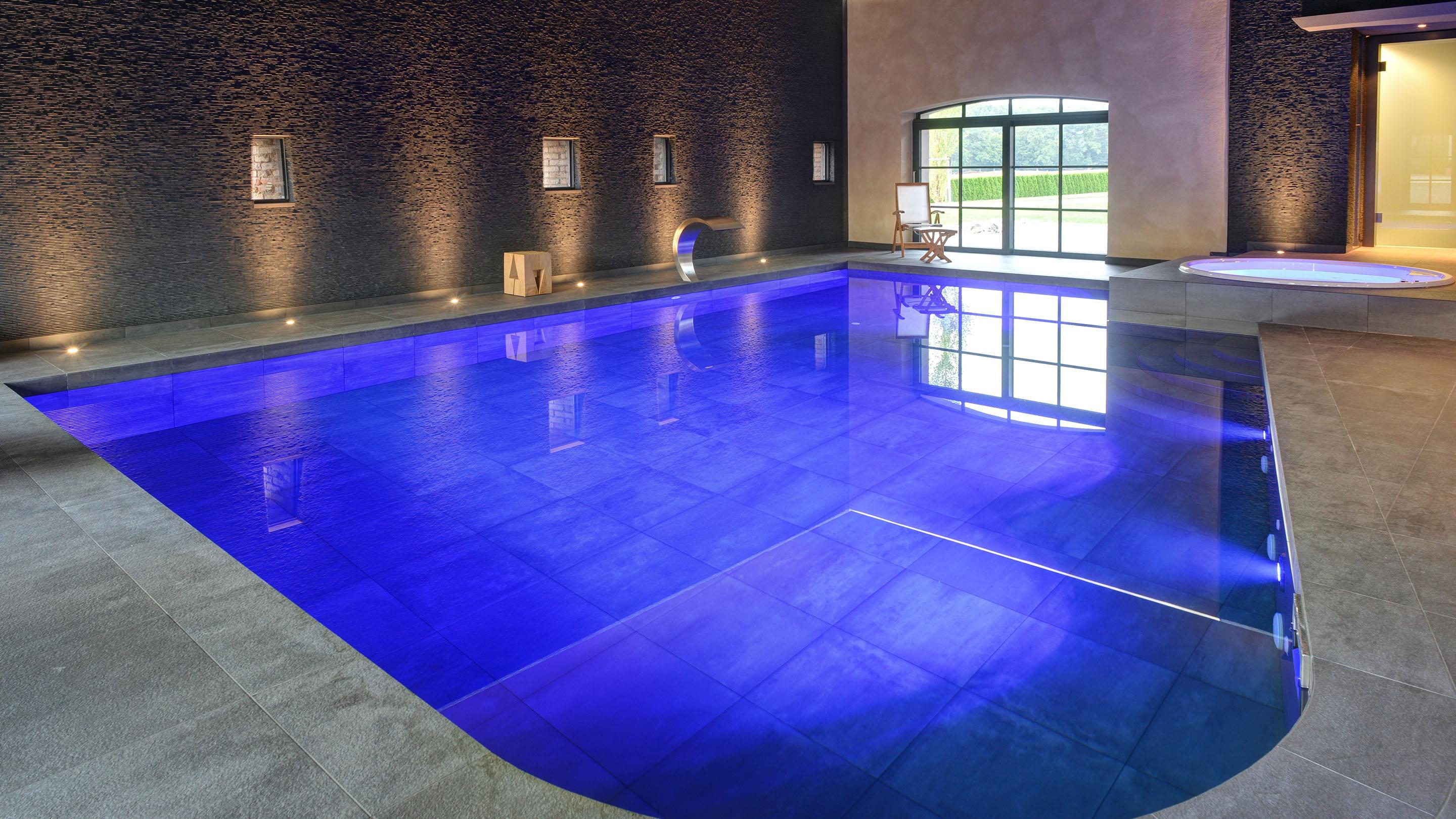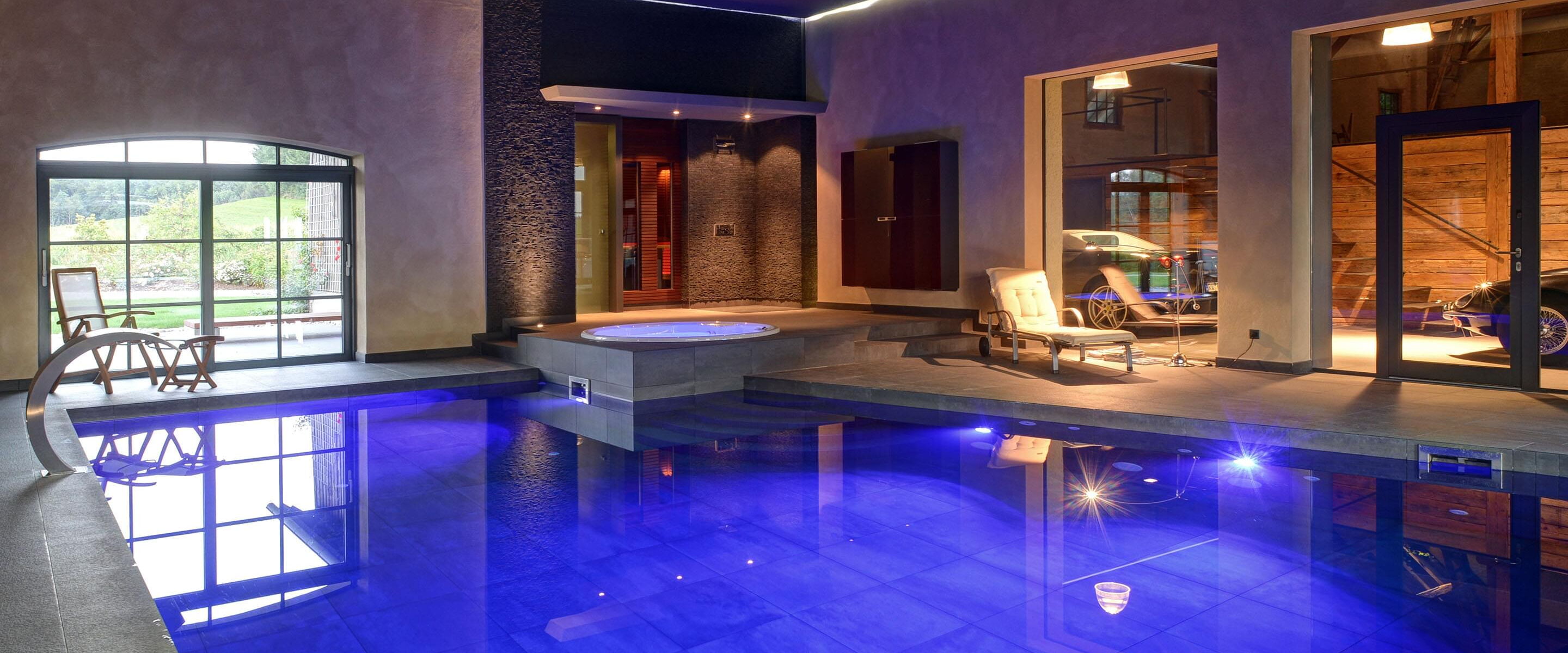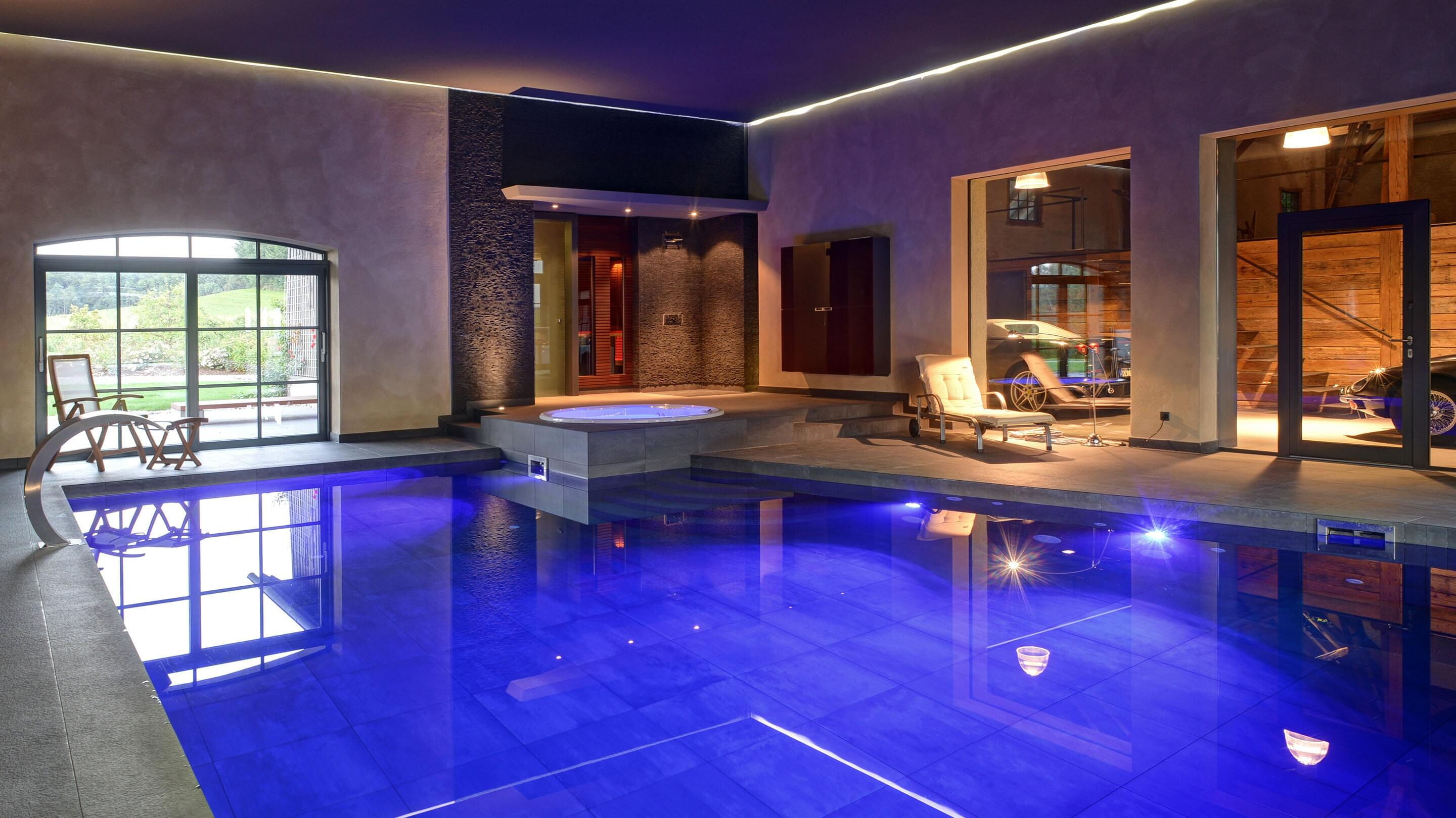 Voor de bouwheer is deze wellnessoase uitgegroeid tot zijn favoriete plek. Hier vindt hij alles wat hem plezier doet: het betegelde zwembad van 6 x 9 m biedt een sportieve compensatie voor het dagelijkse werk. De sauna en het stoombad stimuleren de bloedsomloop en de whirlpool zorgt voor ontspanning. Grote glasfronten bieden een goed zicht op bijzondere verzamelobjecten: sportwagens. Dat maakt zwemmen nog leuker.