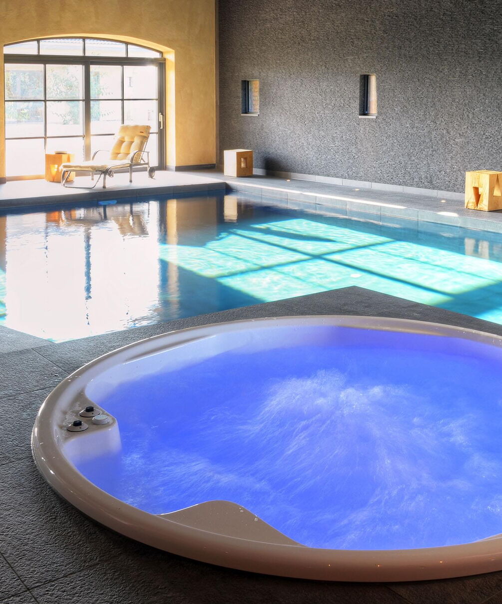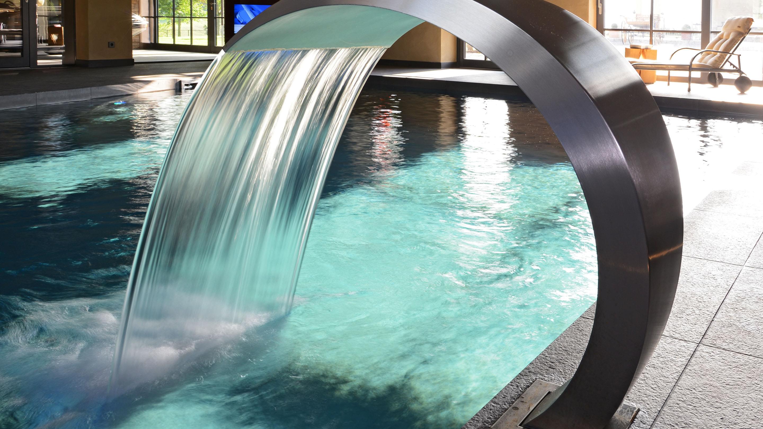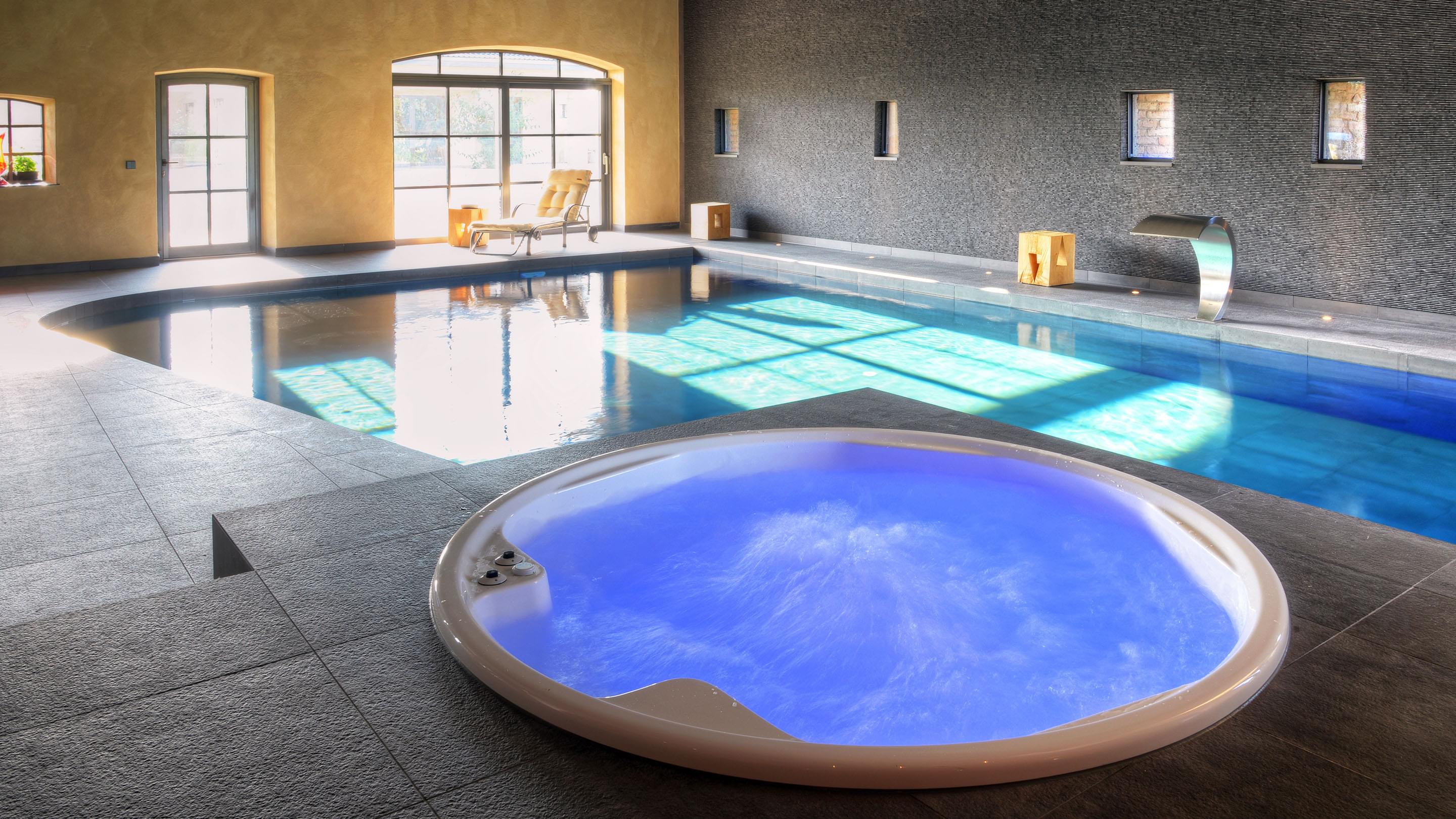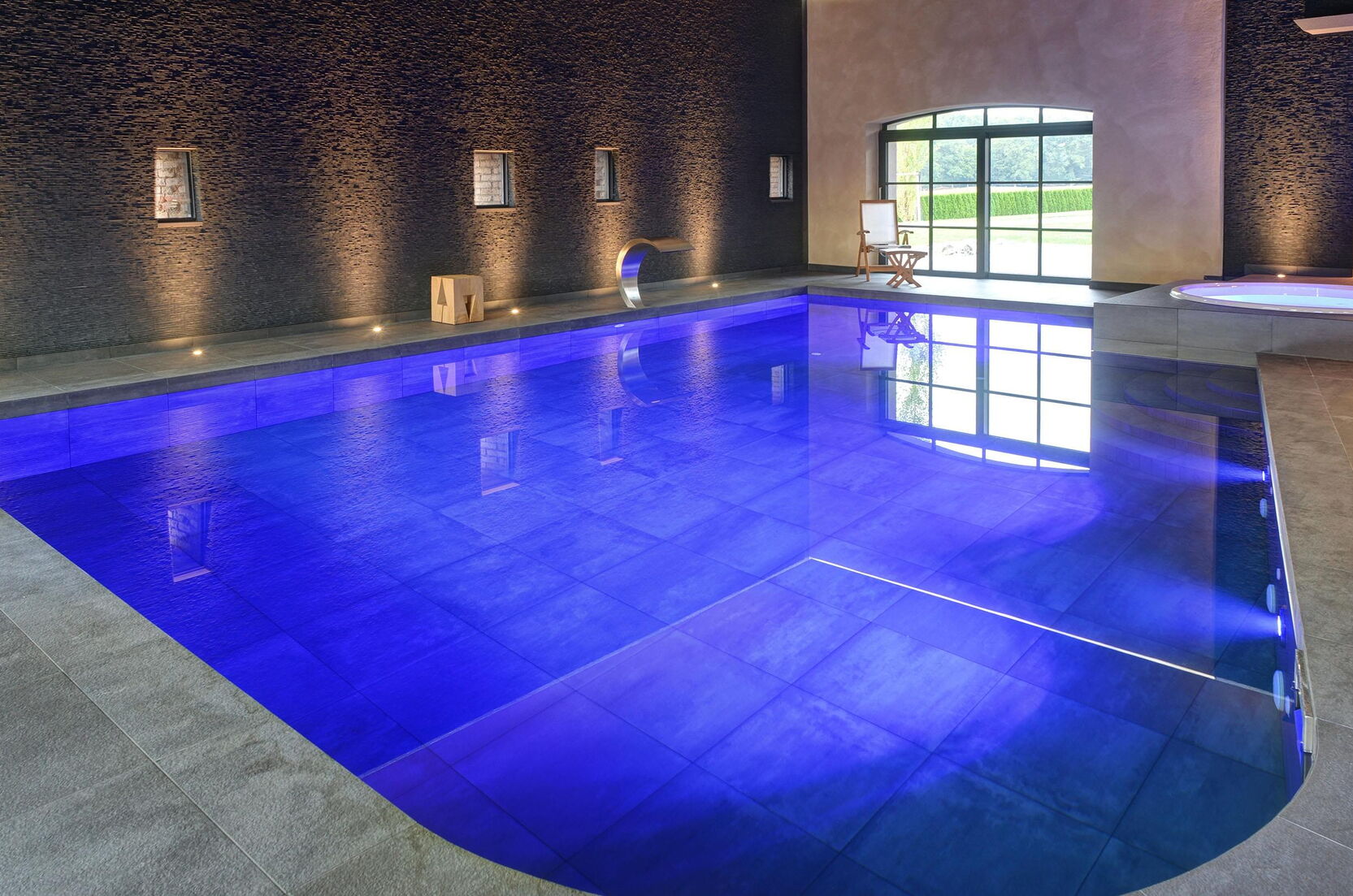 Voor de bouwheer is deze wellnessoase uitgegroeid tot zijn favoriete plek. Hier vindt hij alles wat hem plezier doet: het betegelde zwembad van 6 x 9 m biedt een sportieve compensatie voor het dagelijkse werk. De sauna en het stoombad stimuleren de bloedsomloop en de whirlpool zorgt voor ontspanning. Grote glasfronten bieden een goed zicht op bijzondere verzamelobjecten: sportwagens. Dat maakt zwemmen nog leuker.