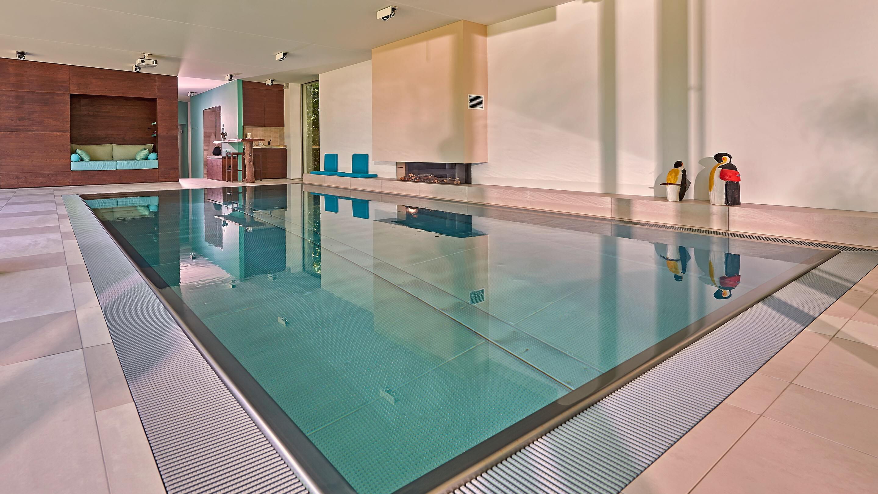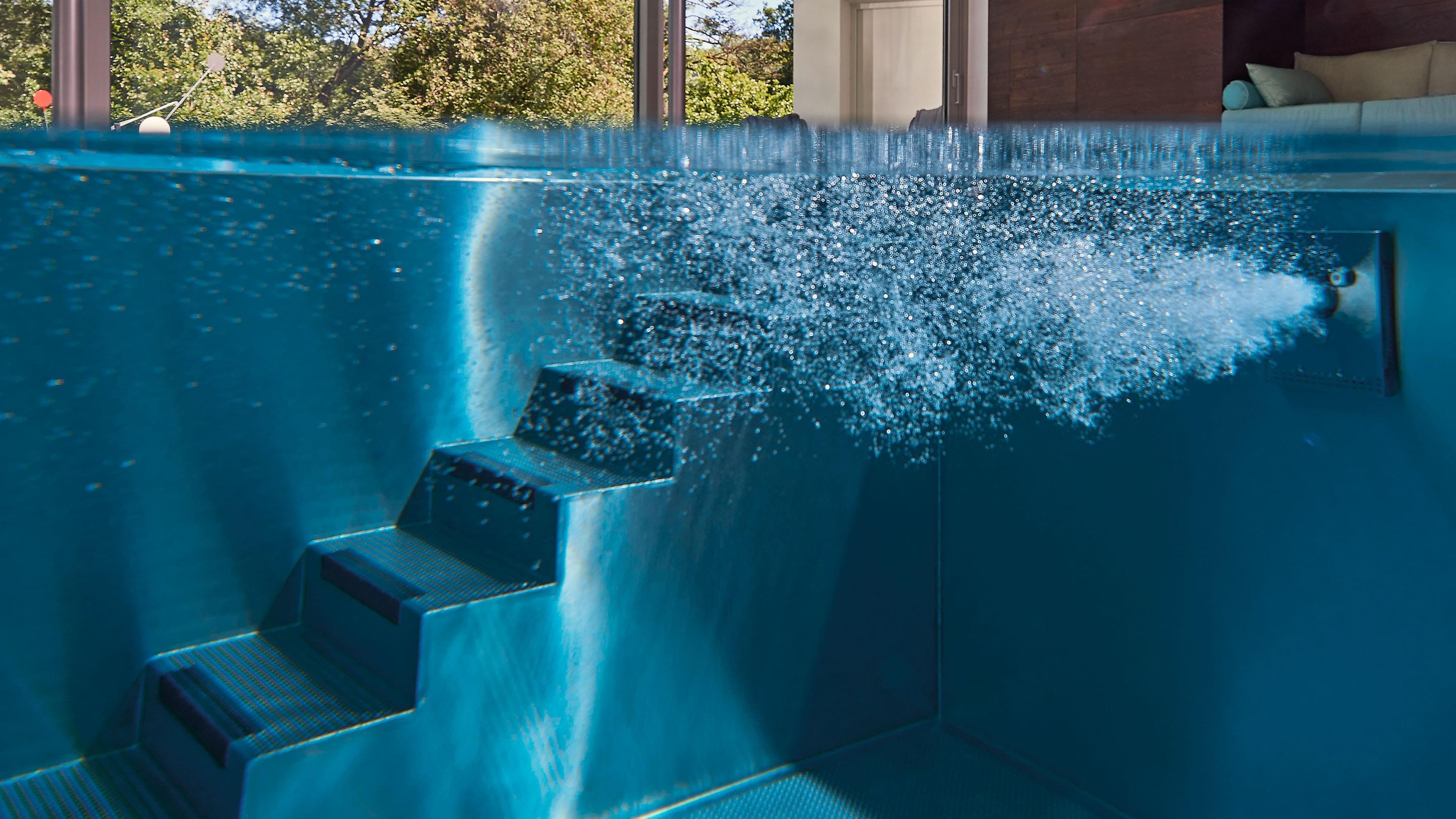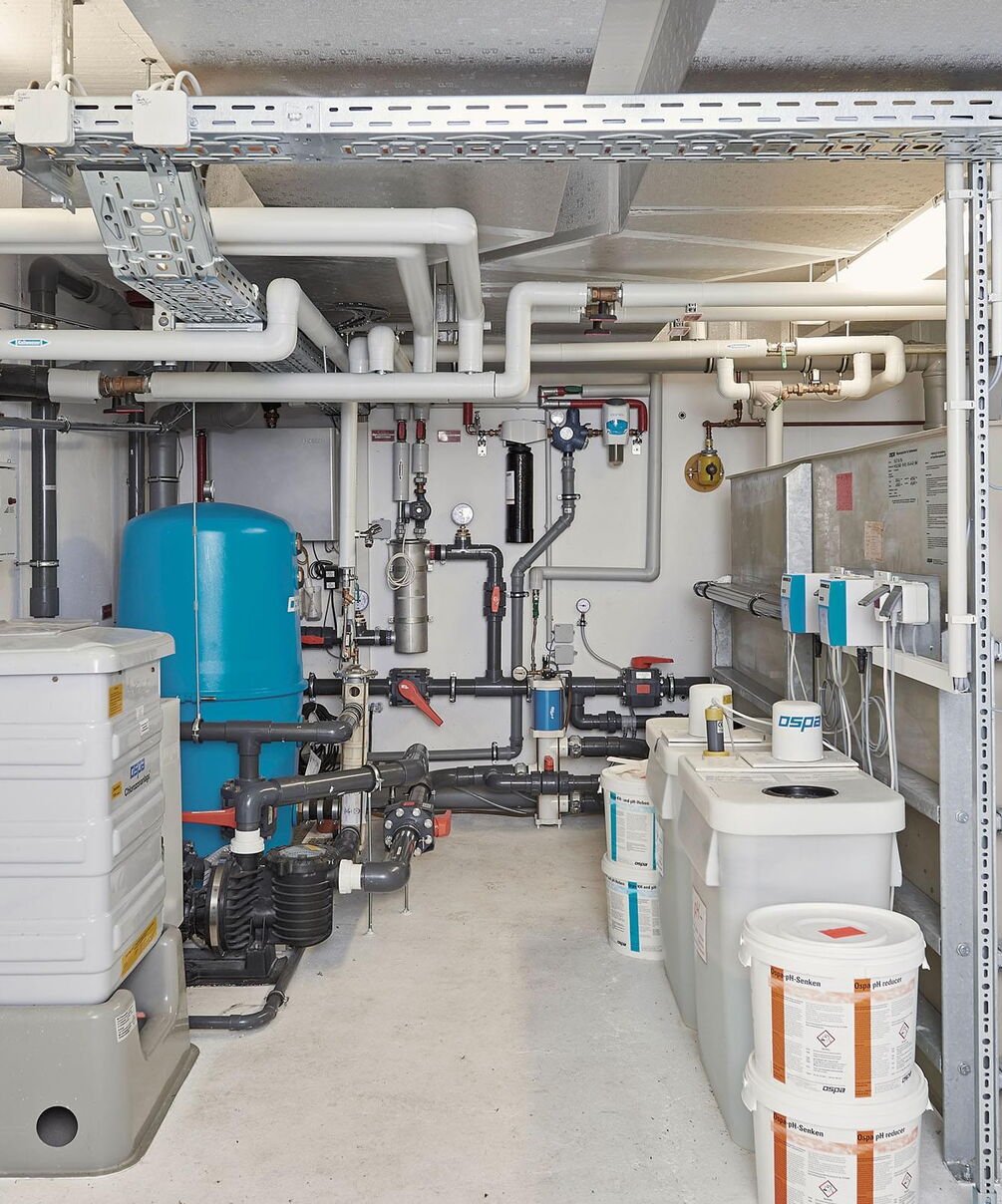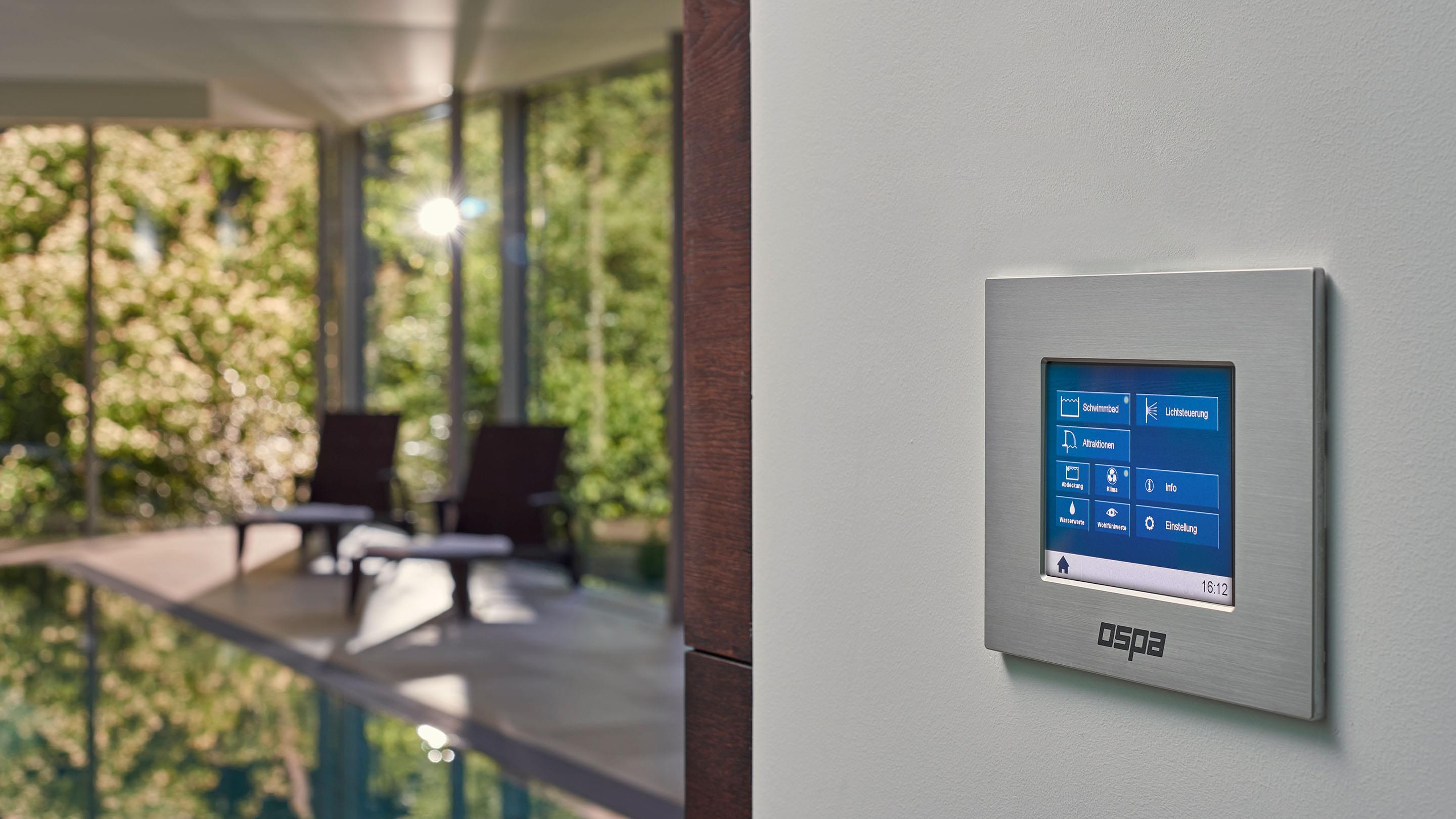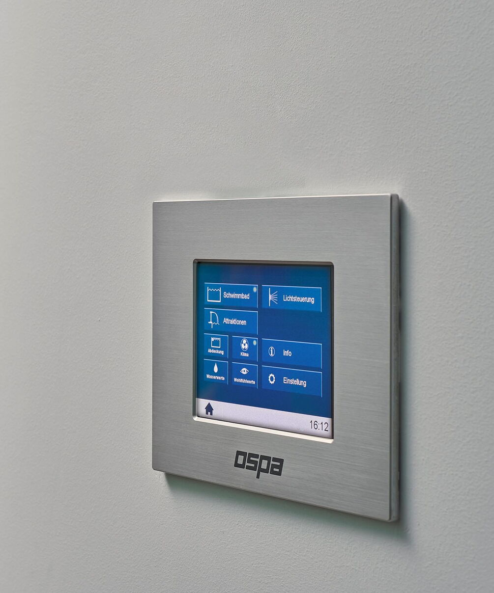 Door de royale glaspartijen wordt de omliggende buitenruimte onderdeel van het complex. Binnen ontstaan steeds nieuwe lichtspelen op het wateroppervlak en de natuurstenen vloer. Optische contrasten maken deze comfortzone voor veeleisende gebruikers bij elk licht tot een aangename plek om te ontspannen of baantjes te trekken. Het zwembad zelf is uitgerust met een tegenstroominstallatie, onderwaterspots en een onderwaterrolluikafdekking om warmteverlies tot een minimum te beperken. De complete Ospa-techniek voor waterbehandeling en de ingebouwde waterattracties kunnen eenvoudig worden gecontroleerd en bediend via de zwembadbesturing Ospa-BlueControl® IV Web met touchscreen.