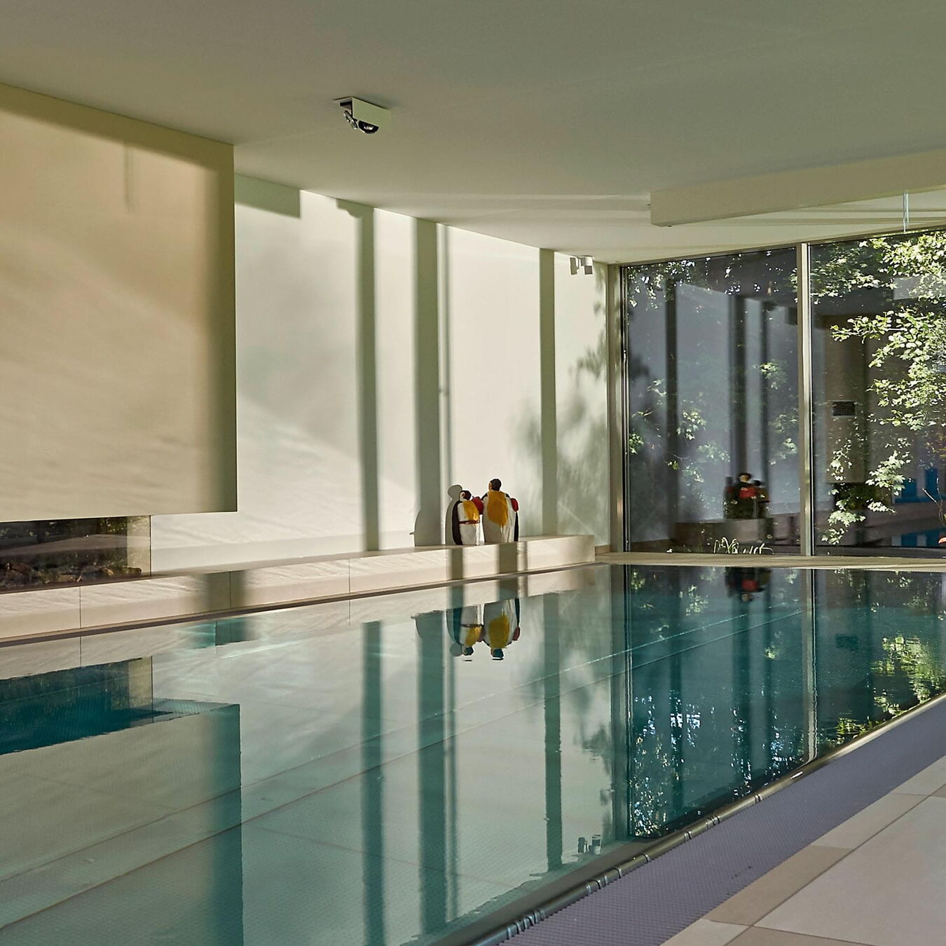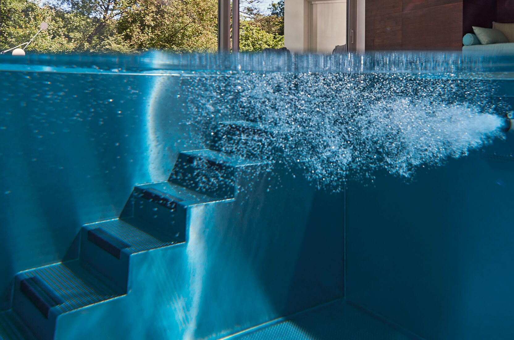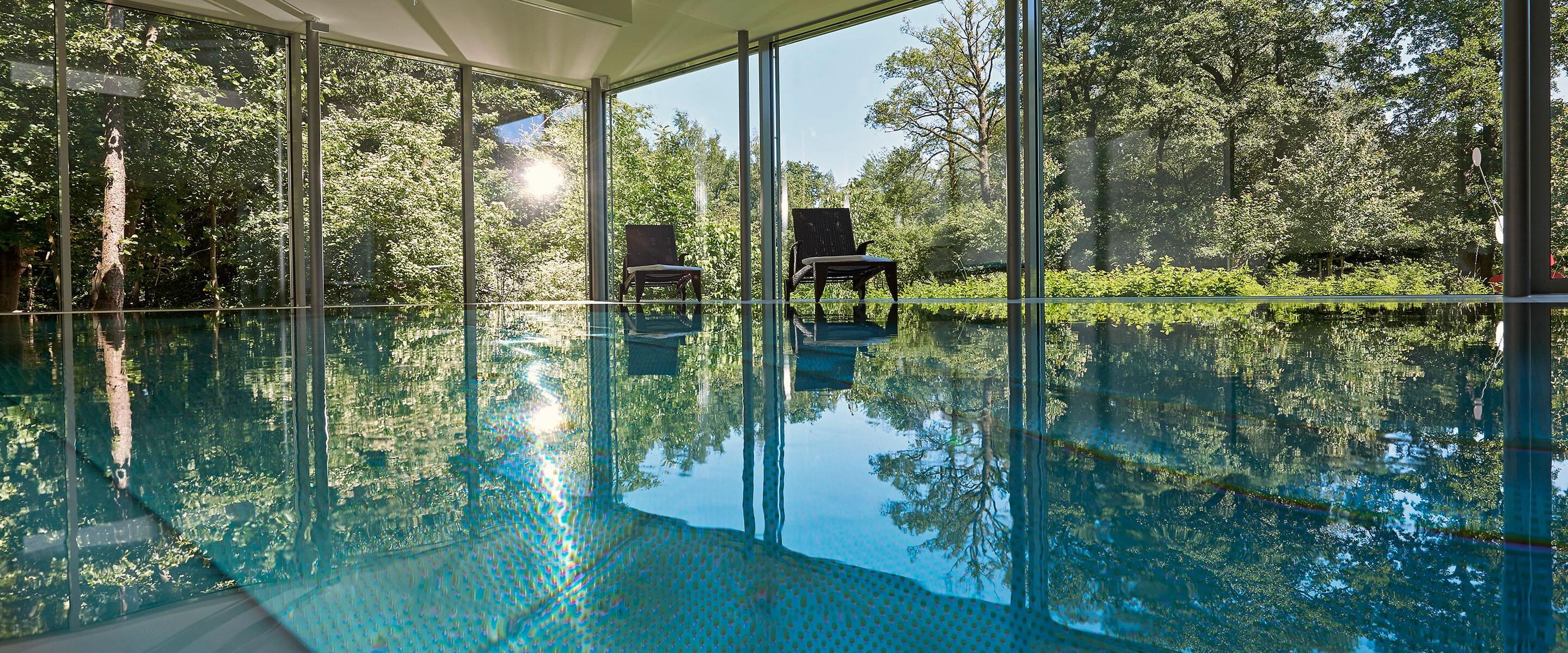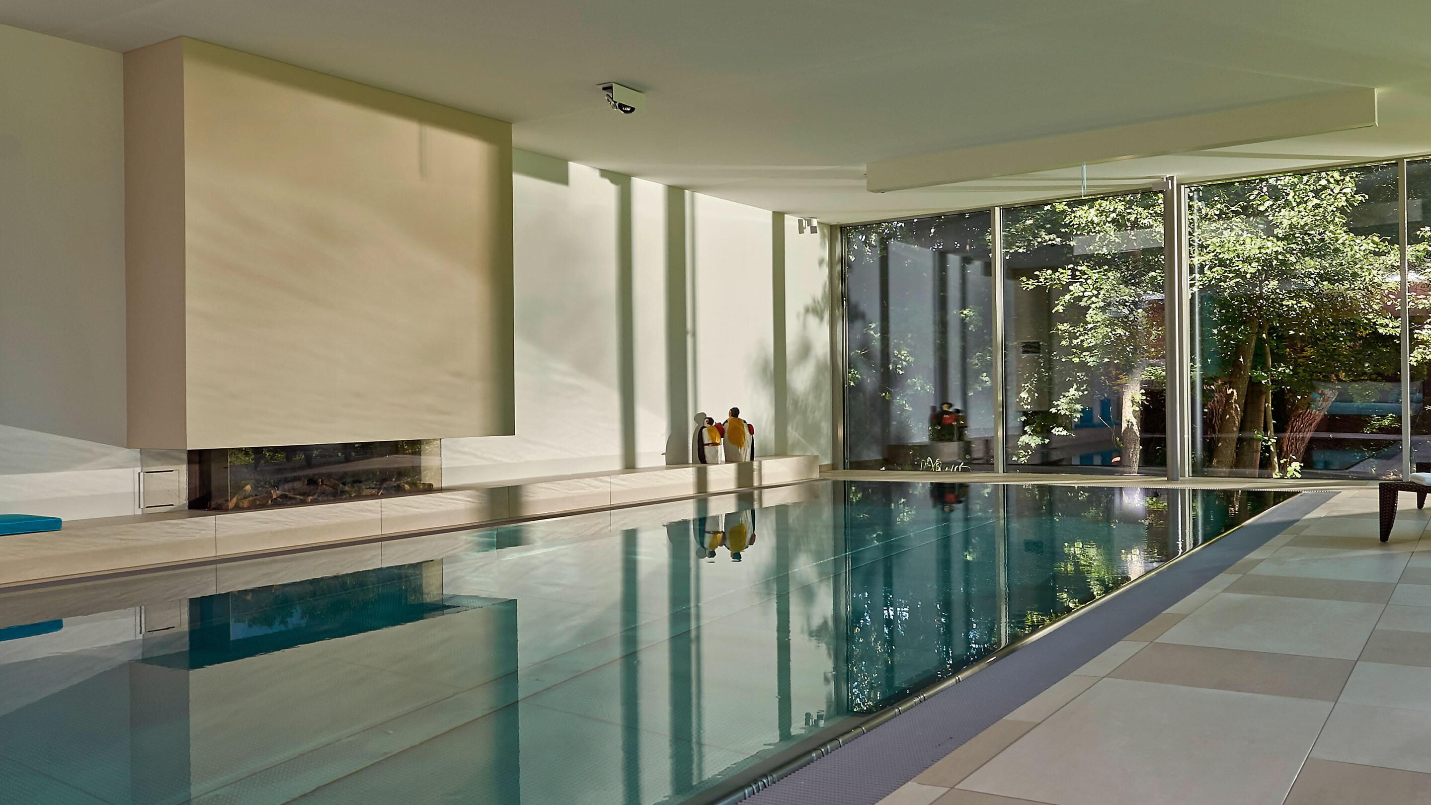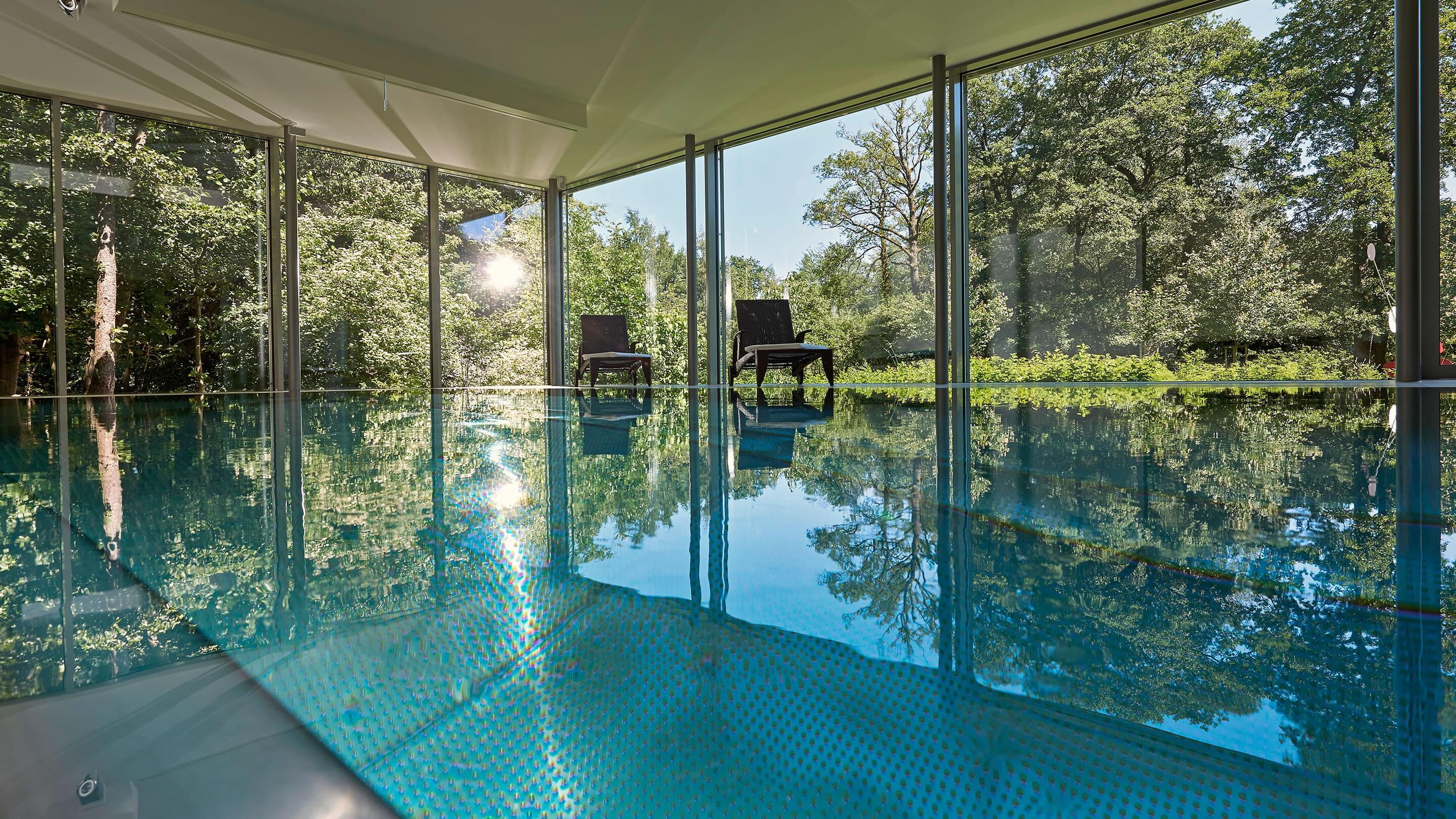 Door de royale glaspartijen wordt de omliggende buitenruimte onderdeel van het complex. Binnen ontstaan steeds nieuwe lichtspelen op het wateroppervlak en de natuurstenen vloer. Optische contrasten maken deze comfortzone voor veeleisende gebruikers bij elk licht tot een aangename plek om te ontspannen of baantjes te trekken. Het zwembad zelf is uitgerust met een tegenstroominstallatie, onderwaterspots en een onderwaterrolluikafdekking om warmteverlies tot een minimum te beperken. De complete Ospa-techniek voor waterbehandeling en de ingebouwde waterattracties kunnen eenvoudig worden gecontroleerd en bediend via de zwembadbesturing Ospa-BlueControl® IV Web met touchscreen.