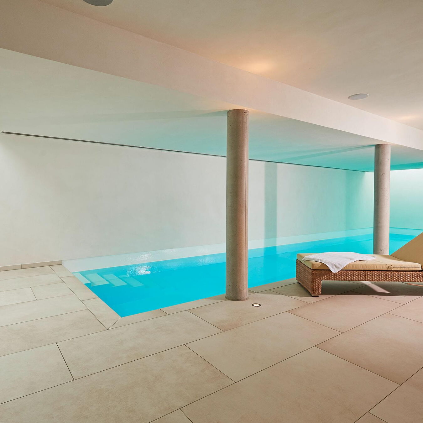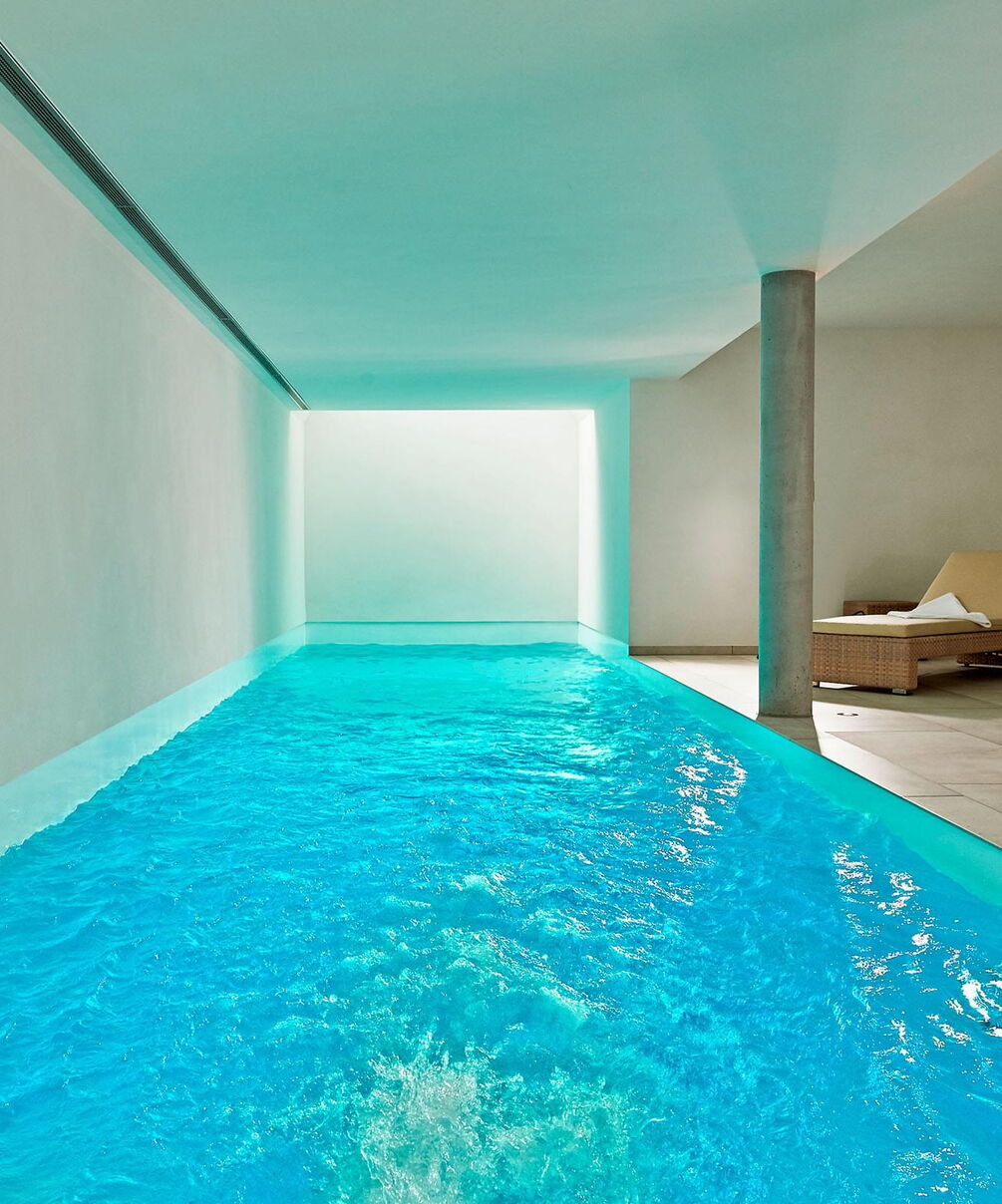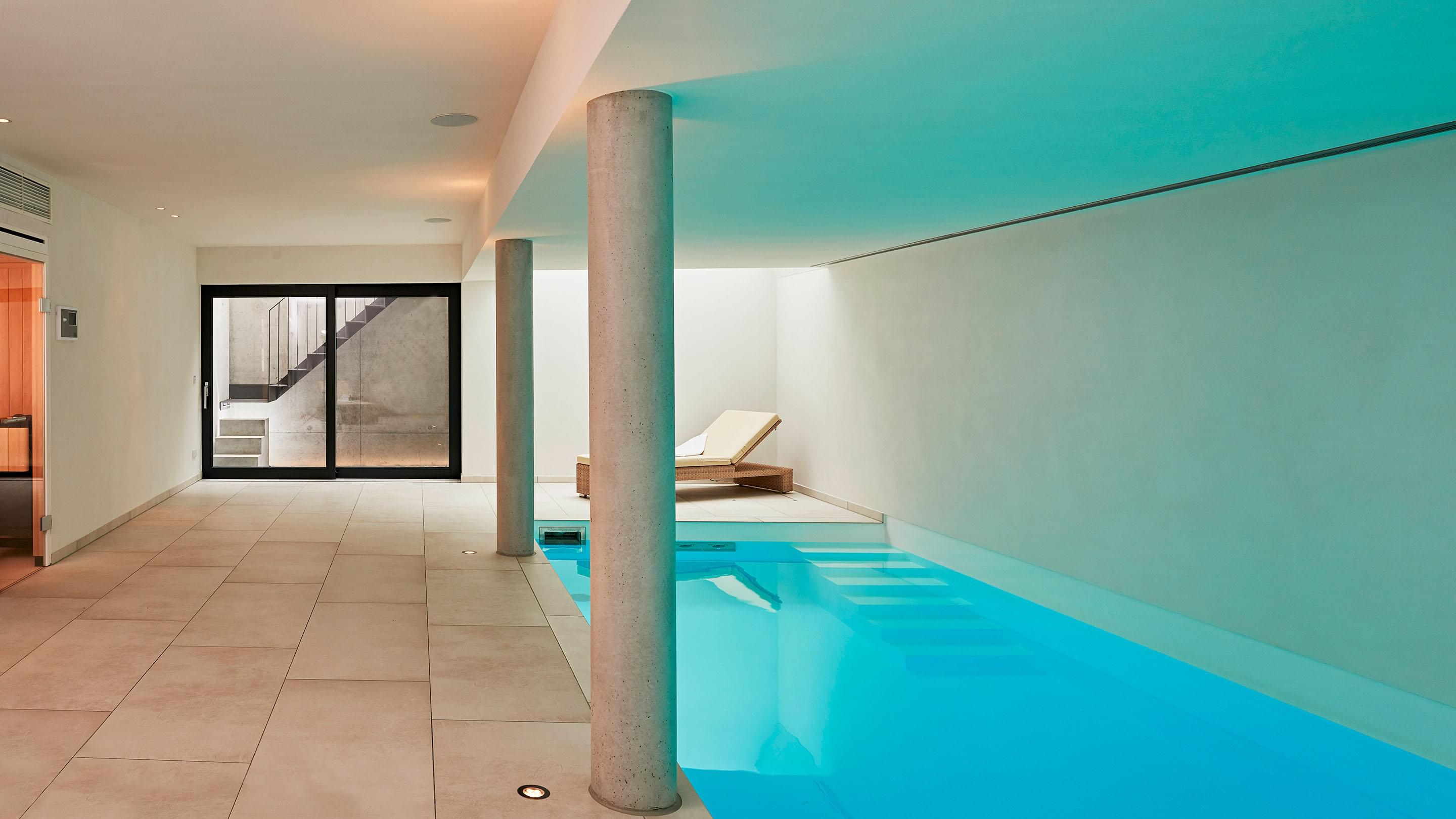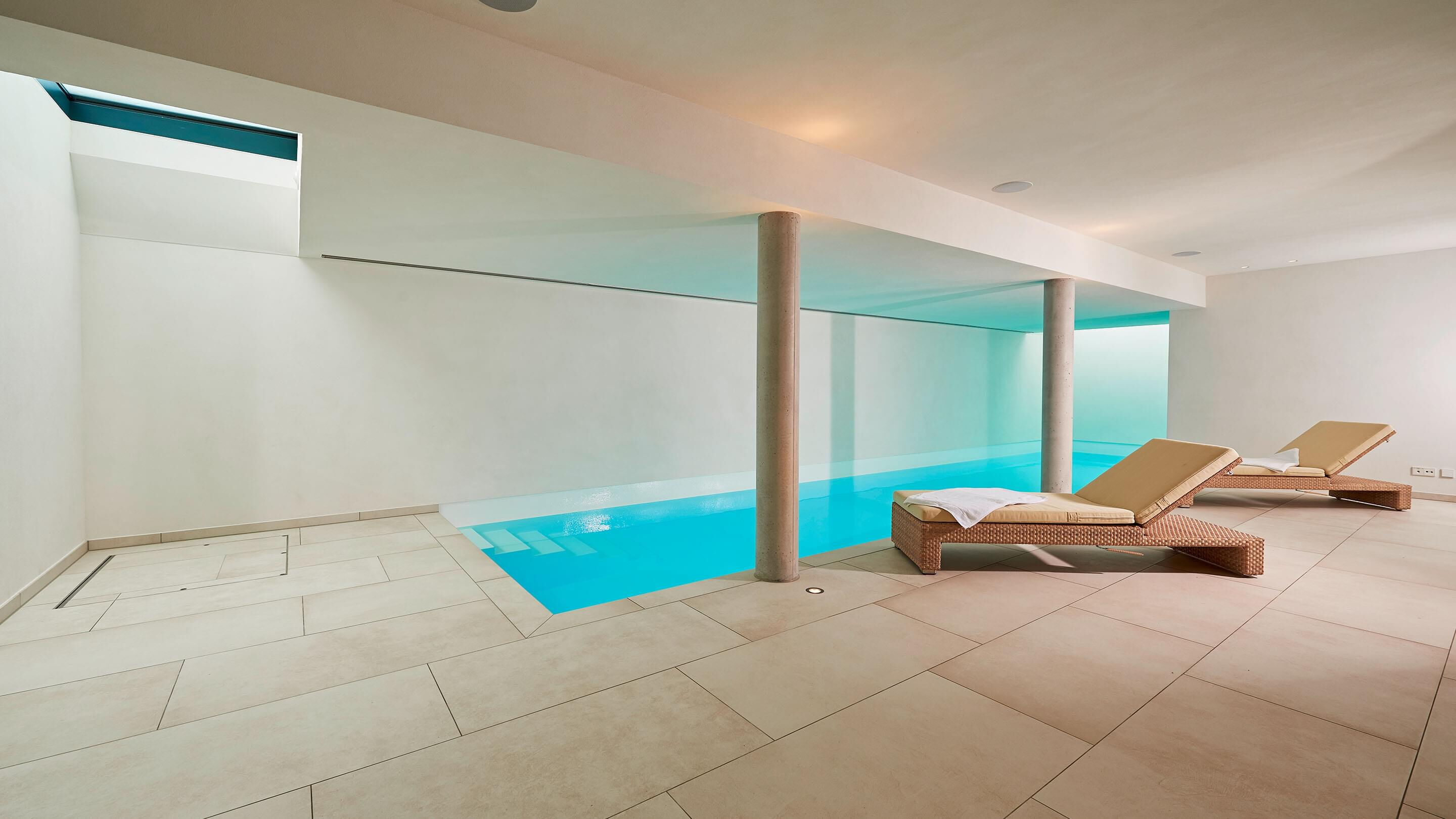 Het terras is via een schuifdeur vanuit het zwem- en wellnessgedeelte snel bereikbaar. In het zwembad zorgen twee royale dakramen aan de voorzijde voor daglicht en een Ospa-led-onderwaterverlichting voor een sfeervolle, warme verlichting in het donker. In het 11,50 m lange zwembad is bovendien een tegenstroominstallatie geïnstalleerd, waardoor u zonder problemen snel kunt zwemmen zonder te keren. De op het eerste gezicht eenvoudige constructie wordt gedragen door zichtbare betonnen kolommen. Deze bepalen het uiterlijk en worden geaccentueerd door fijnsteen en pleisterwerk. Het materiaal van de kolommen komt ook terug in de zes treden tellende trap naar het zwembad, die het puristische ontwerp van het hele gebied vakkundig voortzet. Het Ospa-waterbehandelingssysteem, bestaande uit de zwembadbesturing Ospa-BlueControl, Ospa-superfilter met extra actieve koollaag en Ospa-BlueClear® desinfectie. Via de zwembadbesturing Ospa-BlueControl IV web kunnen alle waterattracties en de zwembadtechnologie comfortabel en eenvoudig via een touchscreen worden bediend.