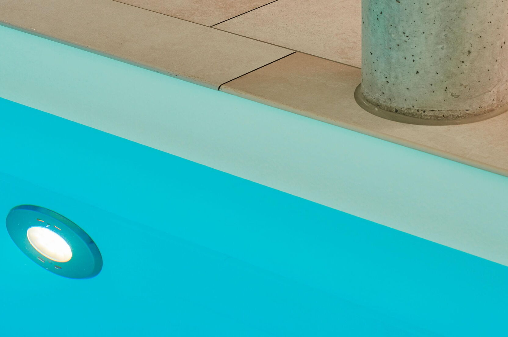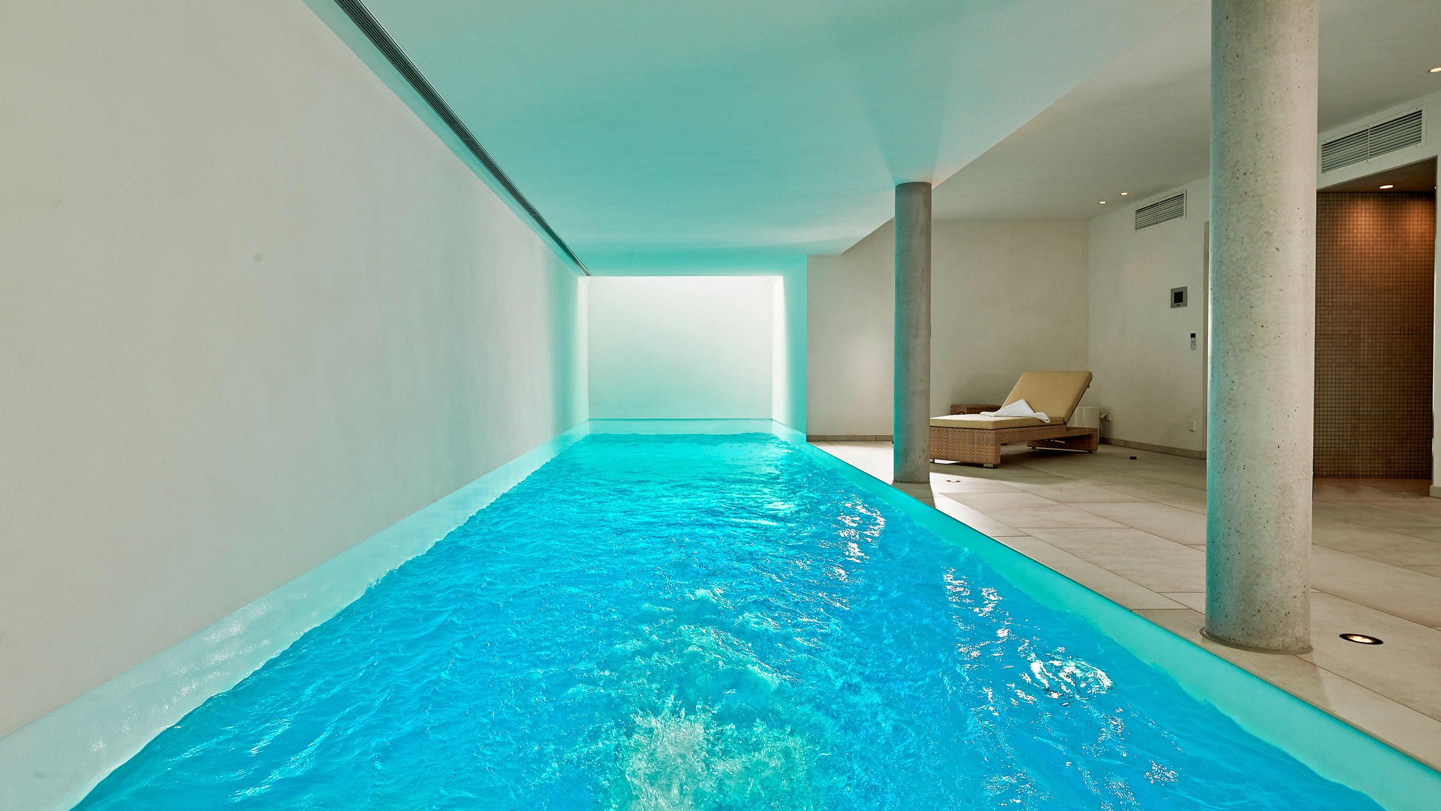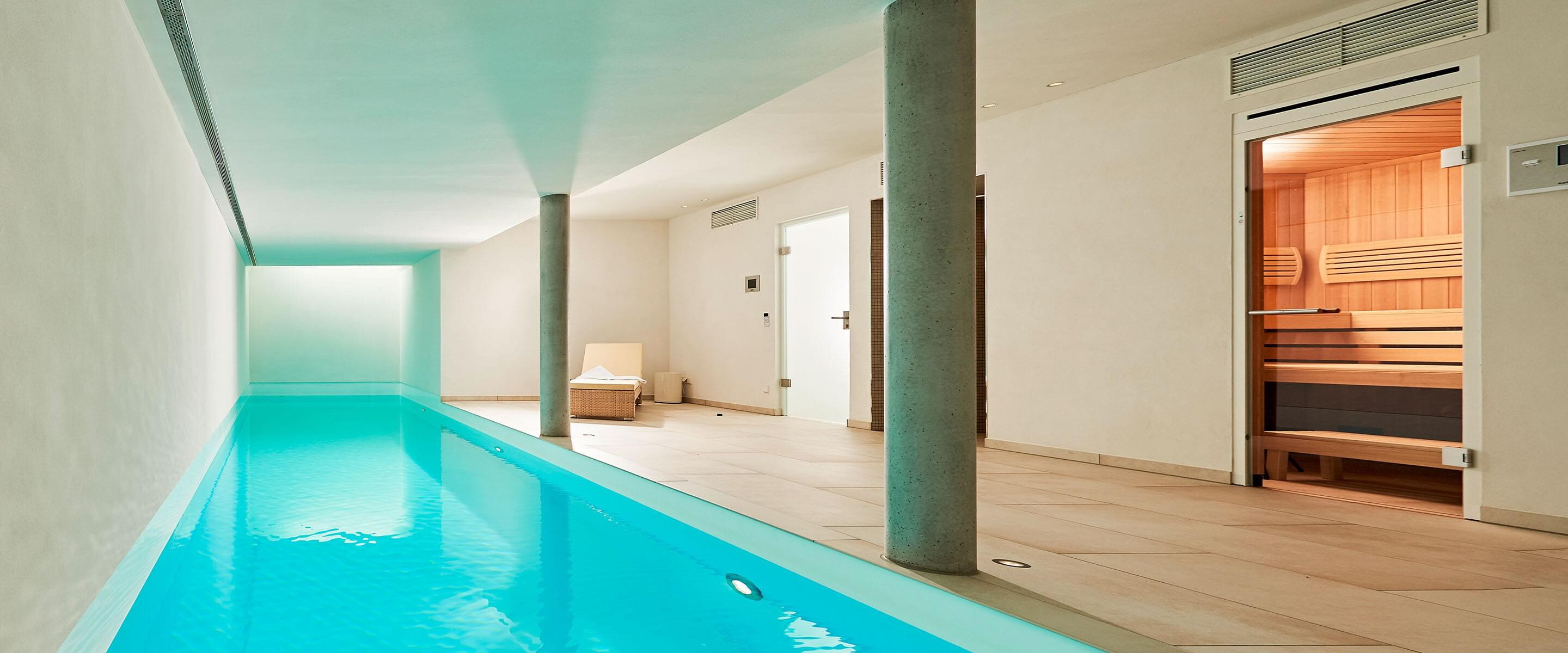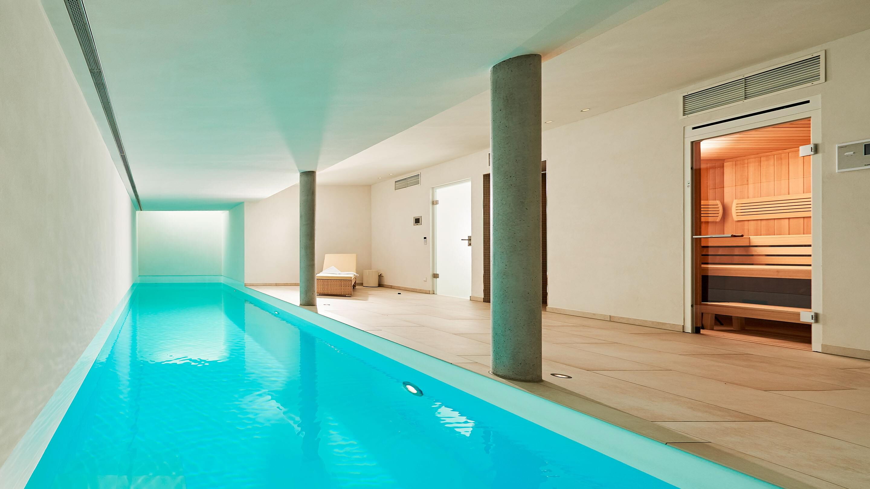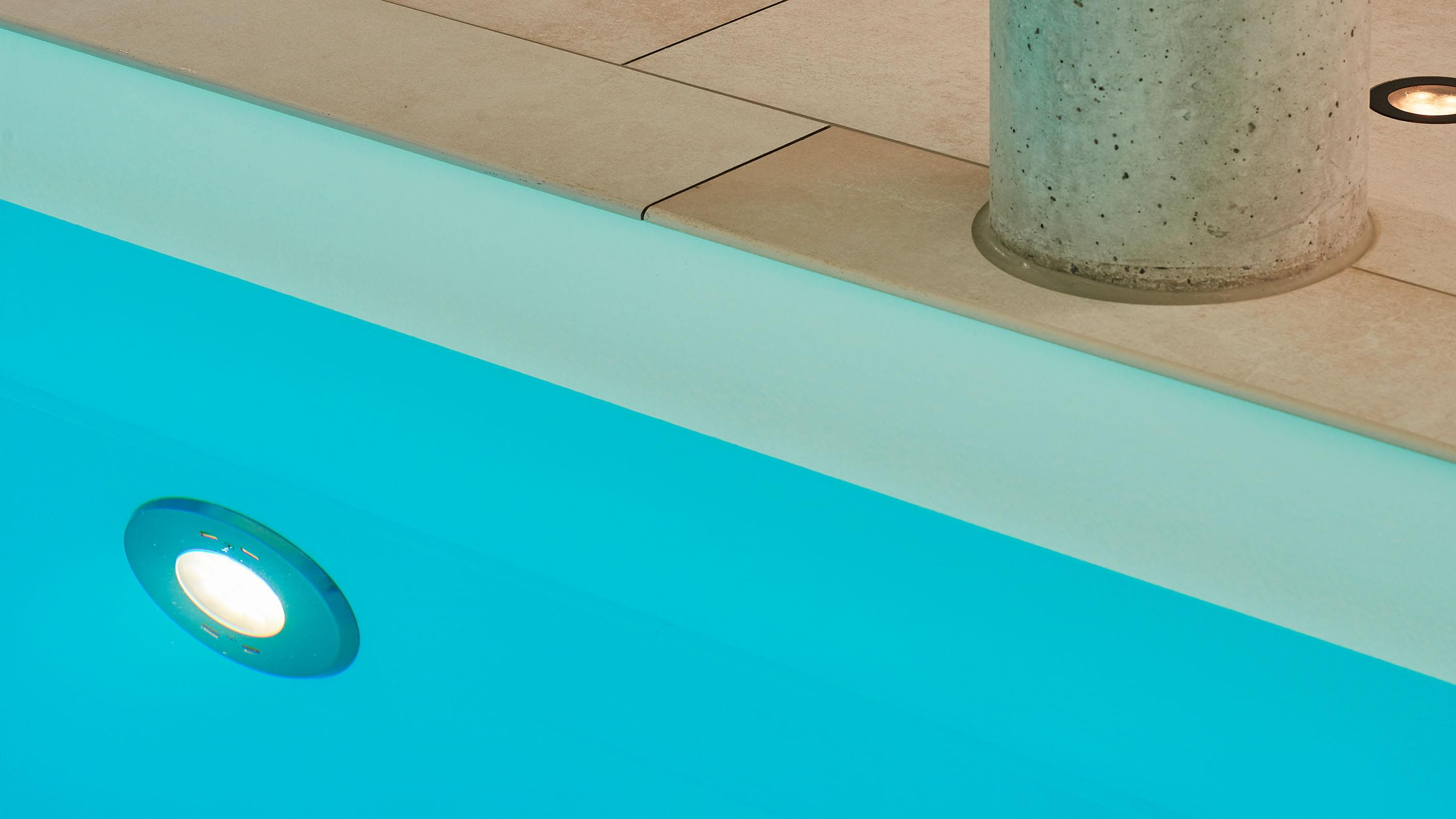 Het terras is via een schuifdeur vanuit het zwem- en wellnessgedeelte snel bereikbaar. In het zwembad zorgen twee royale dakramen aan de voorzijde voor daglicht en een Ospa-led-onderwaterverlichting voor een sfeervolle, warme verlichting in het donker. In het 11,50 m lange zwembad is bovendien een tegenstroominstallatie geïnstalleerd, waardoor u zonder problemen snel kunt zwemmen zonder te keren. De op het eerste gezicht eenvoudige constructie wordt gedragen door zichtbare betonnen kolommen. Deze bepalen het uiterlijk en worden geaccentueerd door fijnsteen en pleisterwerk. Het materiaal van de kolommen komt ook terug in de zes treden tellende trap naar het zwembad, die het puristische ontwerp van het hele gebied vakkundig voortzet. Het Ospa-waterbehandelingssysteem, bestaande uit de zwembadbesturing Ospa-BlueControl, Ospa-superfilter met extra actieve koollaag en Ospa-BlueClear® desinfectie. Via de zwembadbesturing Ospa-BlueControl IV web kunnen alle waterattracties en de zwembadtechnologie comfortabel en eenvoudig via een touchscreen worden bediend.
