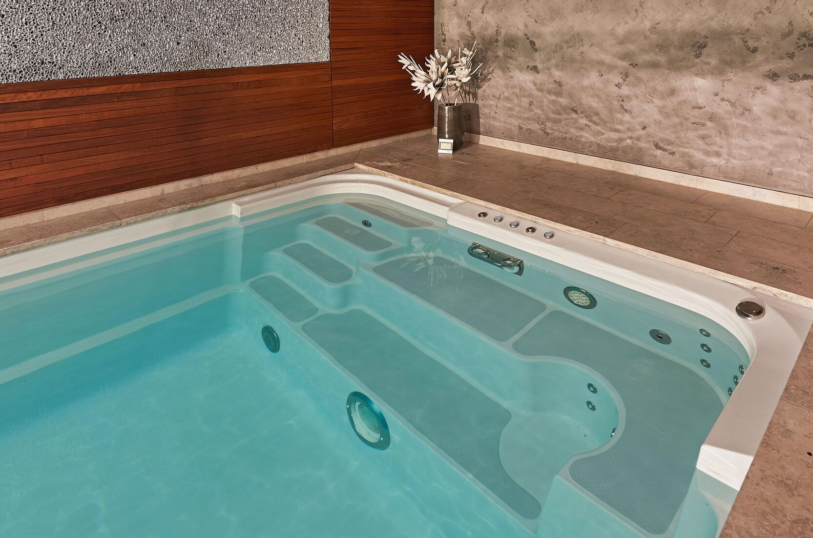 Het visueel zeer geslaagde zwembadcomplex met relaxzone is zowel geschikt voor zwemtraining als voor ontspanning na een zware dag. Een wens van de opdrachtgever was een complex dat met weinig onderhoud kan worden onderhouden. De oplossing kwam van de volautomatische waterbehandeling van Ospa. De meet- en regeltechniek Ospa-BlueControl® bewaakt niet alleen het gehele proces van waterbehandeling, maar maakt ook een eenvoudige en comfortabele bediening van alle waterattracties mogelijk, zoals de tegenstroominstallatie of het massagestation via een touchscreen direct in het zwembad.