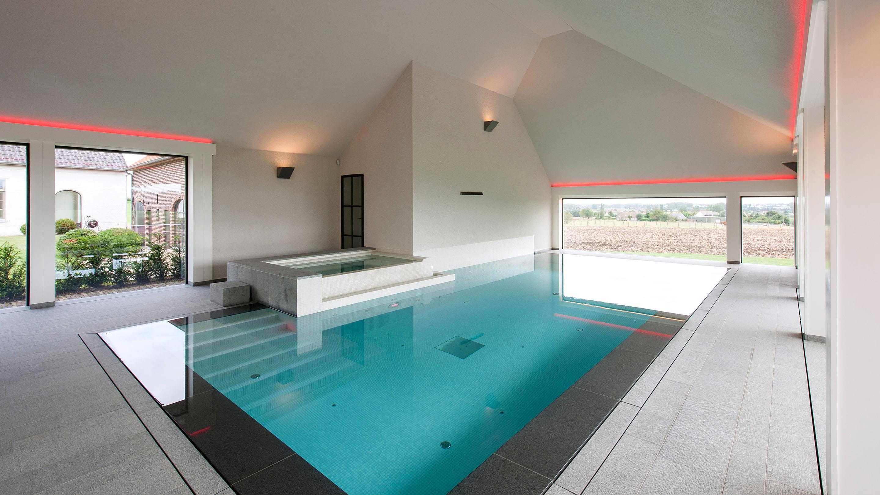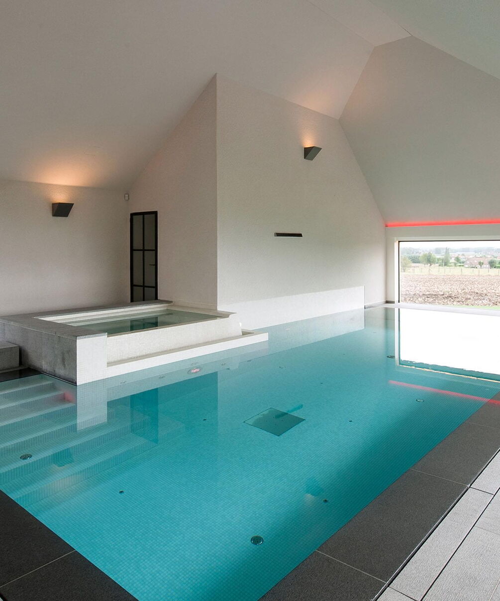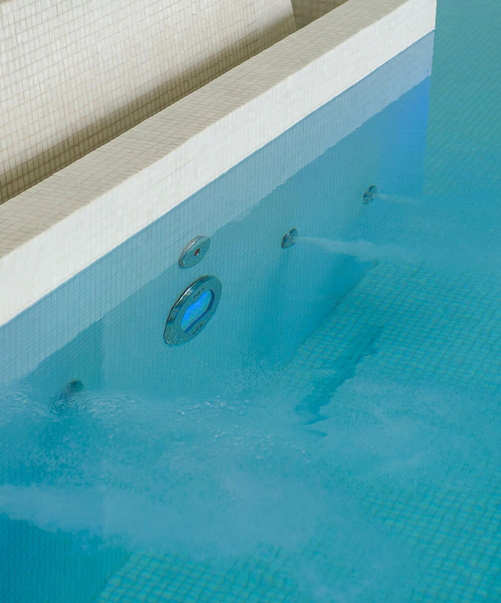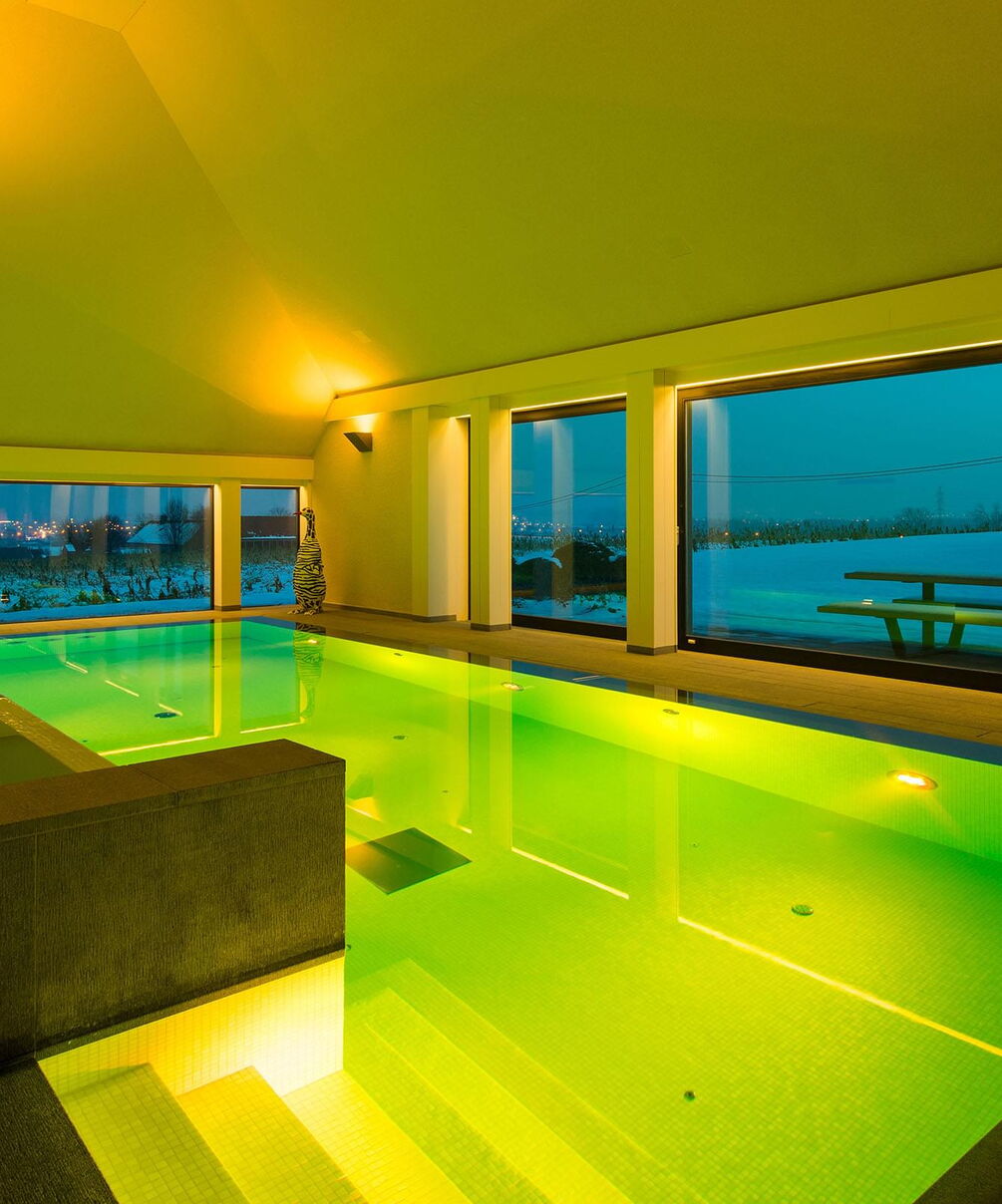 Voor de betegeling van het zwembad en de whirlpool zijn gedekte, natuurlijke kleuren gekozen. Ze vormen een stijlvol contrast met het water en geven de ruimte een heldere uitstraling. Vloer-tot-plafond ramen zorgen overdag voor maximale transparantie en bieden een vrij uitzicht over het terras tot in de tuin. 's Avonds verandert de installatie dankzij een uitgekiend verlichtingssysteem in een ware transformatiekunstenaar. Maar niet alleen het uiterlijk van de installatie is opzienbarend, ook de waterattracties laten niets te wensen over.