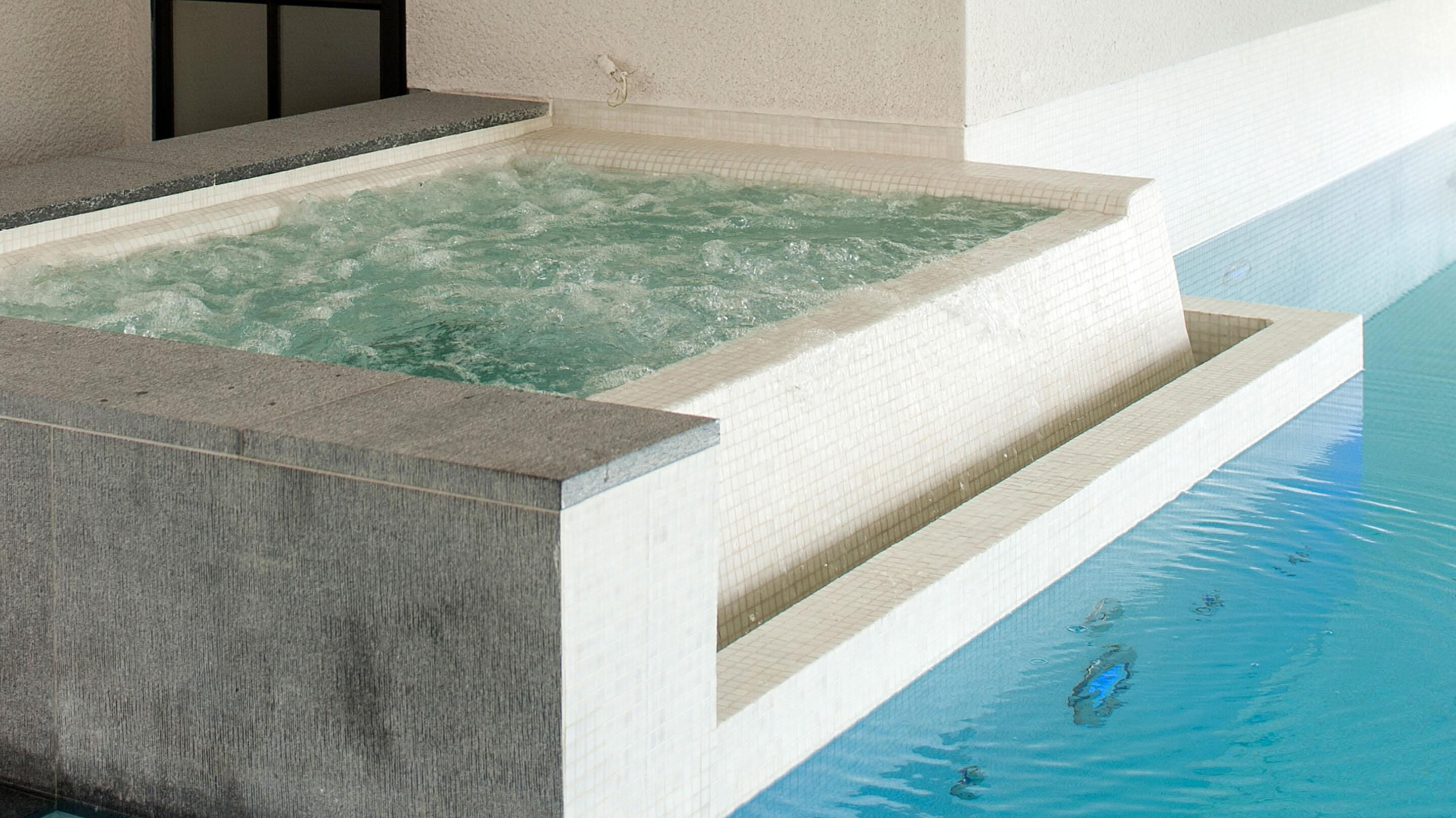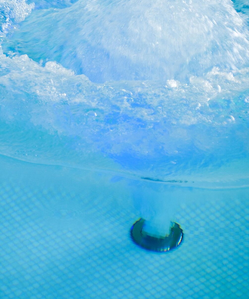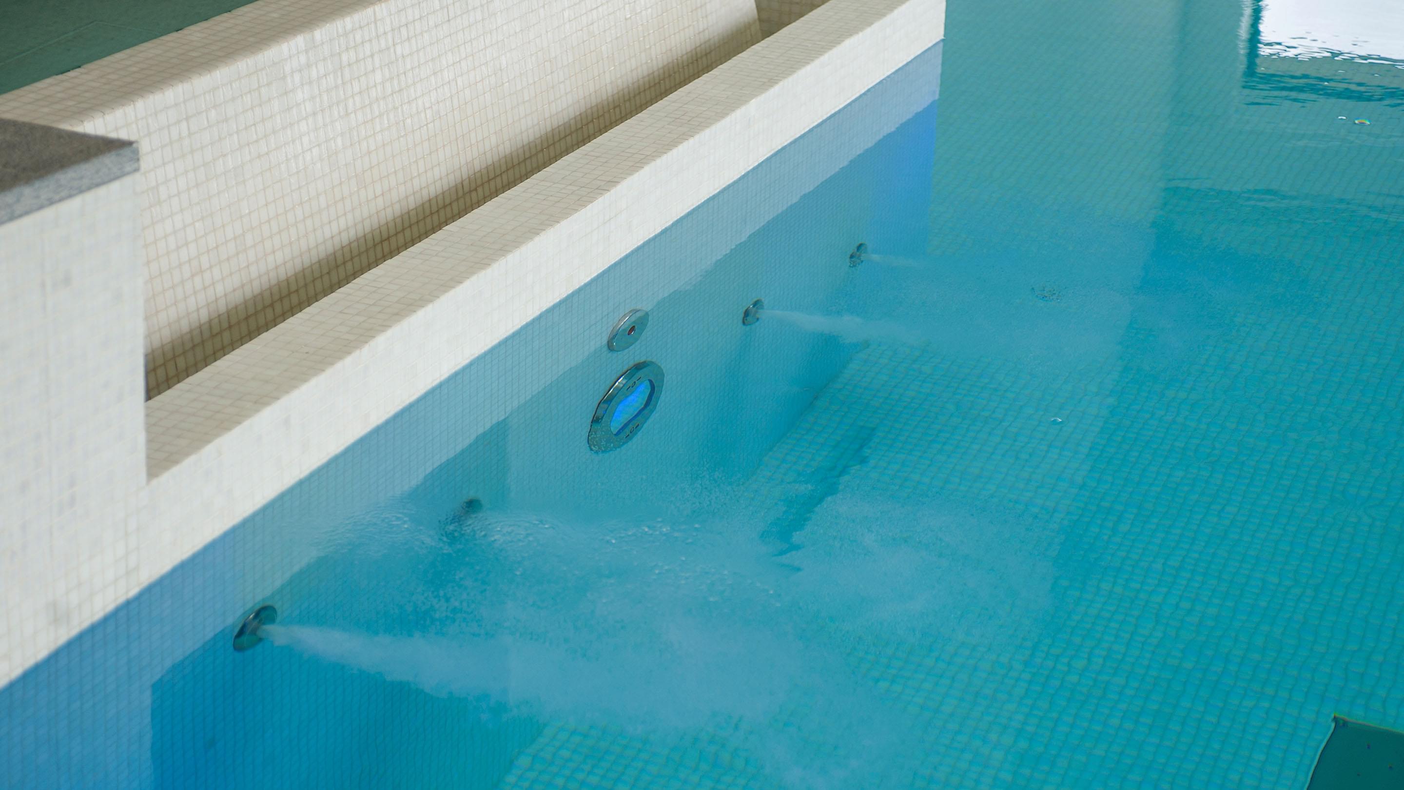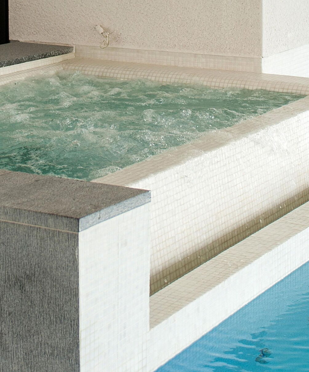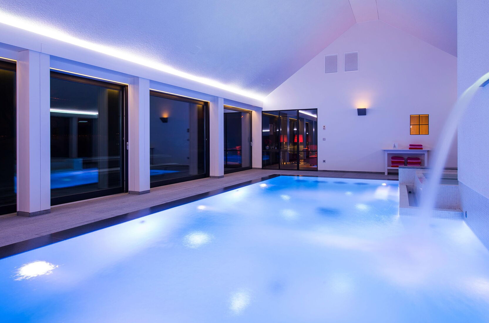 Voor de betegeling van het zwembad en de whirlpool zijn gedekte, natuurlijke kleuren gekozen. Ze vormen een stijlvol contrast met het water en geven de ruimte een heldere uitstraling. Vloer-tot-plafond ramen zorgen overdag voor maximale transparantie en bieden een vrij uitzicht over het terras tot in de tuin. 's Avonds verandert de installatie dankzij een uitgekiend verlichtingssysteem in een ware transformatiekunstenaar. Maar niet alleen het uiterlijk van de installatie is opzienbarend, ook de waterattracties laten niets te wensen over.