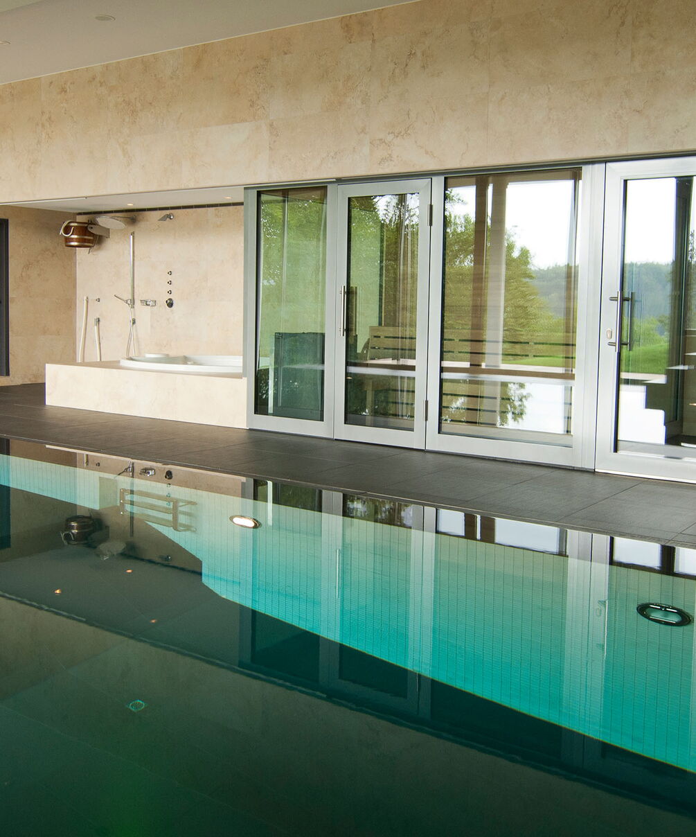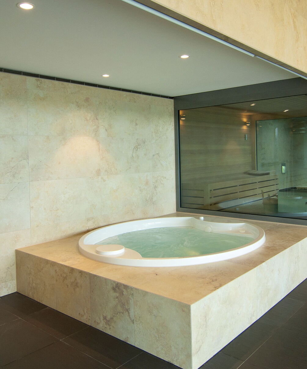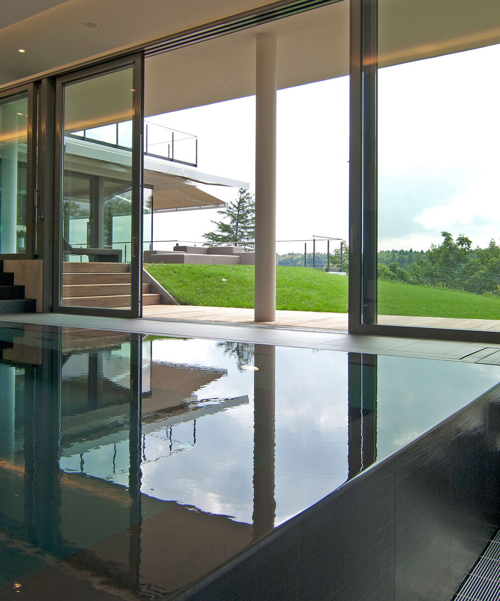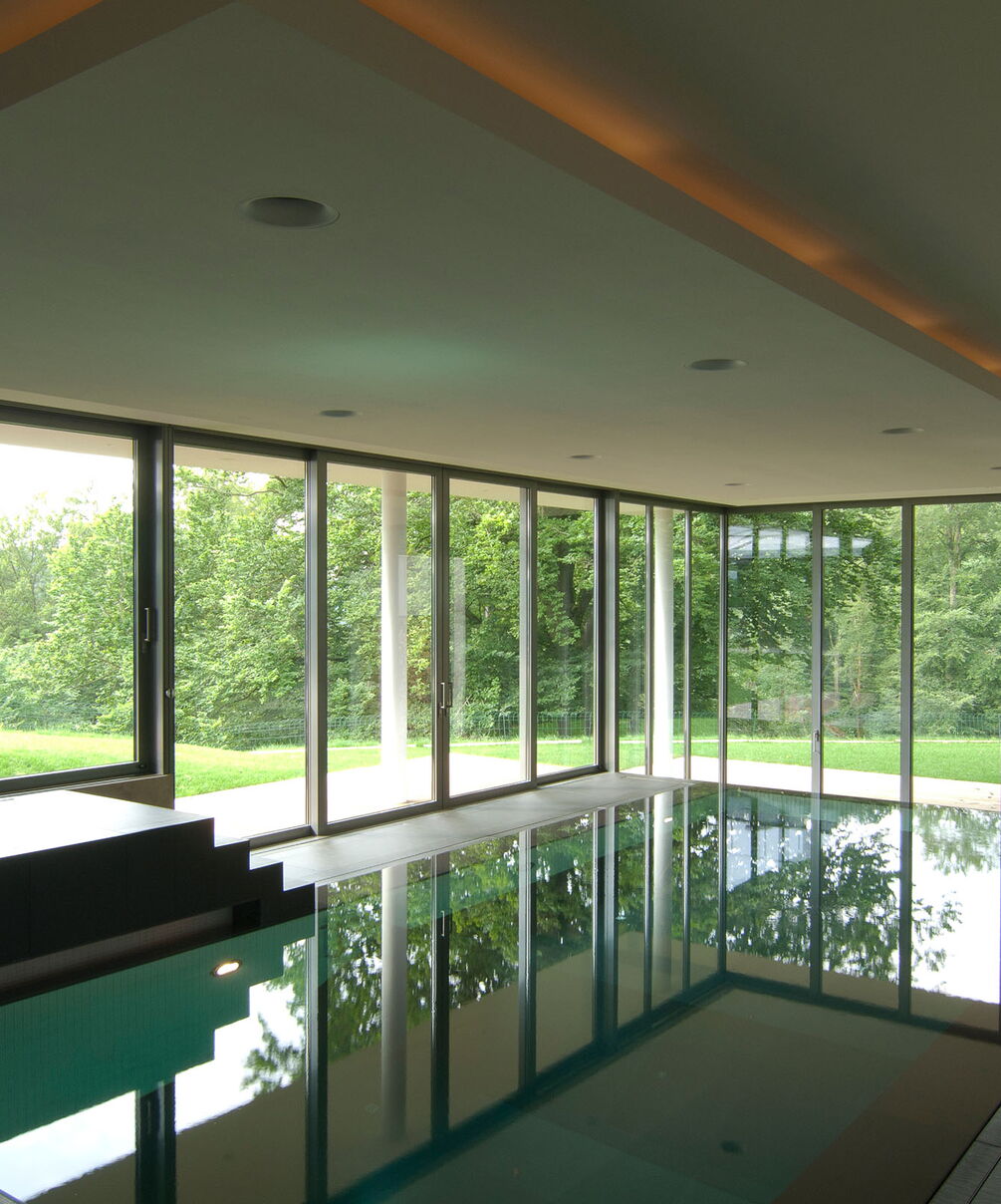 Drie verspringende niveaus en natuurlijke materialen zorgen voor een buitengewone ruimtebeleving, de uitrusting is luxueus: Van het zwembad met onderwaterverlichting en massagestralen tot de watervaldouche en de glazen panoramasauna is aan alles gedacht. De doordachte Ospa zwembadtechnologie zorgt voor weldadig water en optimale energie-efficiëntie. Zo kunt u in alle rust genieten van het spectaculaire uitzicht op het parklandschap buiten.