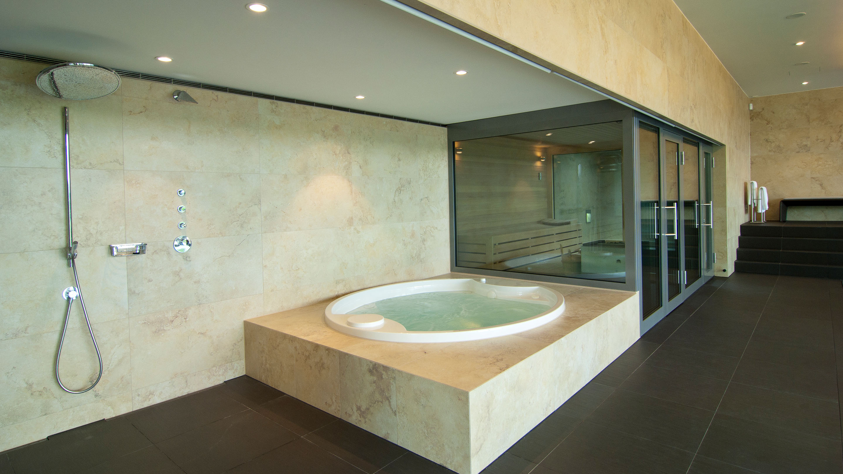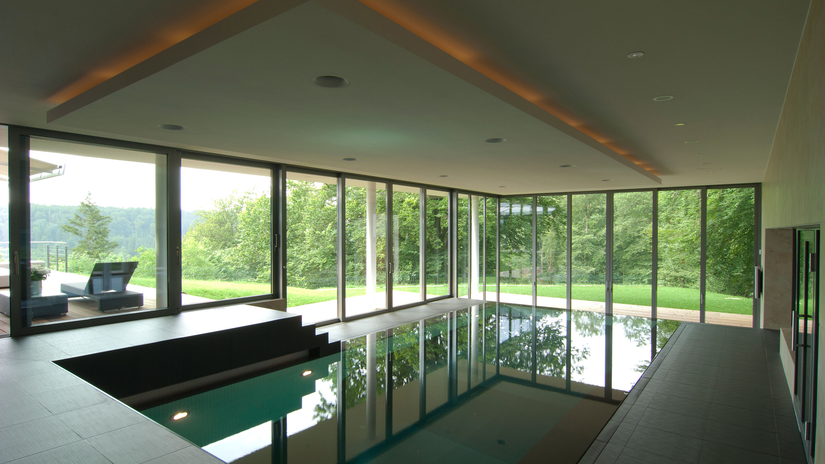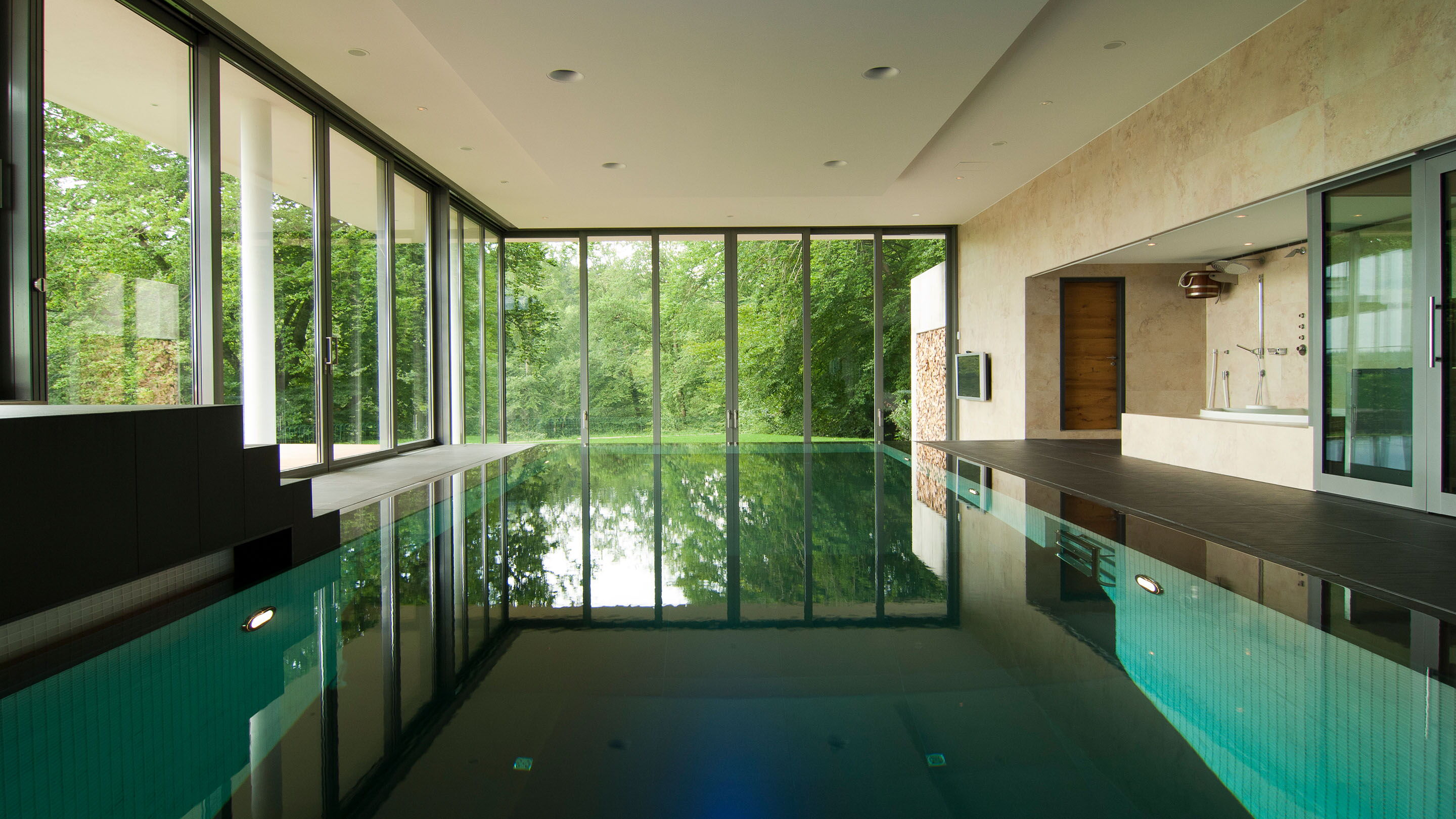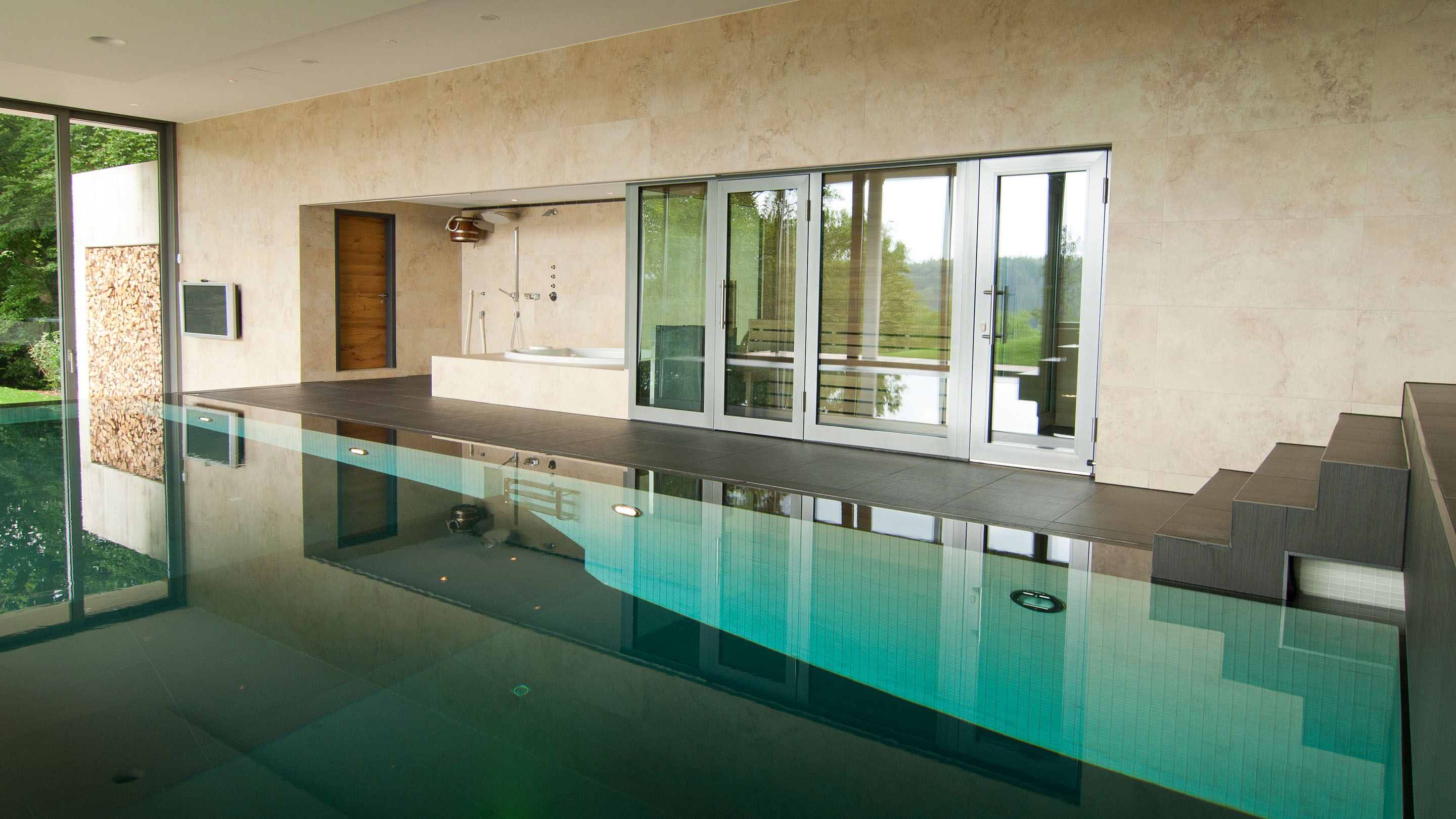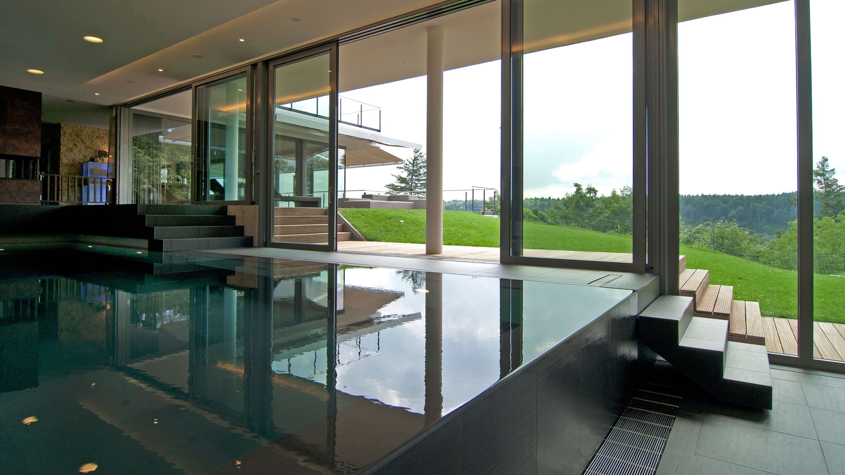 Drie verspringende niveaus en natuurlijke materialen zorgen voor een buitengewone ruimtebeleving, de uitrusting is luxueus: Van het zwembad met onderwaterverlichting en massagestralen tot de watervaldouche en de glazen panoramasauna is aan alles gedacht. De doordachte Ospa zwembadtechnologie zorgt voor weldadig water en optimale energie-efficiëntie. Zo kunt u in alle rust genieten van het spectaculaire uitzicht op het parklandschap buiten.