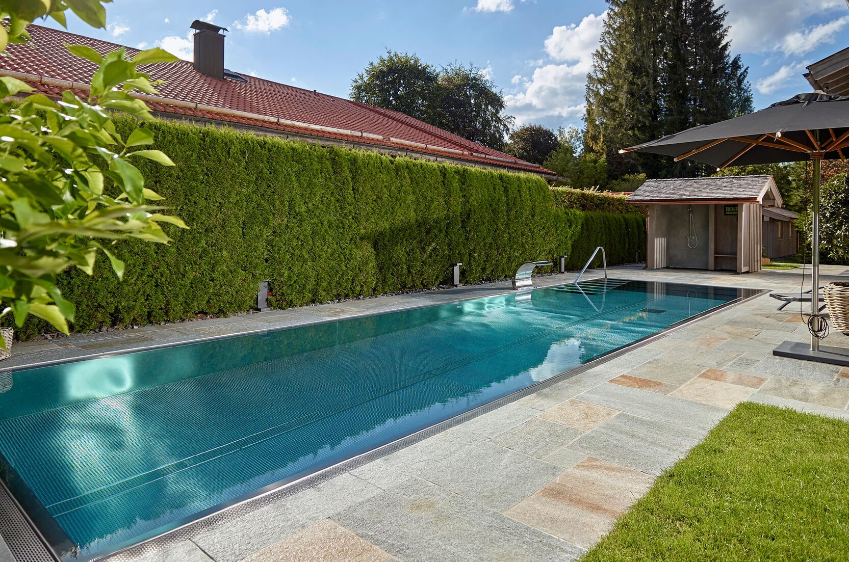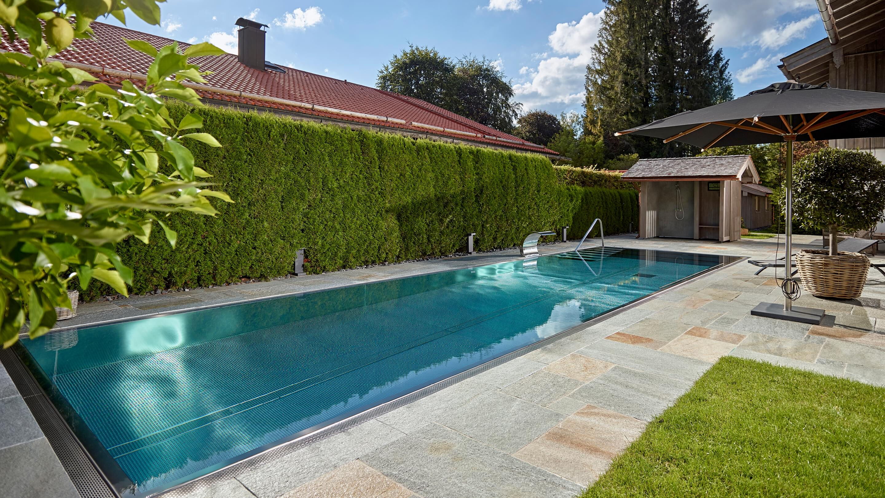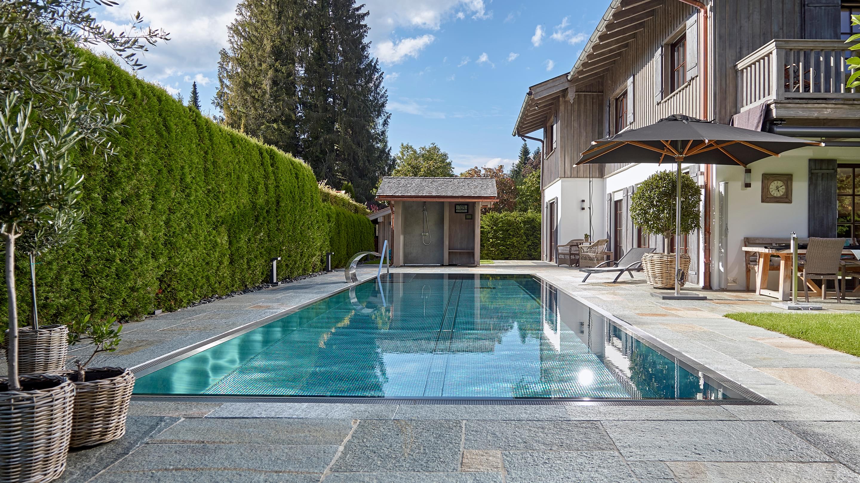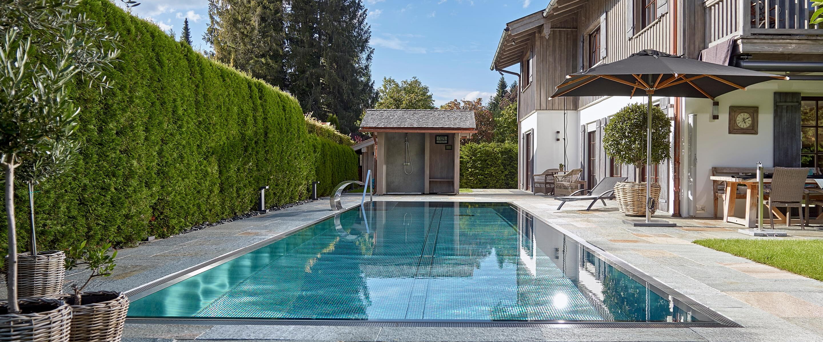 Hart, wat wil je nog meer?! Huis, tuin en zwembad vormen een harmonieus geheel, vooral omdat het zwembad is omgeven door dezelfde natuursteenplaten als het terras. Het doel van het zwembad is om sport en wellness te combineren. Daarom koos Bernhard Alt, een van onze deskundige adviseurs, voor een zwembad met een lengte van 12,50 meter en een breedte van 3,40 meter. Zo kan er zowel klassiek worden gezwommen als worden genoten van waterattracties.