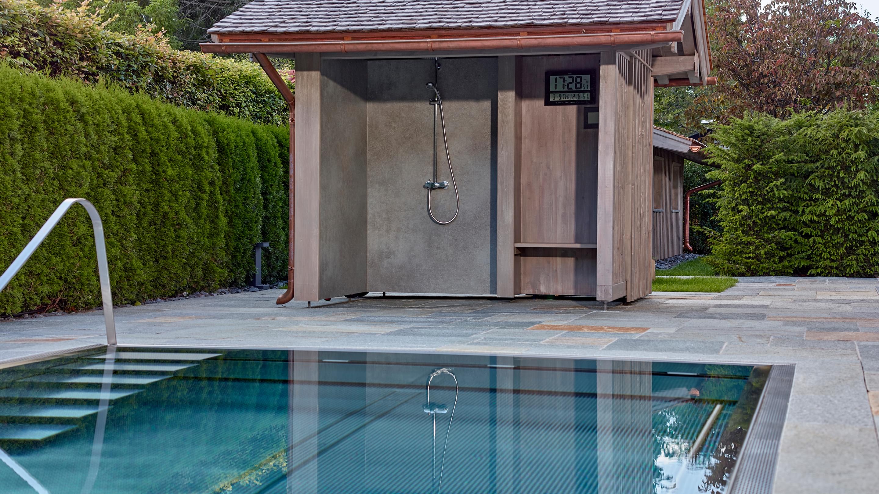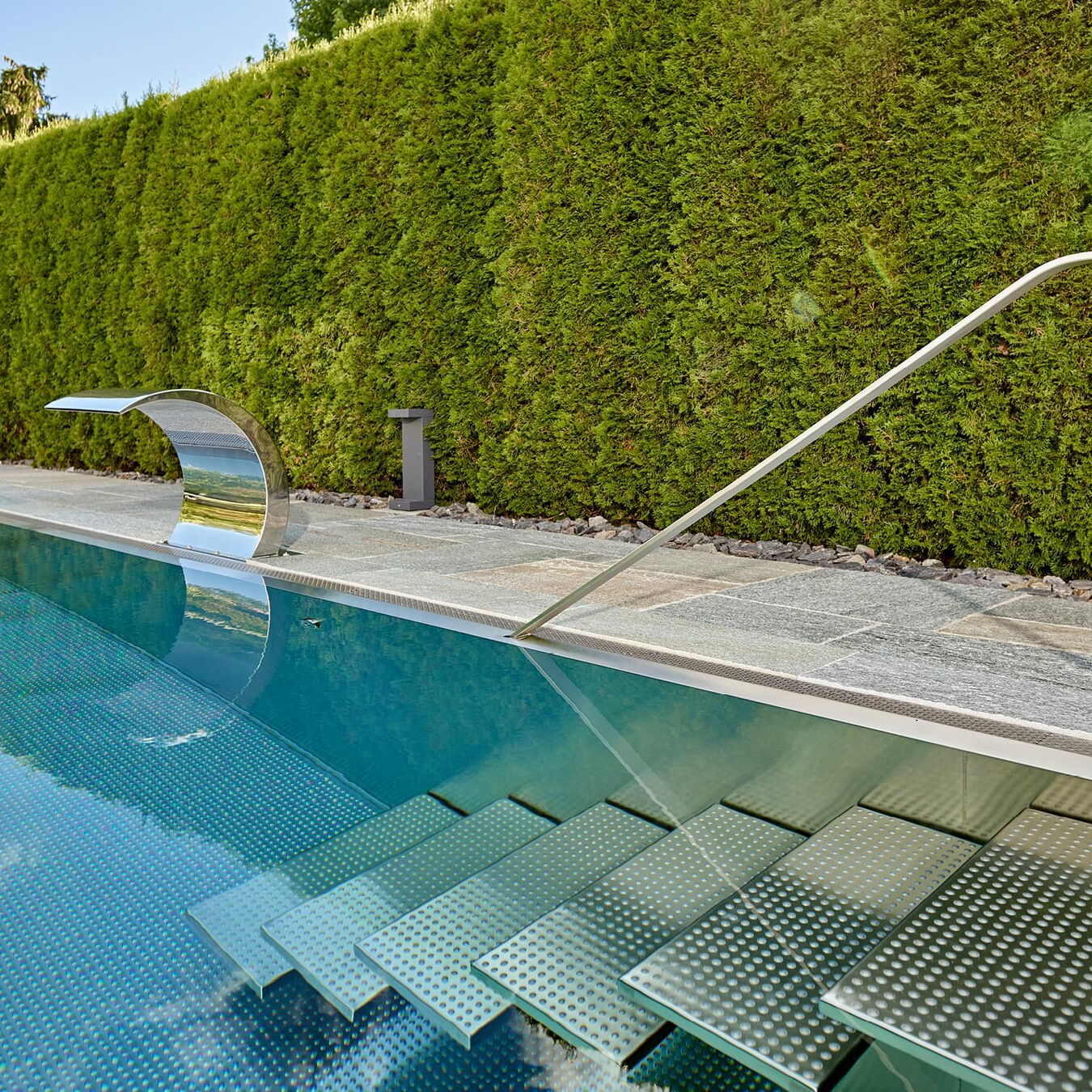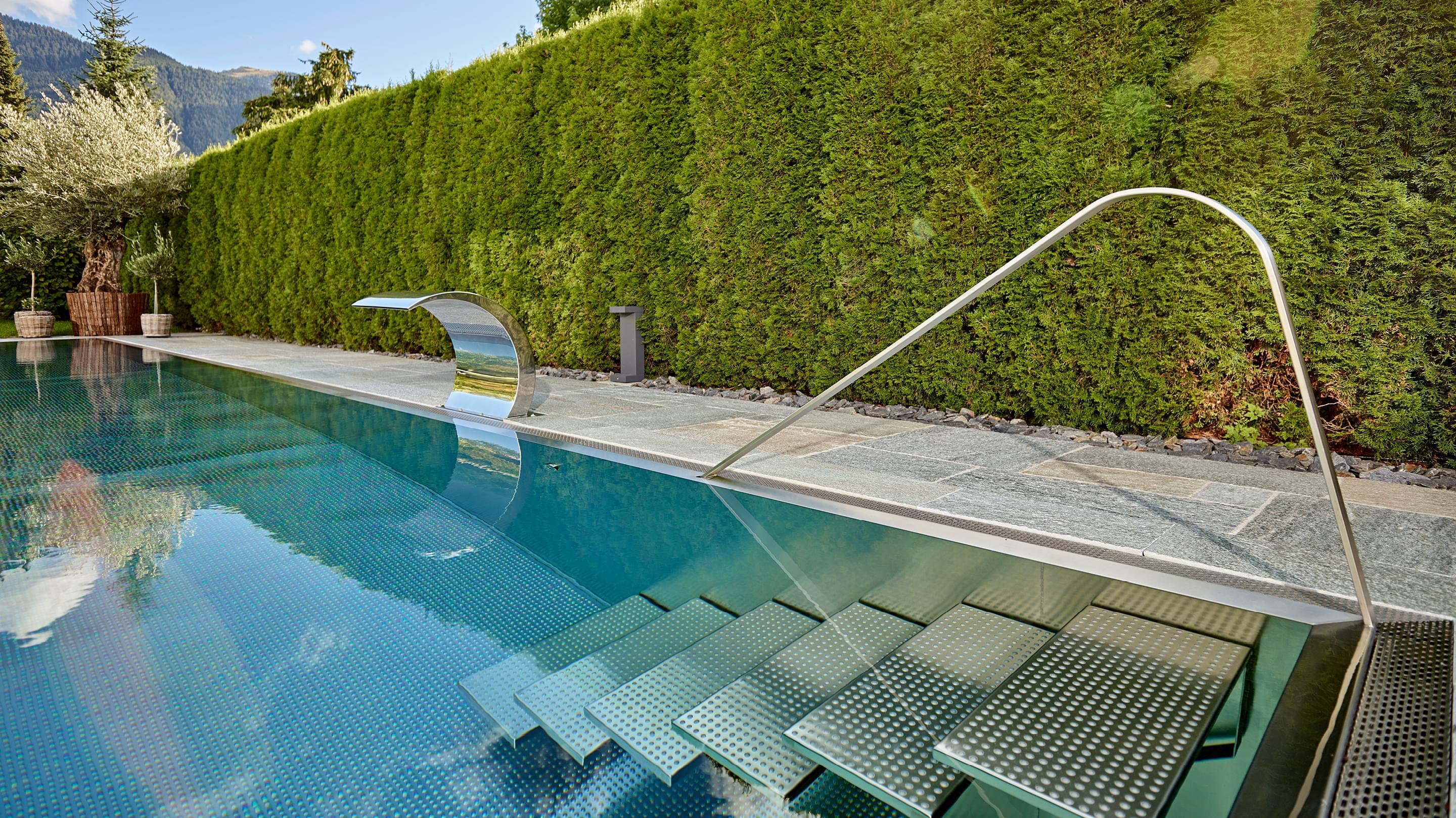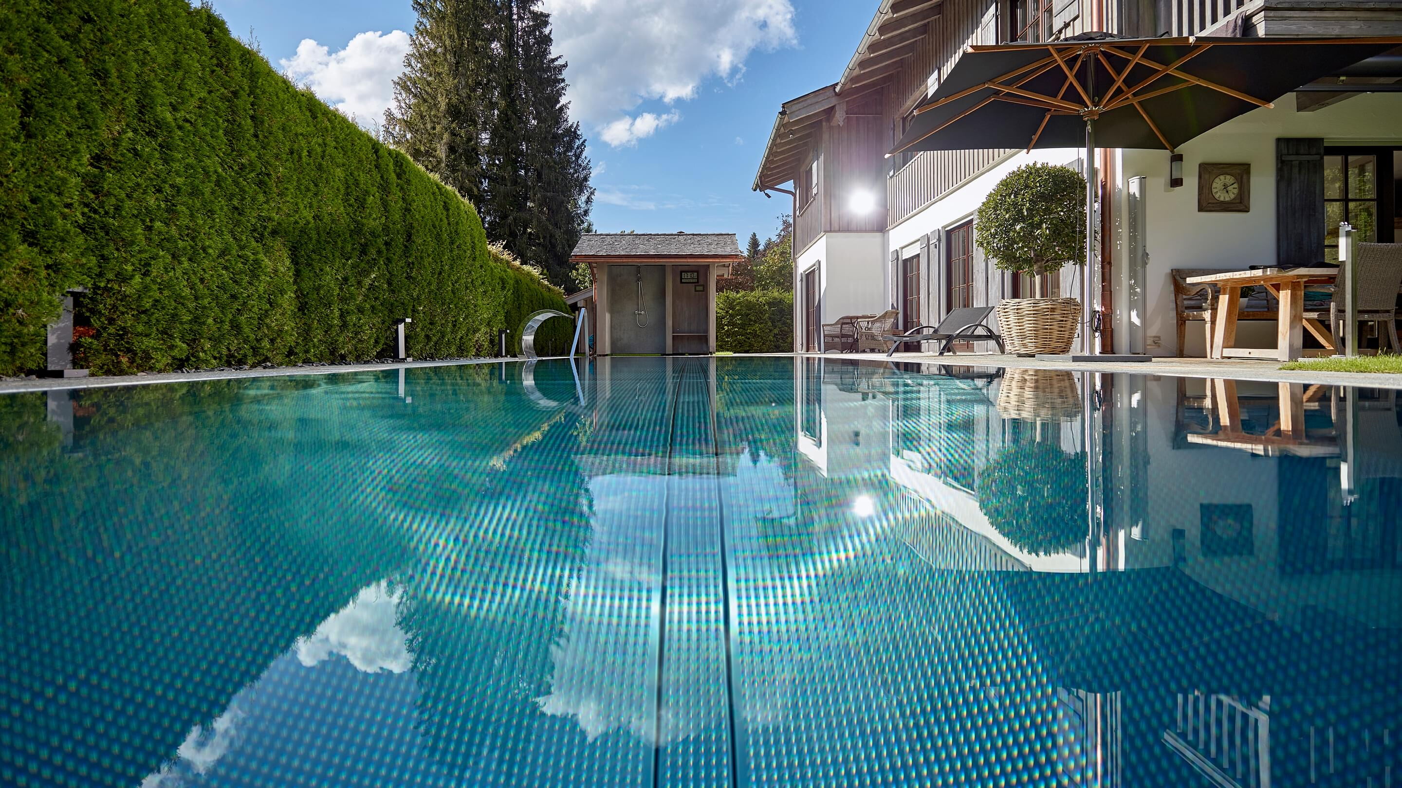 Hart, wat wil je nog meer?! Huis, tuin en zwembad vormen een harmonieus geheel, vooral omdat het zwembad is omgeven door dezelfde natuursteenplaten als het terras. Het doel van het zwembad is om sport en wellness te combineren. Daarom koos Bernhard Alt, een van onze deskundige adviseurs, voor een zwembad met een lengte van 12,50 meter en een breedte van 3,40 meter. Zo kan er zowel klassiek worden gezwommen als worden genoten van waterattracties.