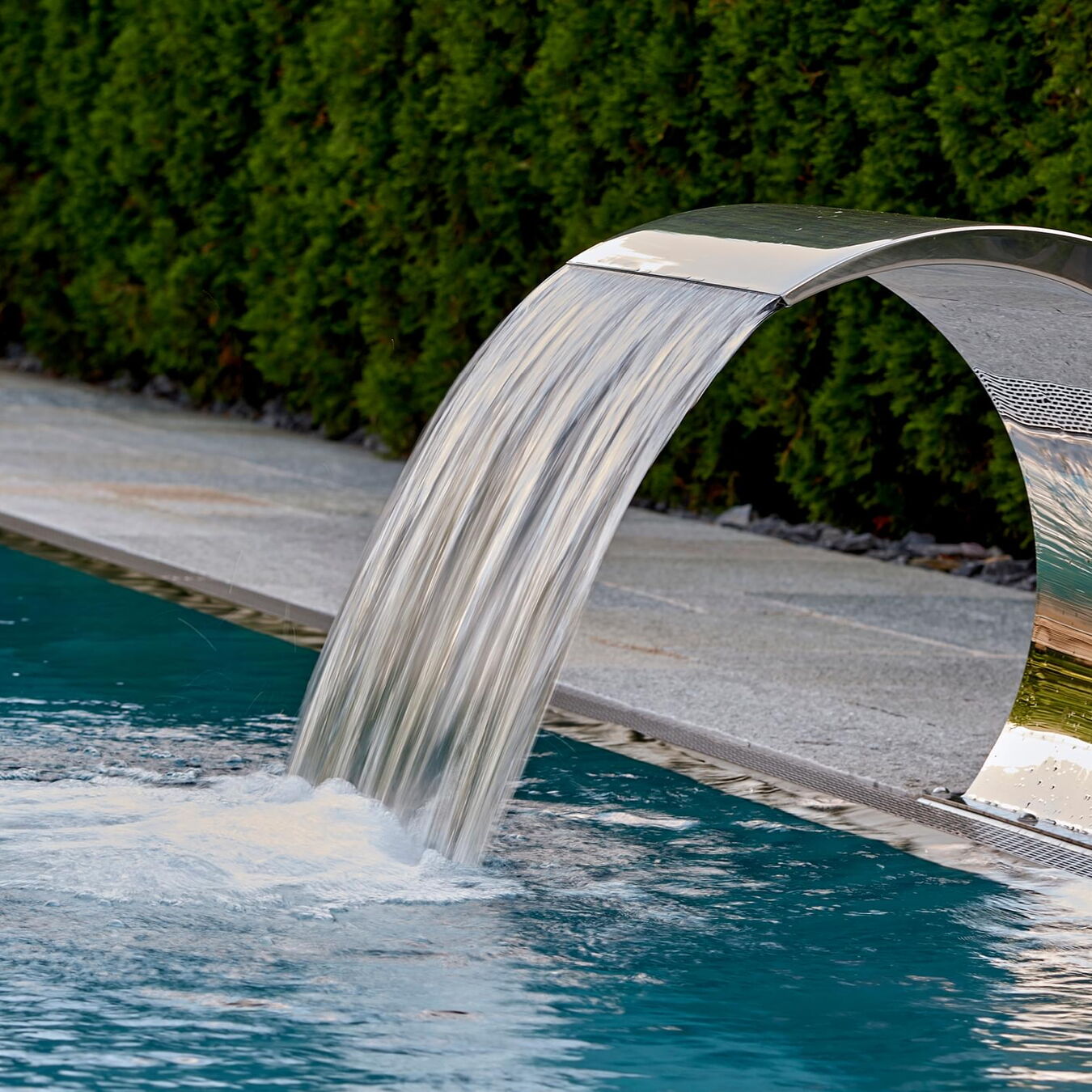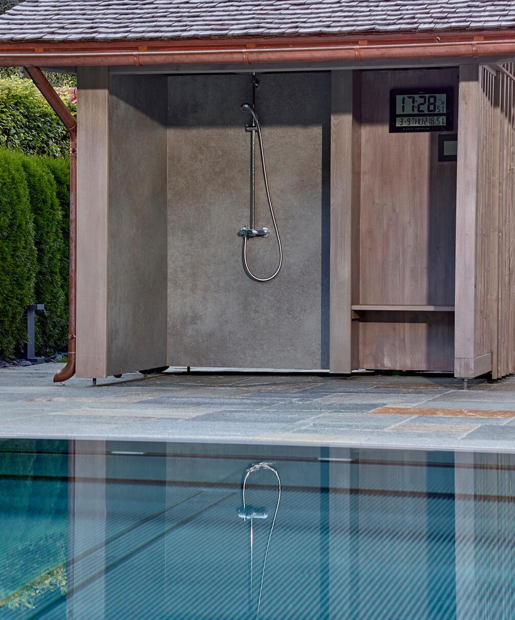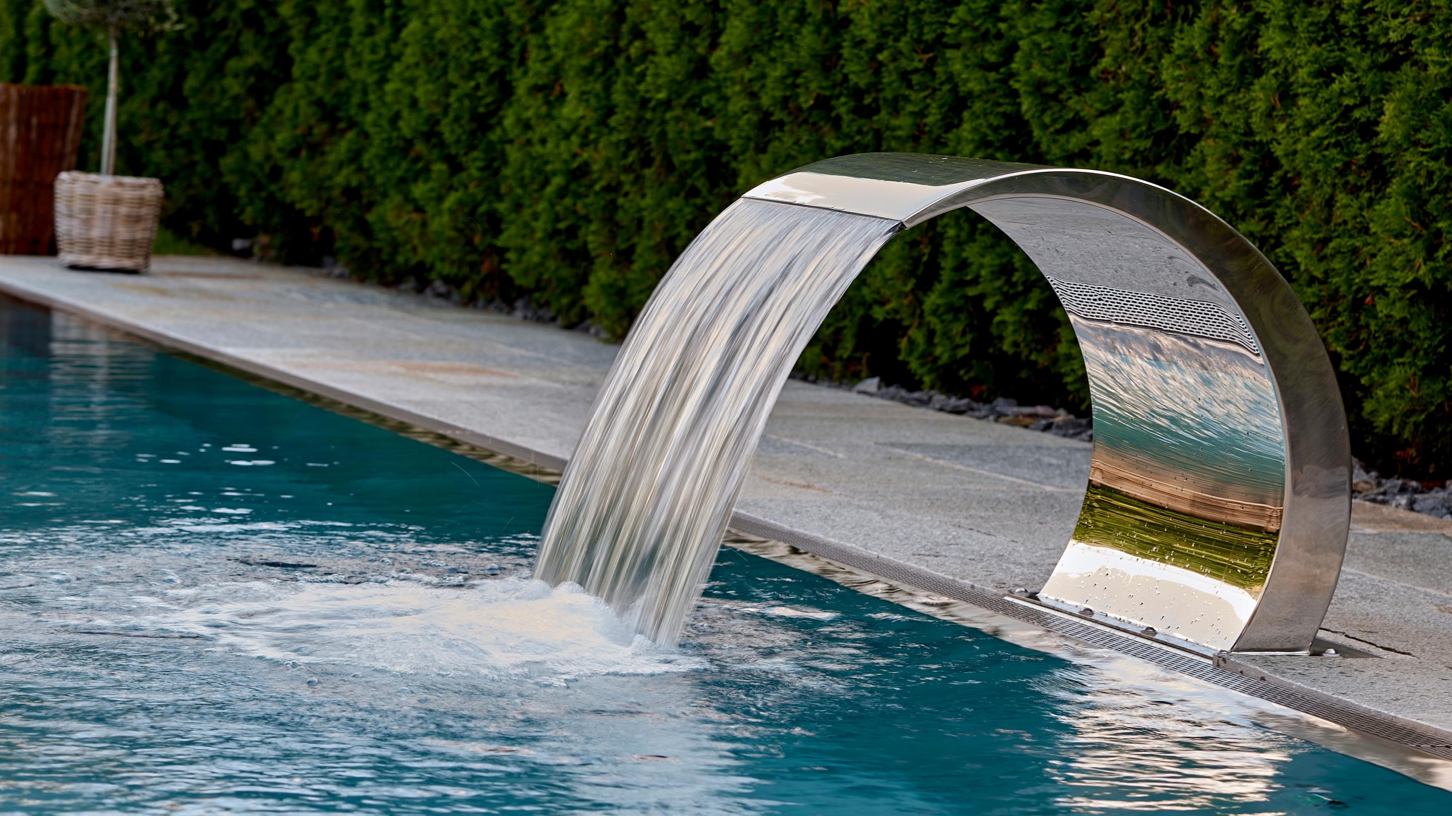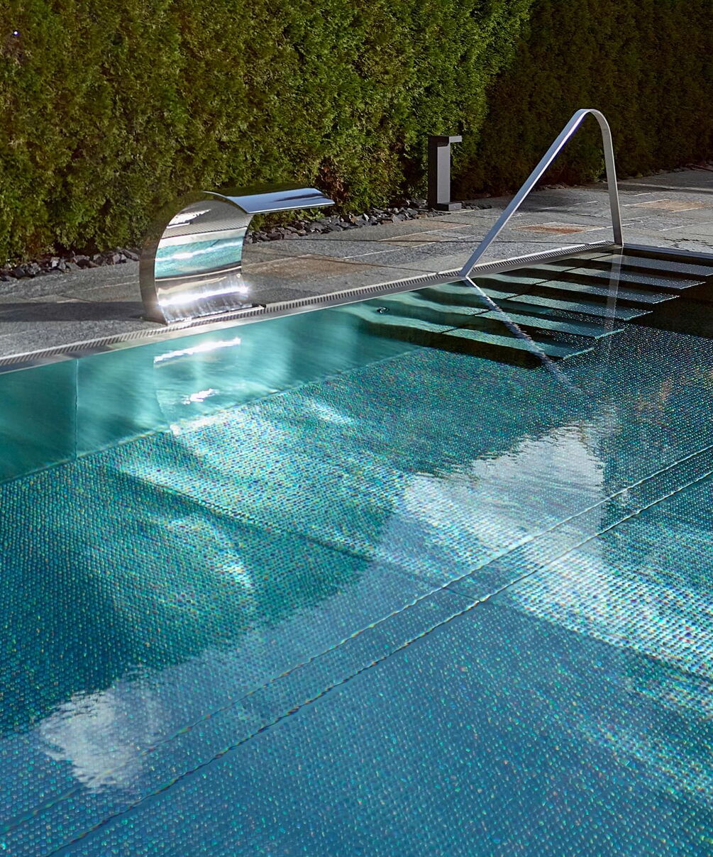 Hart, wat wil je nog meer?! Huis, tuin en zwembad vormen een harmonieus geheel, vooral omdat het zwembad is omgeven door dezelfde natuursteenplaten als het terras. Het doel van het zwembad is om sport en wellness te combineren. Daarom koos Bernhard Alt, een van onze deskundige adviseurs, voor een zwembad met een lengte van 12,50 meter en een breedte van 3,40 meter. Zo kan er zowel klassiek worden gezwommen als worden genoten van waterattracties.