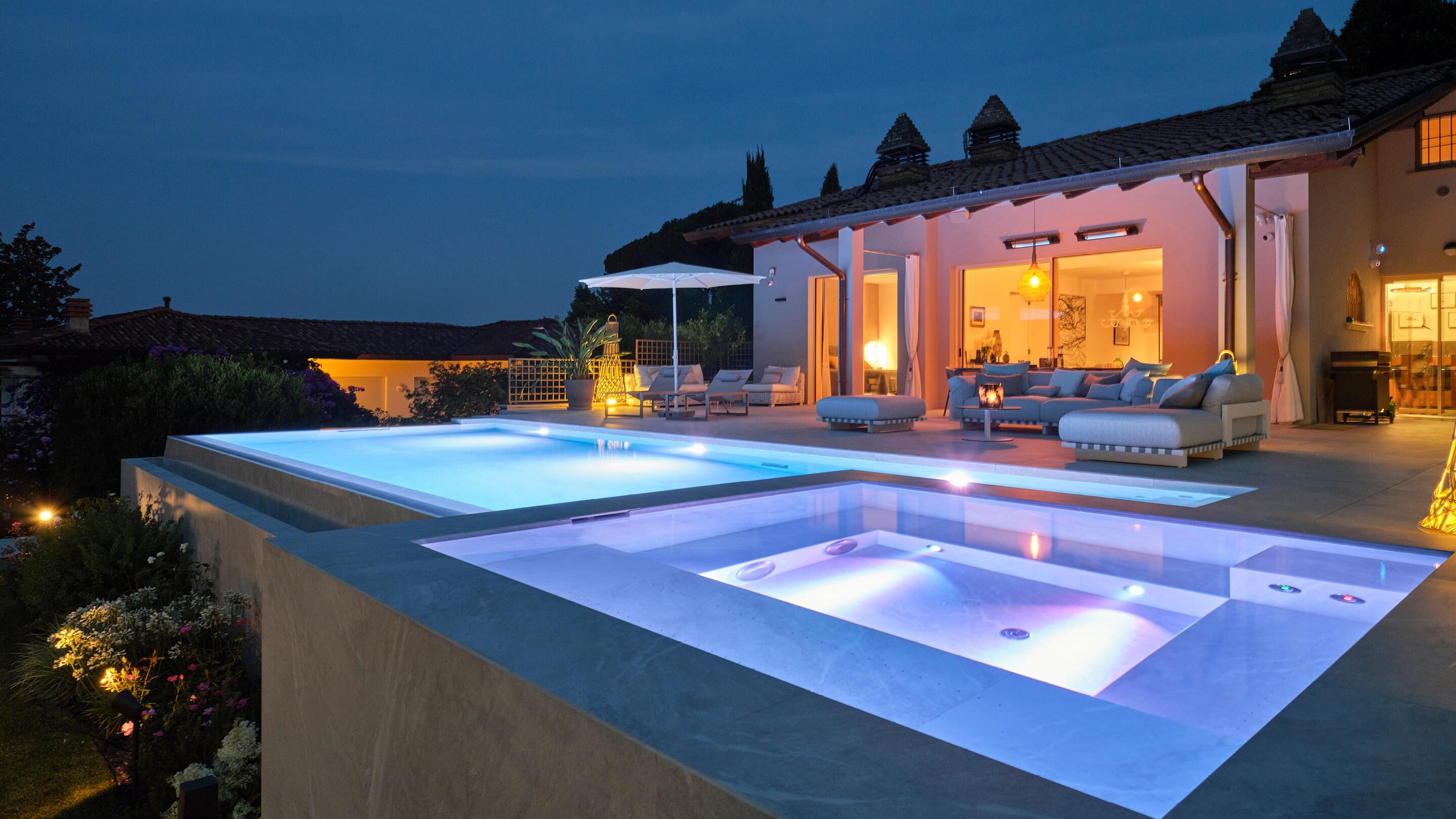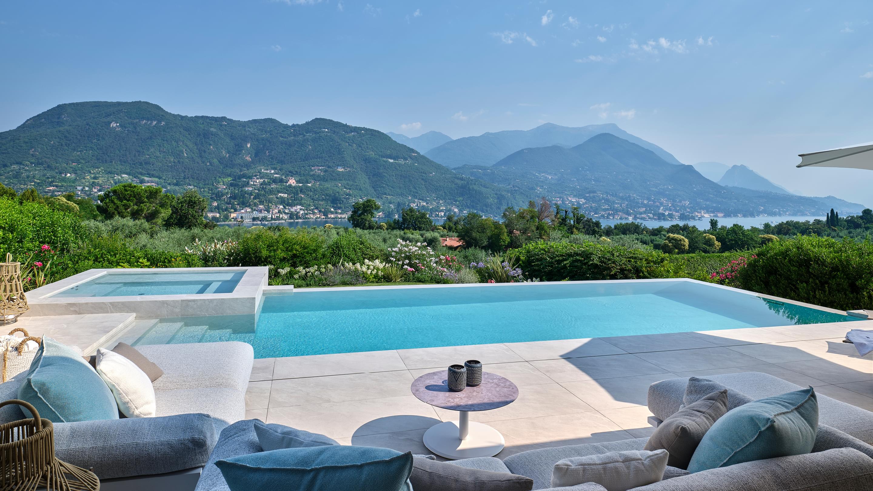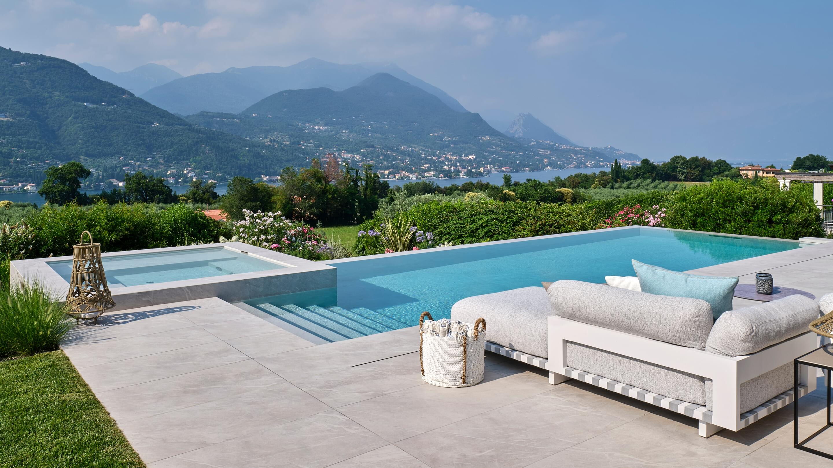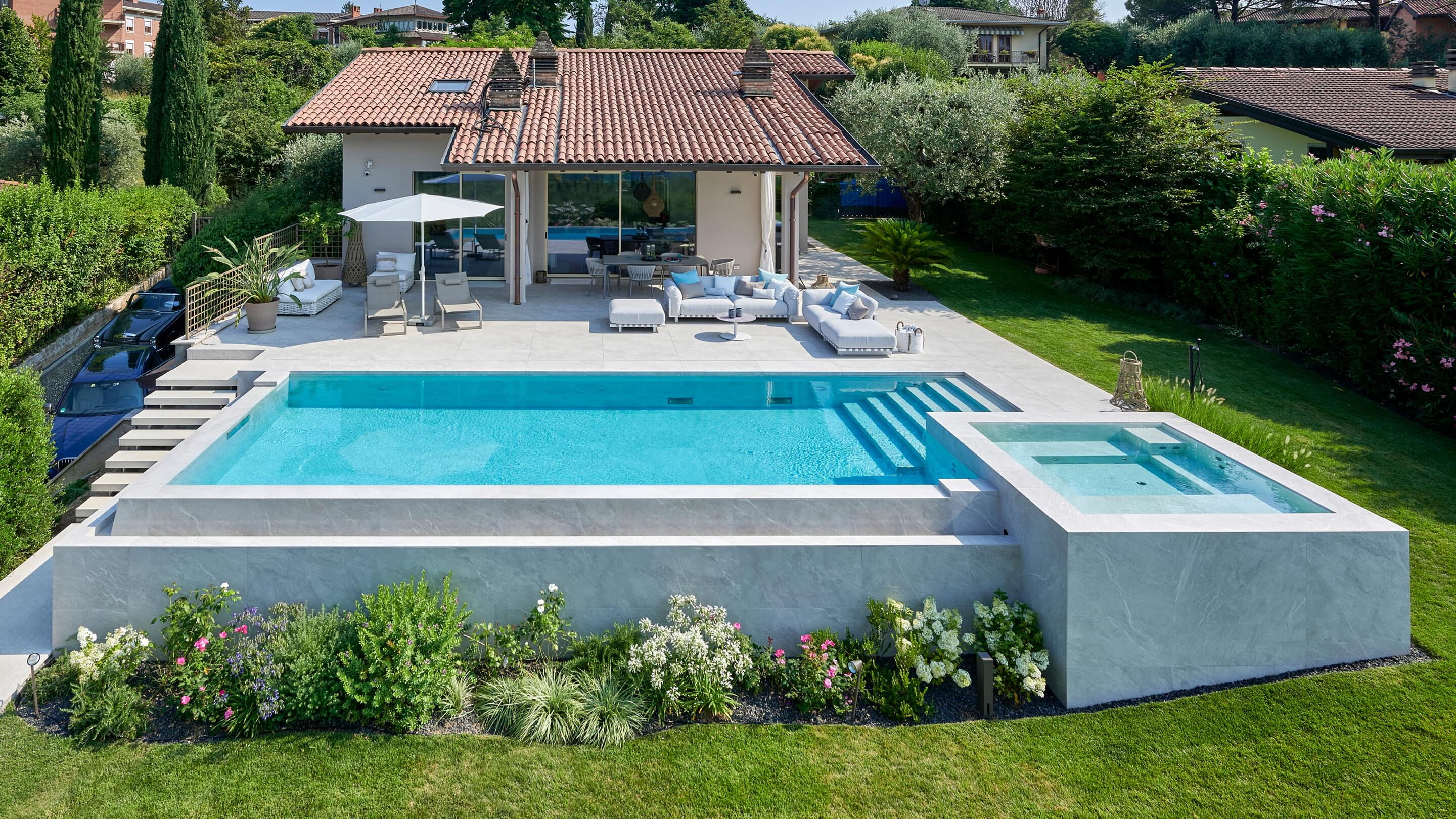 Wat de eigenaren vanaf de eerste dag zo enthousiast maakte over hun rustig gelegen perceel aan het Gardameer, was de fantastische ligging. Op 75 m boven het meer heeft men een vrij uitzicht op de omliggende bergen en de “Golfo di Salò”. Nu ontbrak alleen nog het juiste zwembad. De tuin bood voldoende mogelijkheden om hun eigen ideeën voor een zwembadlandschap te realiseren: een buitenzwembad met infinity-rand aan twee zijden plus whirlpool. Het betegelde betonnen bassin met brede trap meet 10,40 x 4,00 meter en heeft een waterdiepte van 1,4 meter. De aparte whirlpool heeft een wateroppervlakte van 2,4 × 2,4 meter. Tot de uitrusting van het zwembad behoren een Ospa-TopSwim 3 tegenstroominstallatie en massagestation Ospa-MassageT Air. De whirlpool heeft twee traploos instelbare ventilatoren, waarvan één voor de massageligstoel en de andere voor de zitbanken en het voetengedeelte. Daarnaast beschikt hij over een MassageT Air met voetreflexmassage. De gekleurde LED-RGBW onderwaterverlichting zorgt voor sfeervolle avonden bij het zwembad.
