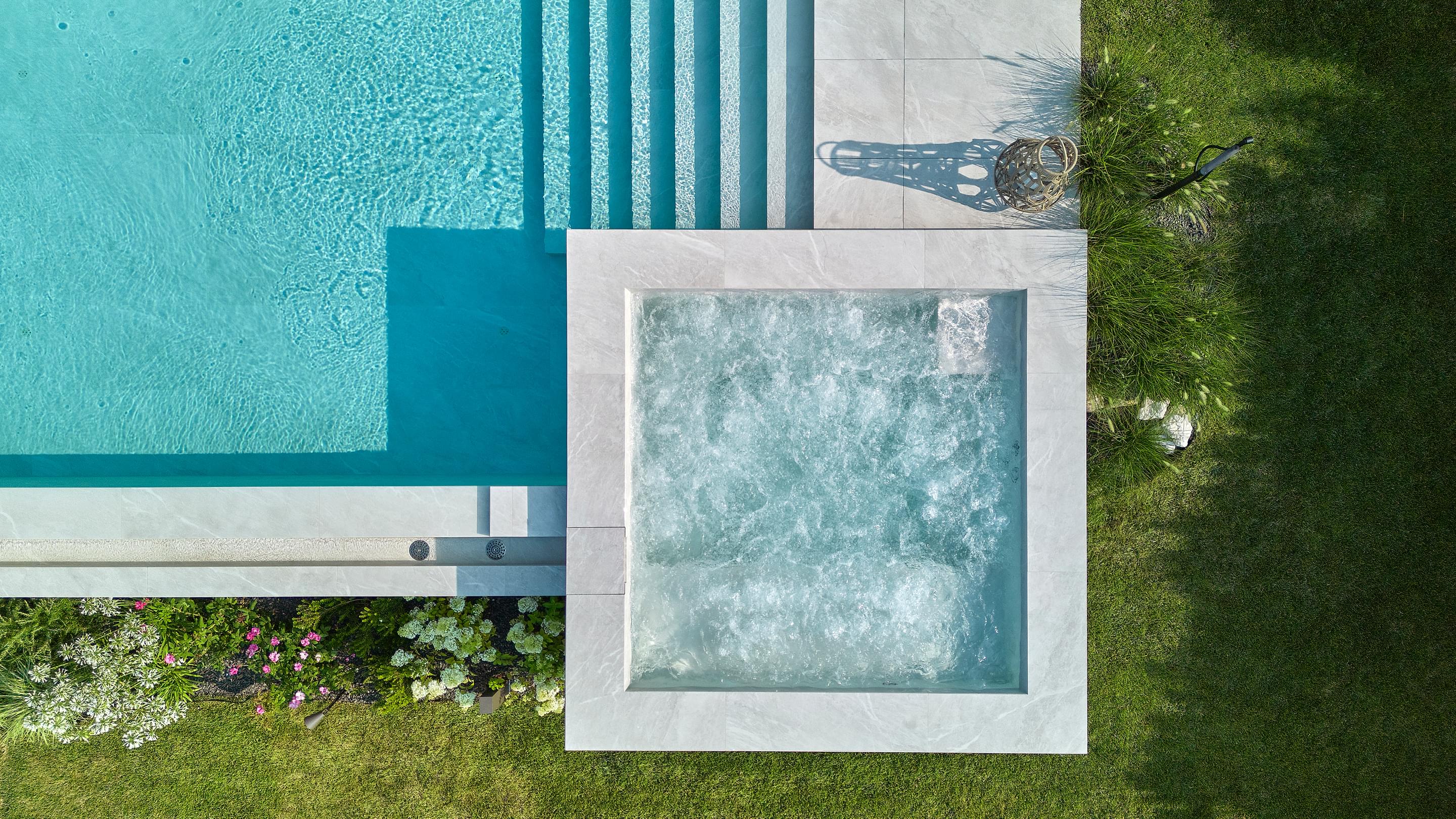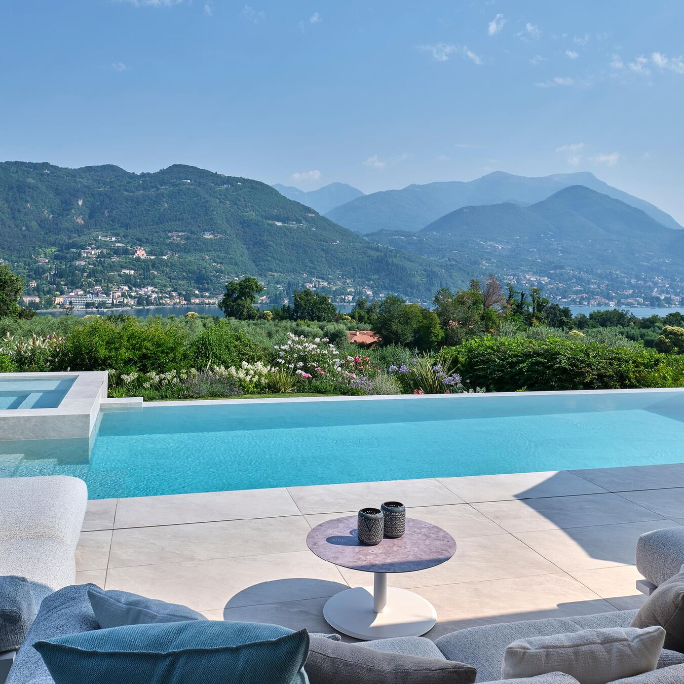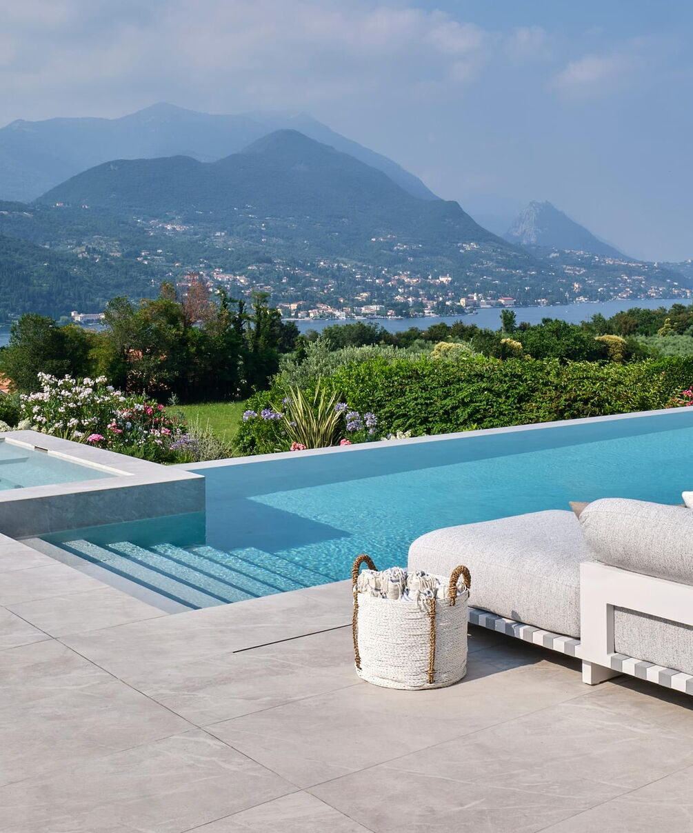 Wat de eigenaren vanaf de eerste dag zo enthousiast maakte over hun rustig gelegen perceel aan het Gardameer, was de fantastische ligging. Op 75 m boven het meer heeft men een vrij uitzicht op de omliggende bergen en de “Golfo di Salò”. Nu ontbrak alleen nog het juiste zwembad. De tuin bood voldoende mogelijkheden om hun eigen ideeën voor een zwembadlandschap te realiseren: een buitenzwembad met infinity-rand aan twee zijden plus whirlpool. Het betegelde betonnen bassin met brede trap meet 10,40 x 4,00 meter en heeft een waterdiepte van 1,4 meter. De aparte whirlpool heeft een wateroppervlakte van 2,4 × 2,4 meter. Tot de uitrusting van het zwembad behoren een Ospa-TopSwim 3 tegenstroominstallatie en massagestation Ospa-MassageT Air. De whirlpool heeft twee traploos instelbare ventilatoren, waarvan één voor de massageligstoel en de andere voor de zitbanken en het voetengedeelte. Daarnaast beschikt hij over een MassageT Air met voetreflexmassage. De gekleurde LED-RGBW onderwaterverlichting zorgt voor sfeervolle avonden bij het zwembad.