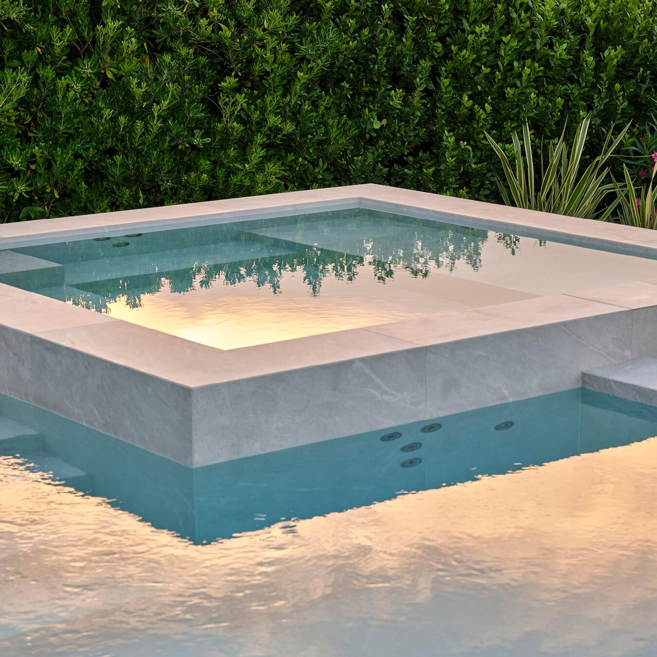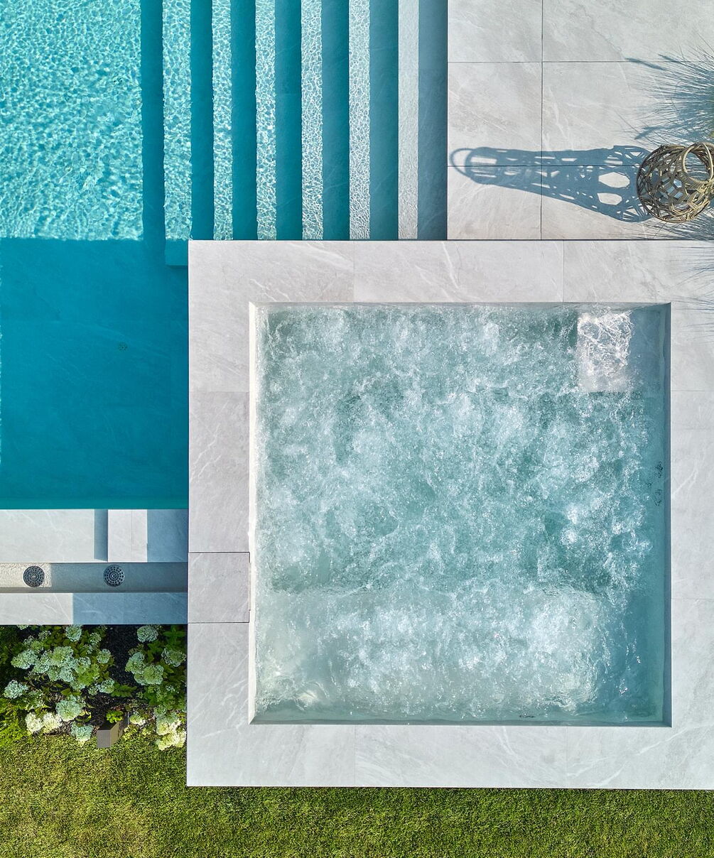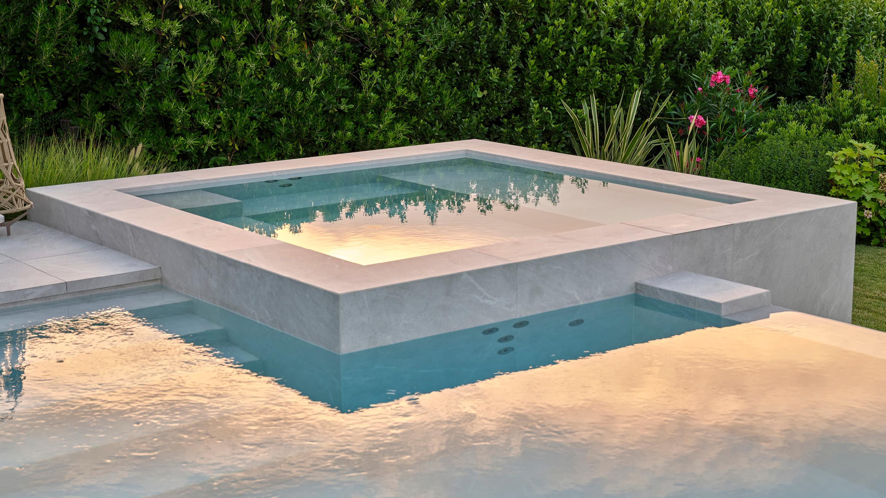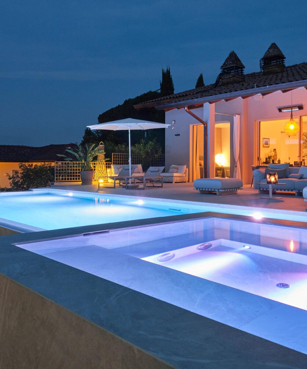 Wat de eigenaren vanaf de eerste dag zo enthousiast maakte over hun rustig gelegen perceel aan het Gardameer, was de fantastische ligging. Op 75 m boven het meer heeft men een vrij uitzicht op de omliggende bergen en de “Golfo di Salò”. Nu ontbrak alleen nog het juiste zwembad. De tuin bood voldoende mogelijkheden om hun eigen ideeën voor een zwembadlandschap te realiseren: een buitenzwembad met infinity-rand aan twee zijden plus whirlpool. Het betegelde betonnen bassin met brede trap meet 10,40 x 4,00 meter en heeft een waterdiepte van 1,4 meter. De aparte whirlpool heeft een wateroppervlakte van 2,4 × 2,4 meter. Tot de uitrusting van het zwembad behoren een Ospa-TopSwim 3 tegenstroominstallatie en massagestation Ospa-MassageT Air. De whirlpool heeft twee traploos instelbare ventilatoren, waarvan één voor de massageligstoel en de andere voor de zitbanken en het voetengedeelte. Daarnaast beschikt hij over een MassageT Air met voetreflexmassage. De gekleurde LED-RGBW onderwaterverlichting zorgt voor sfeervolle avonden bij het zwembad.