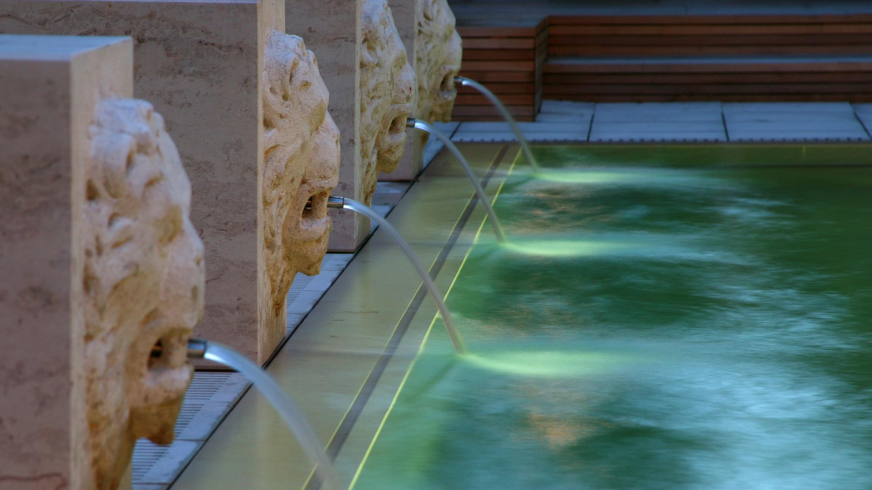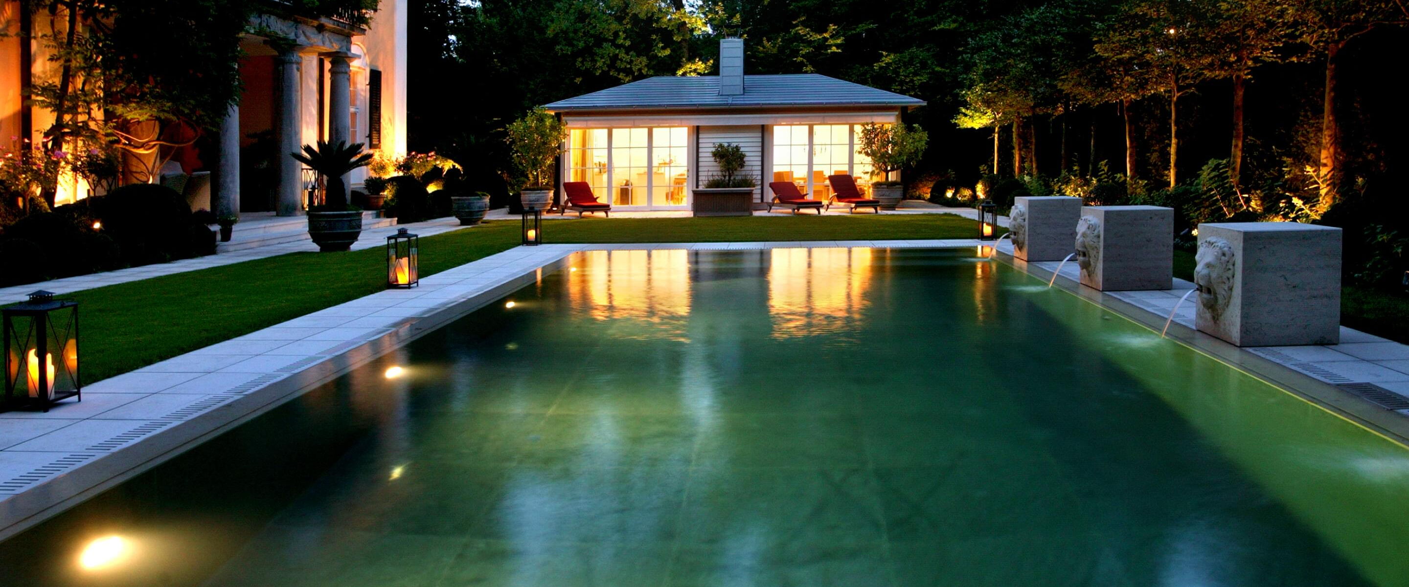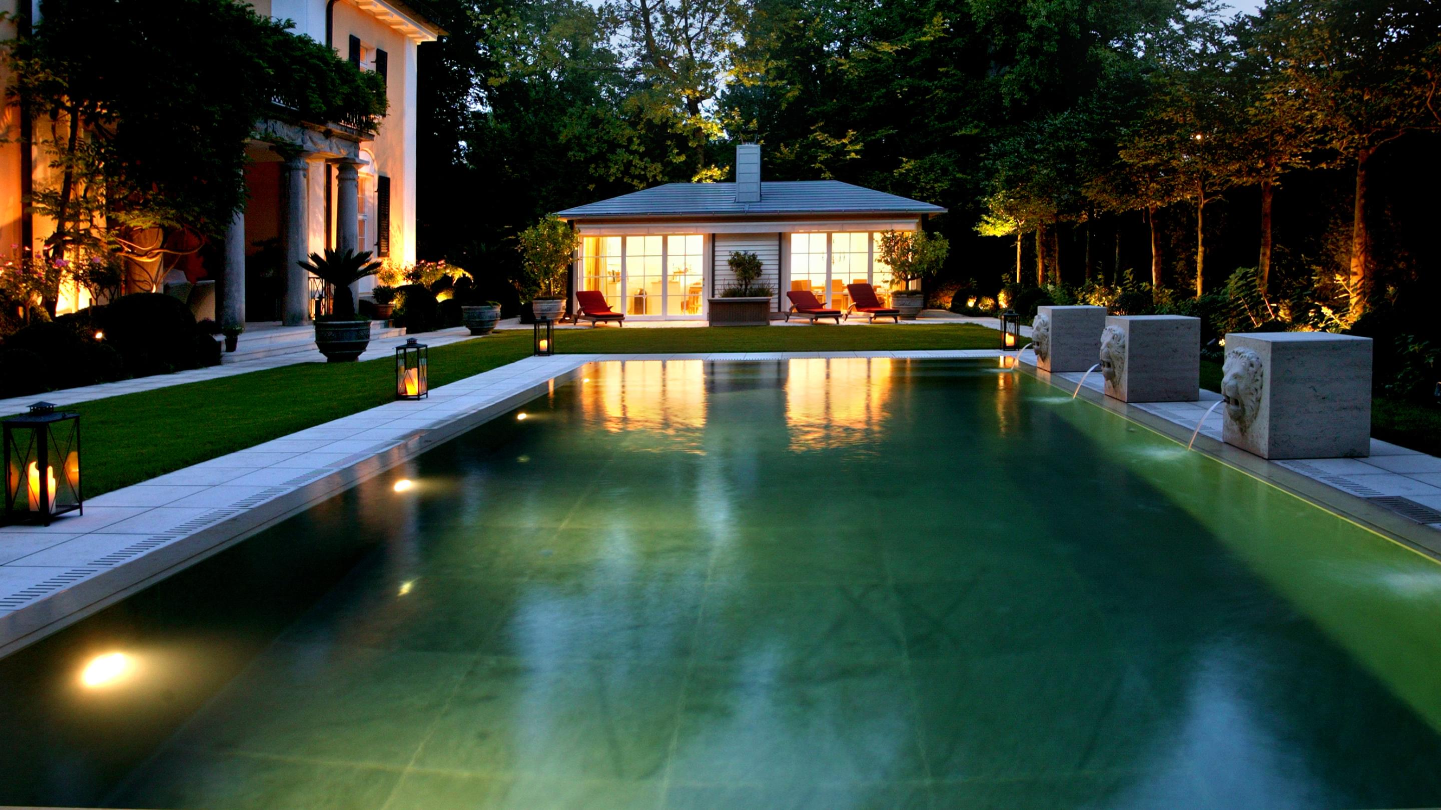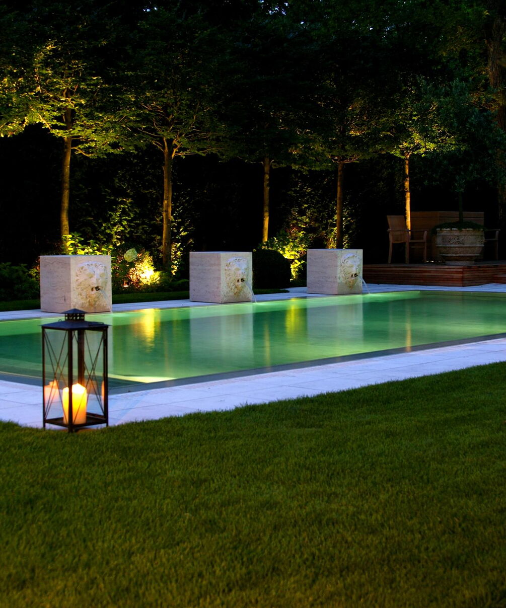 Het Zwitserse graniet waarmee de betonnen kuip is bekleed, zorgt voor een kristalhelder, turquoise oppervlak. Een bijzondere blikvanger zorgt ervoor dat het zwembad perfect past in de statige omgeving: waterspuwende stenen leeuwen sieren de lange zijde van het bassin.
