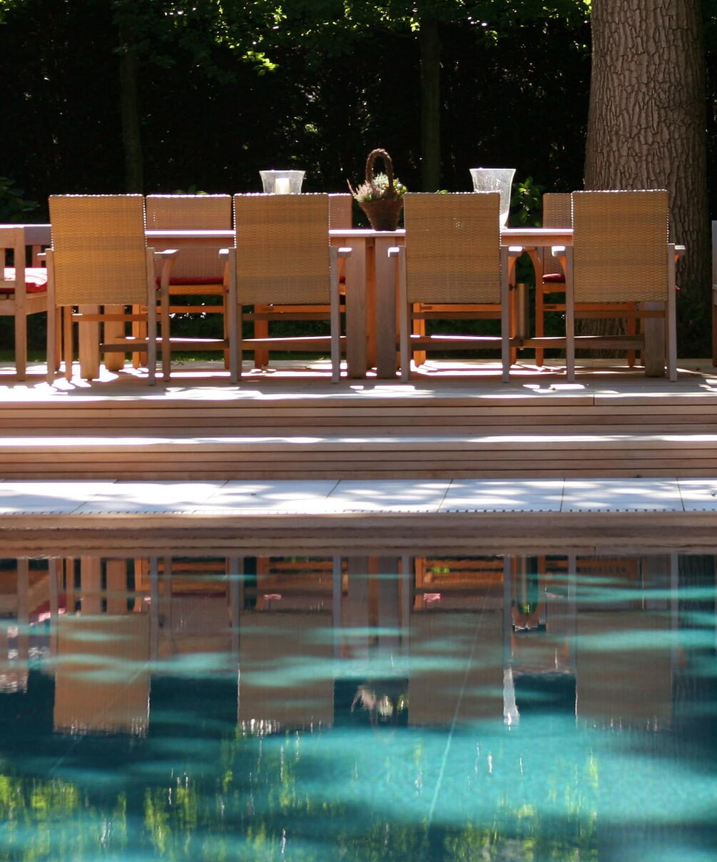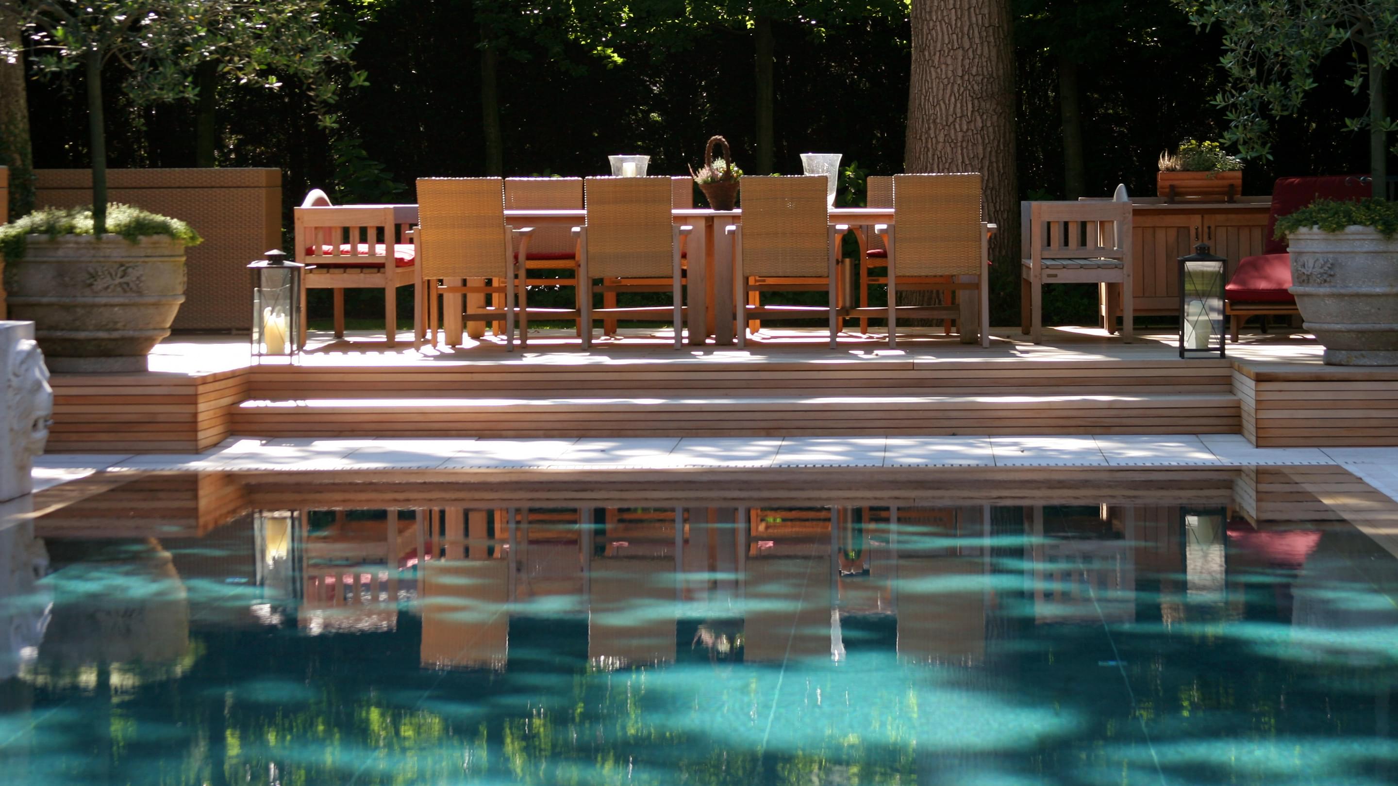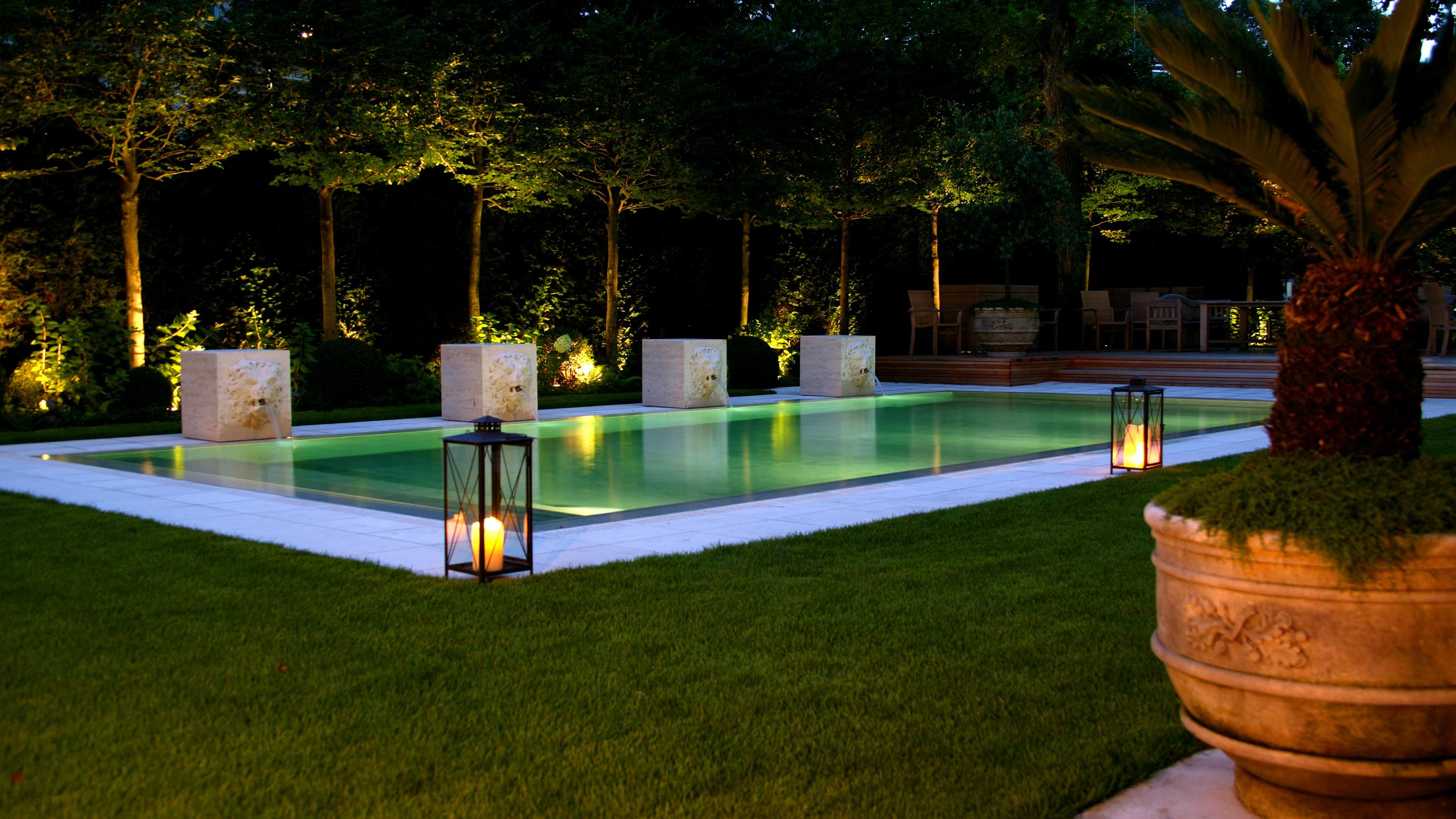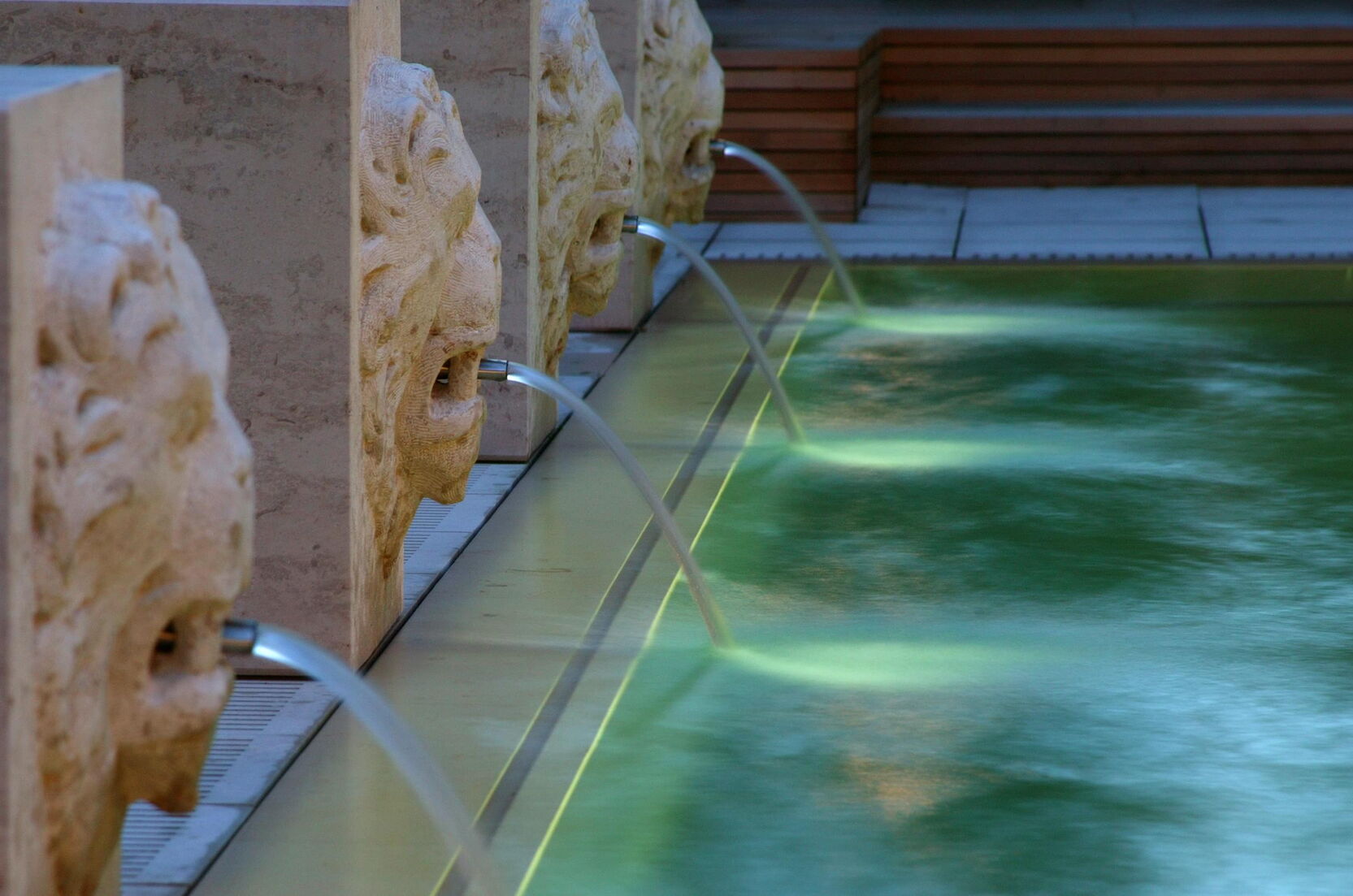 Het Zwitserse graniet waarmee de betonnen kuip is bekleed, zorgt voor een kristalhelder, turquoise oppervlak. Een bijzondere blikvanger zorgt ervoor dat het zwembad perfect past in de statige omgeving: waterspuwende stenen leeuwen sieren de lange zijde van het bassin.