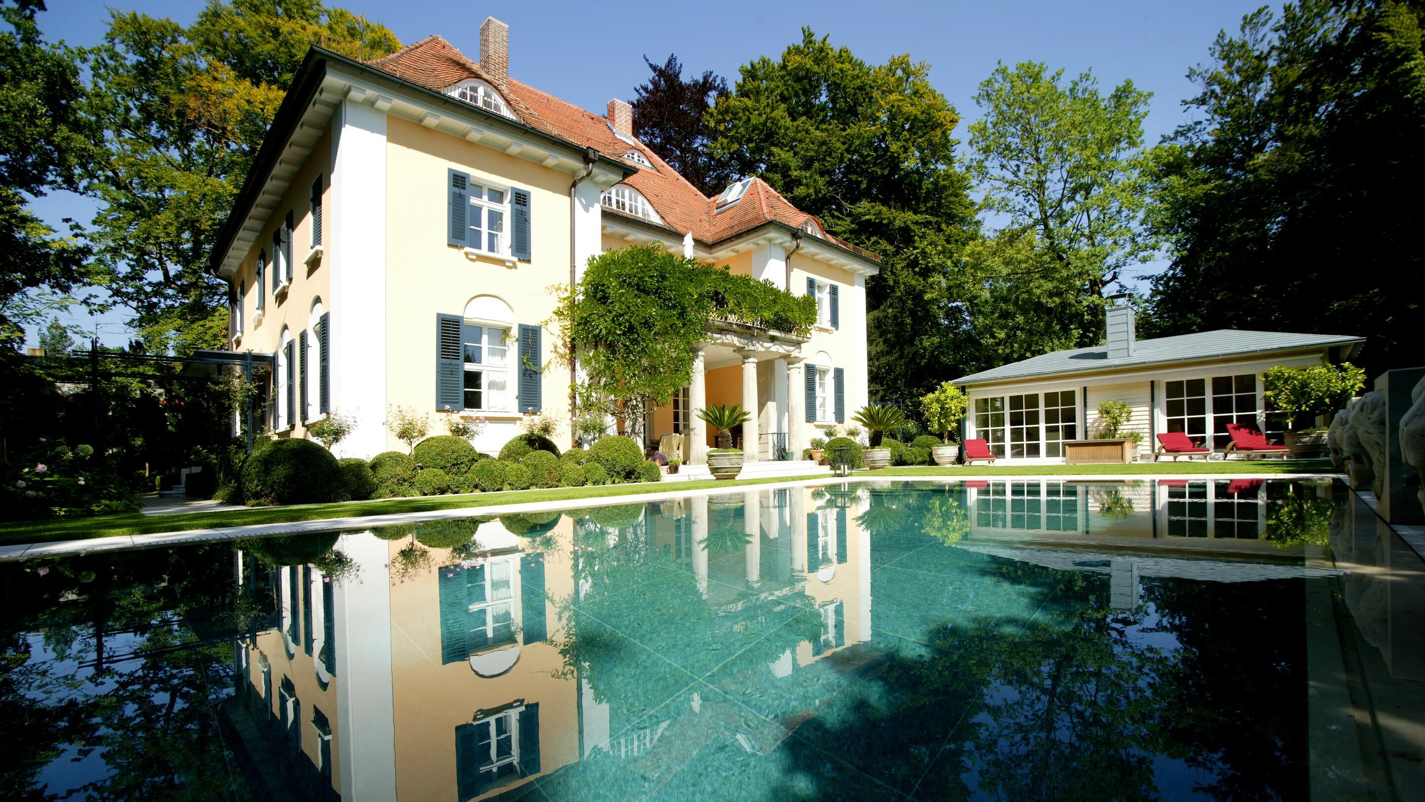 Het frame van het eenvoudige, 13,5 m lange en bijna 5 m brede zwembad bestaat uit lichtgrijze kalksteen, die harmonieert met de gevel van de Münchense villa uit het begin van de vorige eeuw.