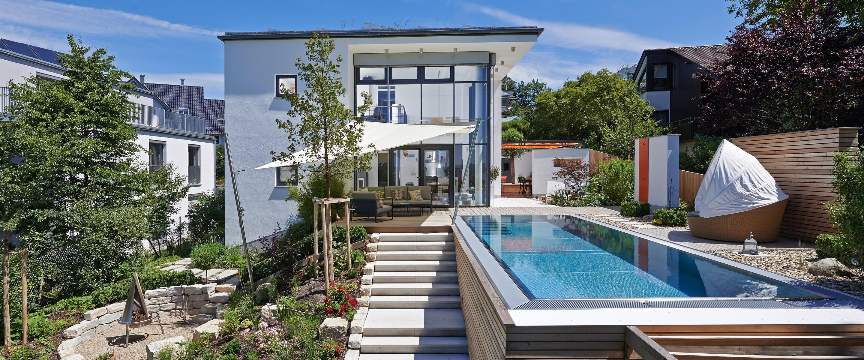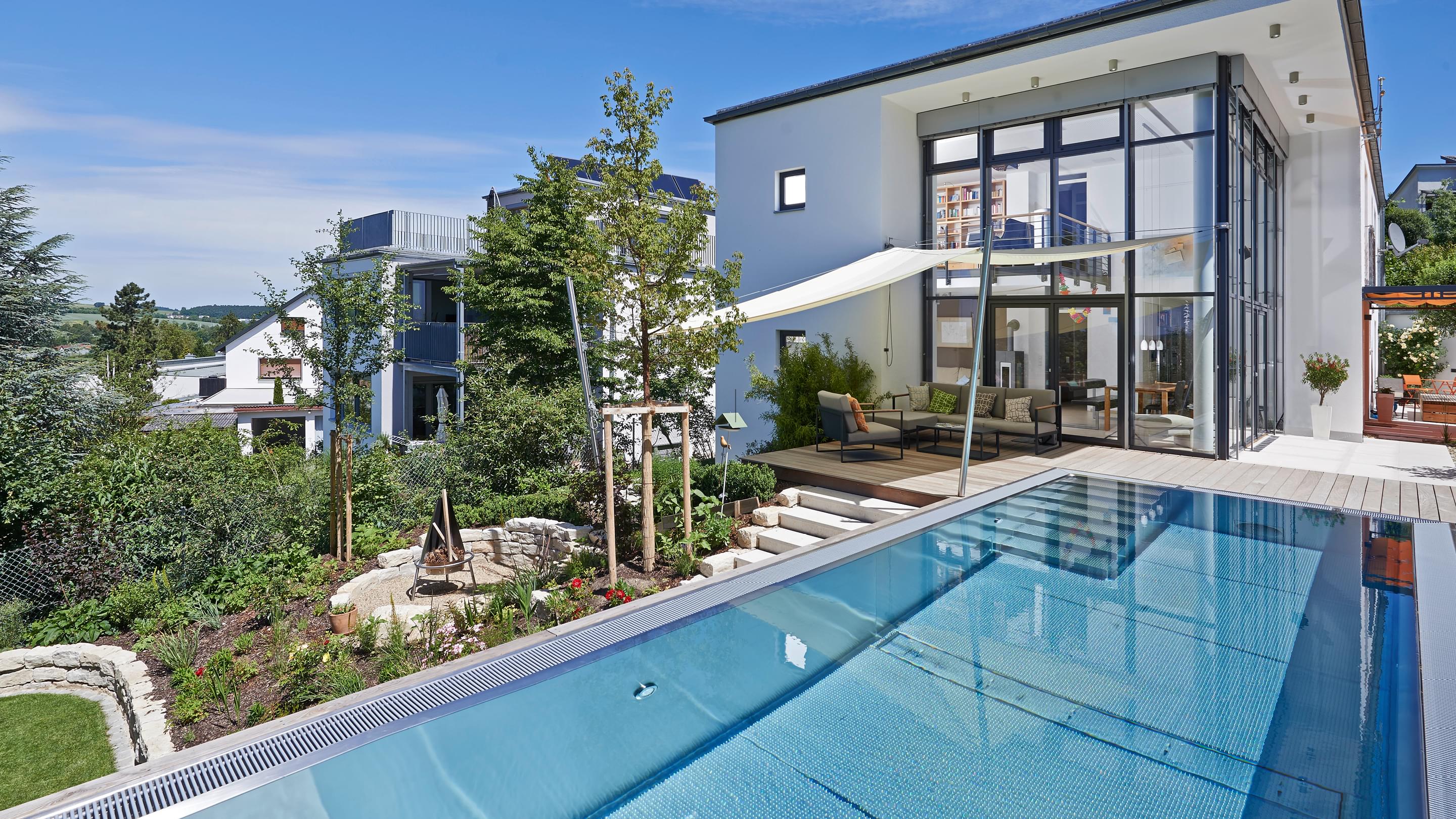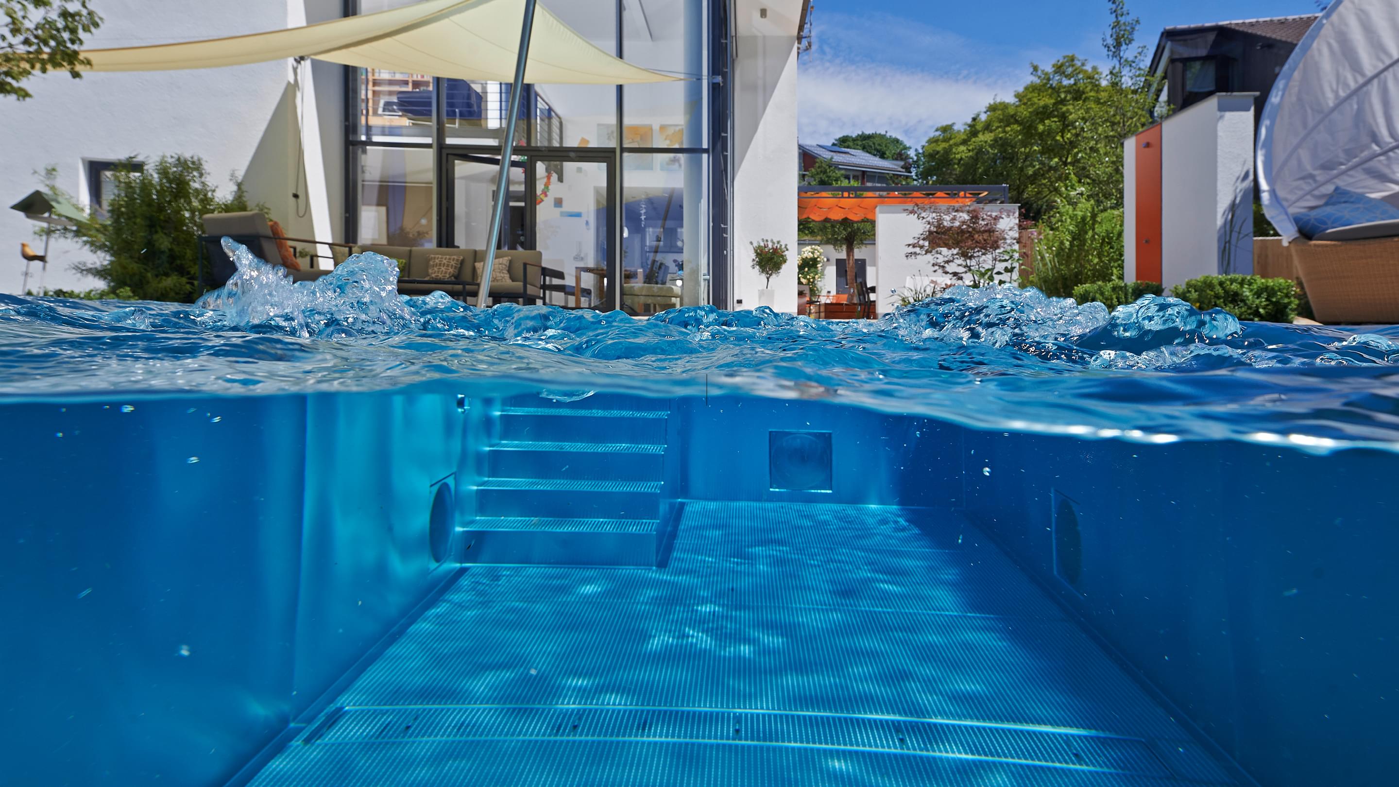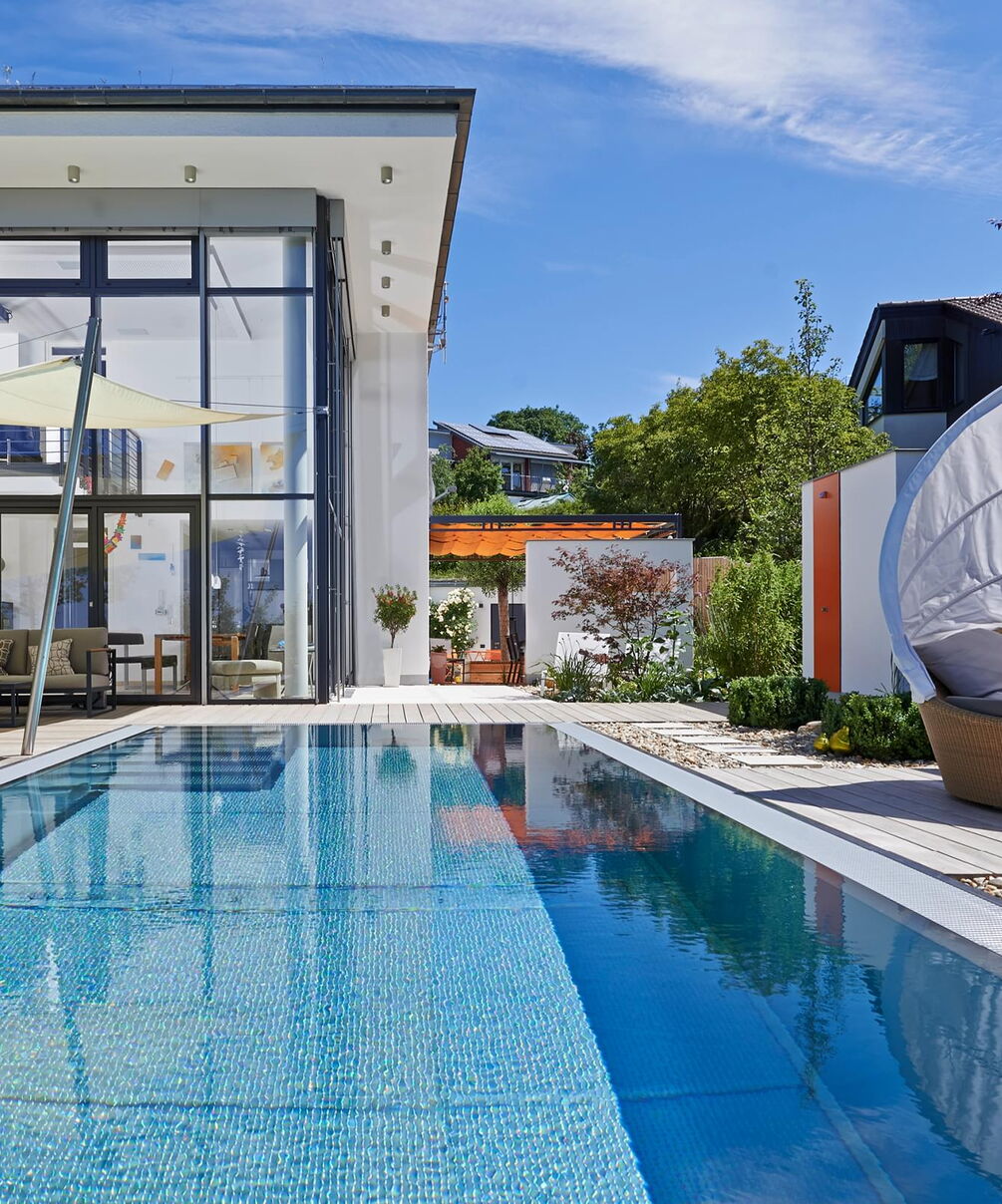 Het 32 m² grote buitenzwembad is ontworpen als verlengstuk van de woonruimte en steekt als een rechthoekig blok uit in de steil aflopende tuin. Sportief zwemplezier in het bassin met Ospa-LED-onderwaterspotten mogelijk, een krachtige Ospa-Powerswim-3-tegenstroominstallatie. Onder water zorgt een Ospa-filterinstallatie EcoClean op energiezuinige wijze voor kristalhelder water, terwijl een eveneens geïntegreerde Ospa-BlueClear® desinfecteert met milieuvriendelijk keukenzout en verrijkt het zwemwater bovendien met zuurstof. Ook de besturing van de zwembadtechnologie is volledig up-to-date: De bediening van de Ospa-BlueControl® III Web via een tablet met touchscreen is voor de vaak thuiswerkende bouwheer net zo eenvoudig en ontspannend als het verfrissende water zelf.