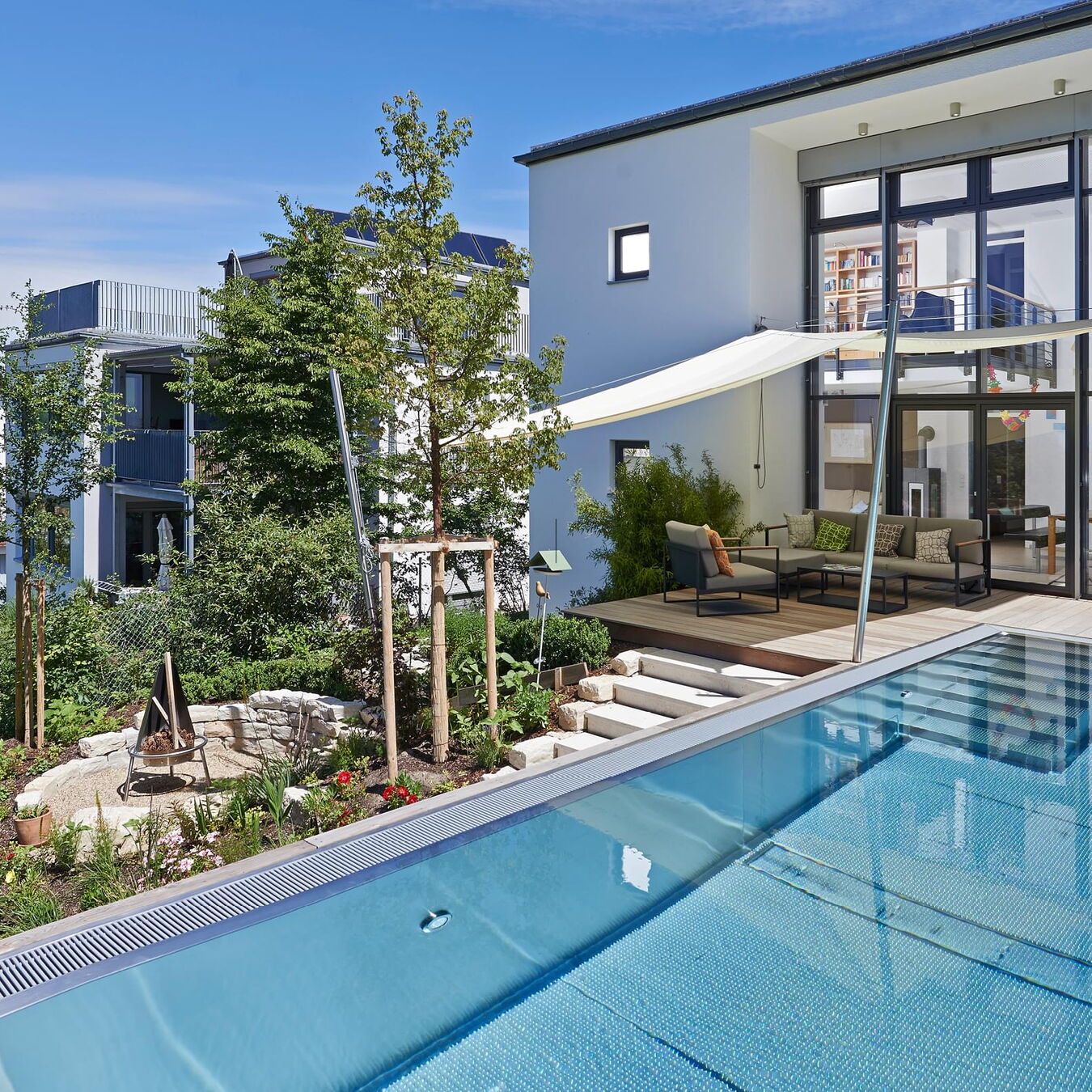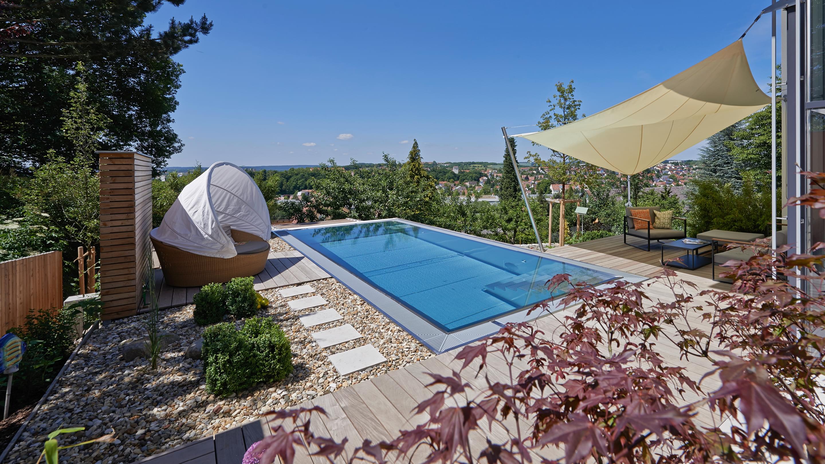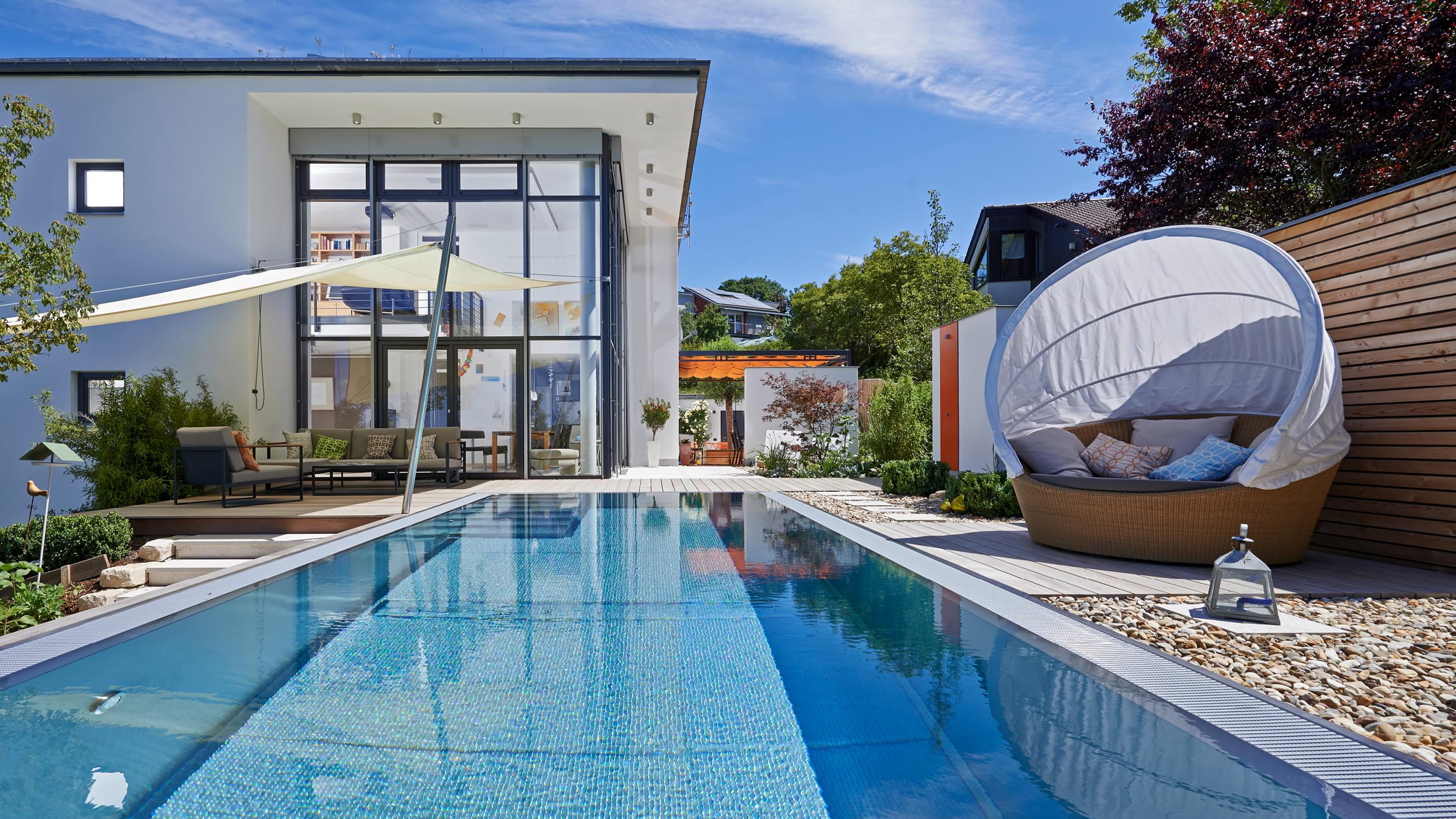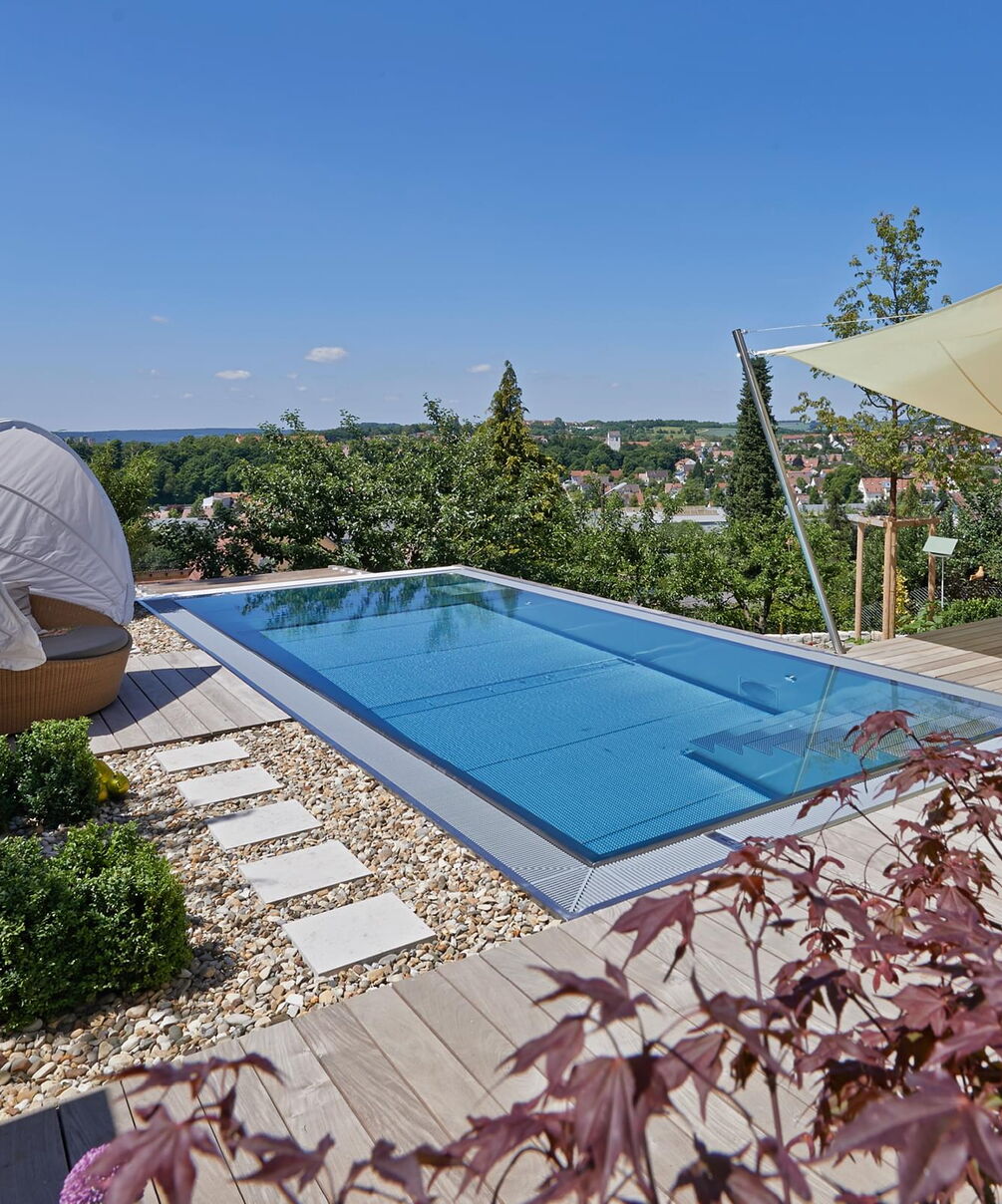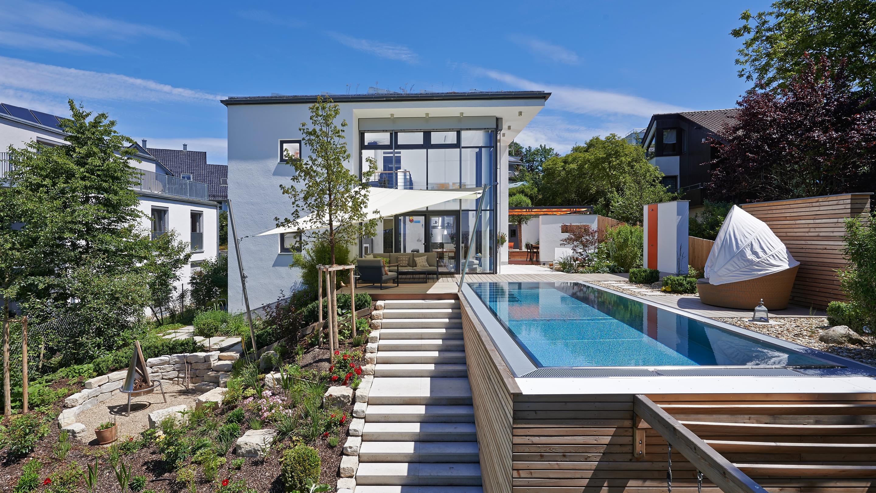 Het 32 m² grote buitenzwembad is ontworpen als verlengstuk van de woonruimte en steekt als een rechthoekig blok uit in de steil aflopende tuin. Sportief zwemplezier in het bassin met Ospa-LED-onderwaterspotten mogelijk, een krachtige Ospa-Powerswim-3-tegenstroominstallatie. Onder water zorgt een Ospa-filterinstallatie EcoClean op energiezuinige wijze voor kristalhelder water, terwijl een eveneens geïntegreerde Ospa-BlueClear® desinfecteert met milieuvriendelijk keukenzout en verrijkt het zwemwater bovendien met zuurstof. Ook de besturing van de zwembadtechnologie is volledig up-to-date: De bediening van de Ospa-BlueControl® III Web via een tablet met touchscreen is voor de vaak thuiswerkende bouwheer net zo eenvoudig en ontspannend als het verfrissende water zelf.