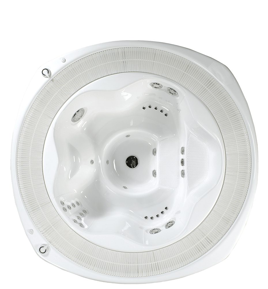 Met ventilator, Superjet-pompen en onderwaterspot. Inbouwklare, eendelige bassins met rondomlopende zitbank en trap, met geprofileerd oppervlak van diepgetrokken sanitair acryl, versterkt met glasvezel en rondom geïsoleerd met PU-hardschuim. Inclusief totale lediging voor bassins en luchtkanalen en verstelbaar draagframe. Alle ingebouwde componenten zijn voor het gemak vooraf gemonteerd en voorbekabeld. Overloopgoot eveneens van sanitair acryl, versterkt met glasvezel, uit één stuk met de whirlpool vervaardigd en met onderbouwde verstevigingsstijlen. Gootrooster van PVC, wit.