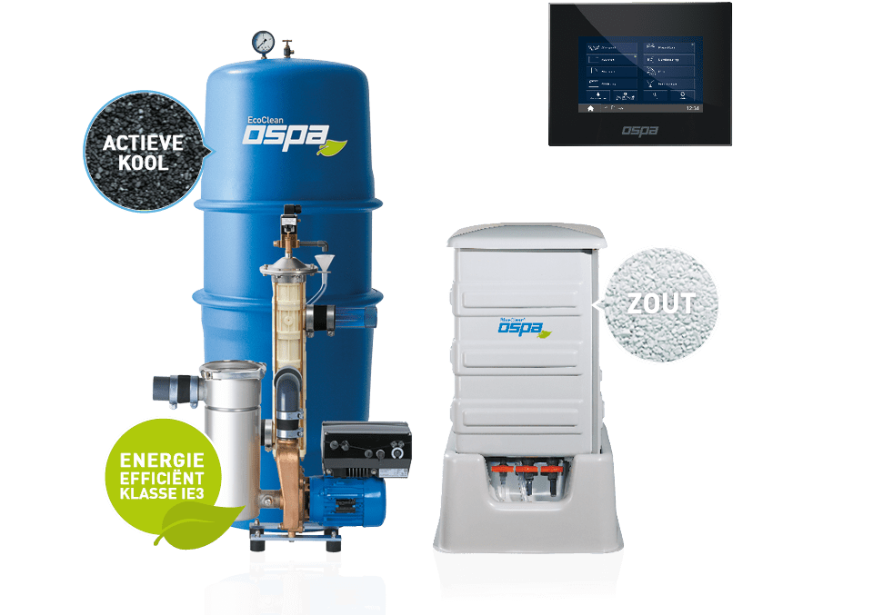 Natuurlijk keukenzout en zeer effectieve actieve kool vormen de sleutel tot een perfecte waterkwaliteit die voldoet aan de hoogste normen. De perfect op elkaar afgestemde technologie, bestaande uit Ospa BlueControl, Ospa filter SuperS en Ospa BlueClear desinfectie, zorgt voor een onmiskenbare zwemervaring.